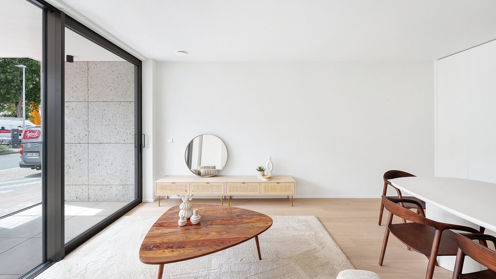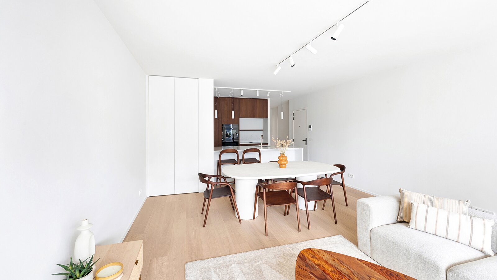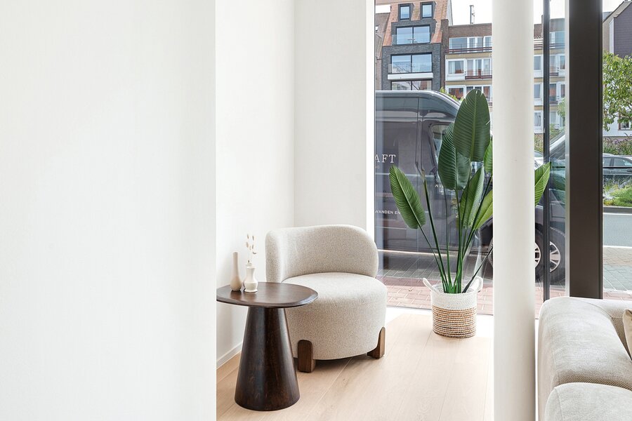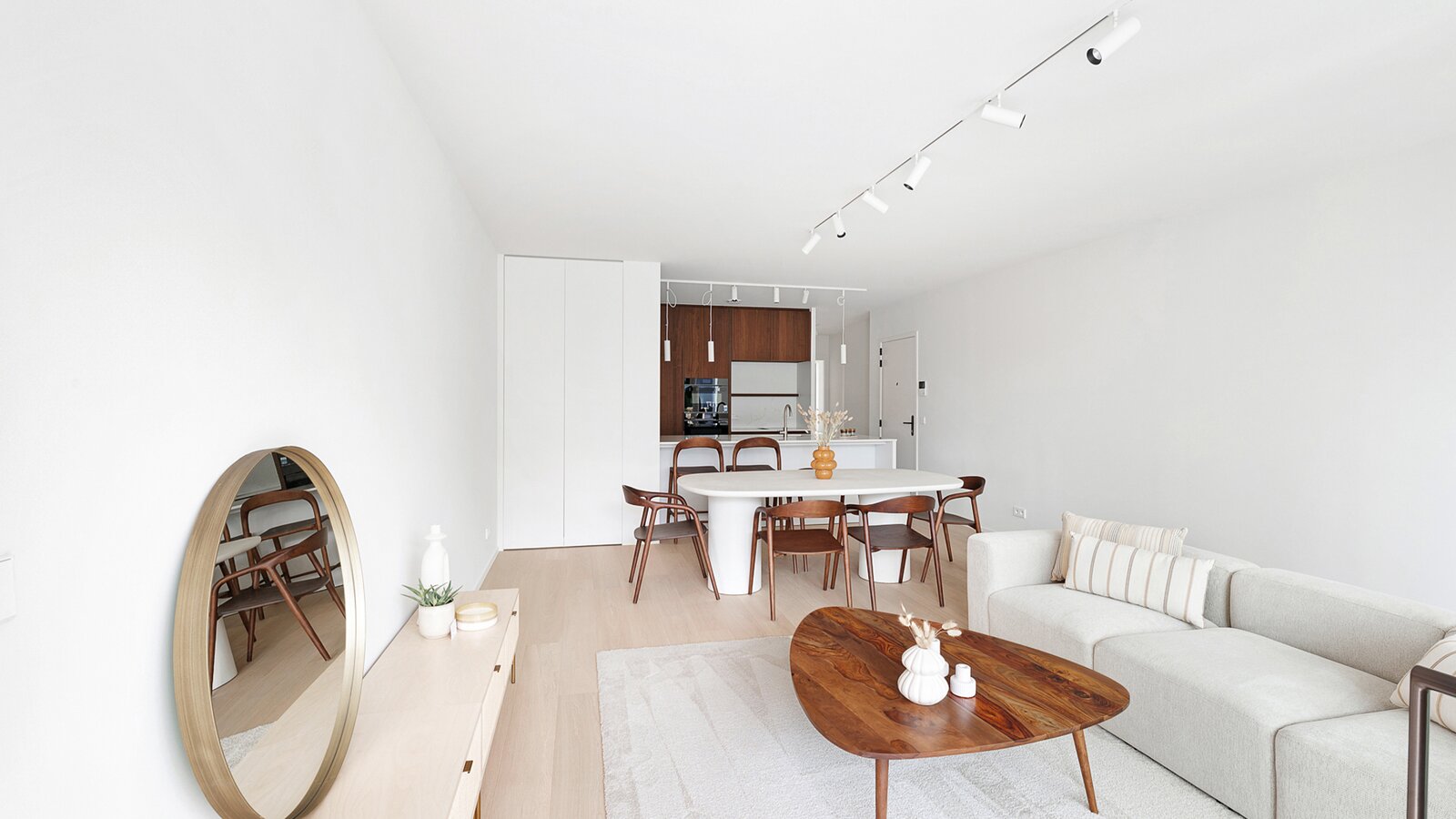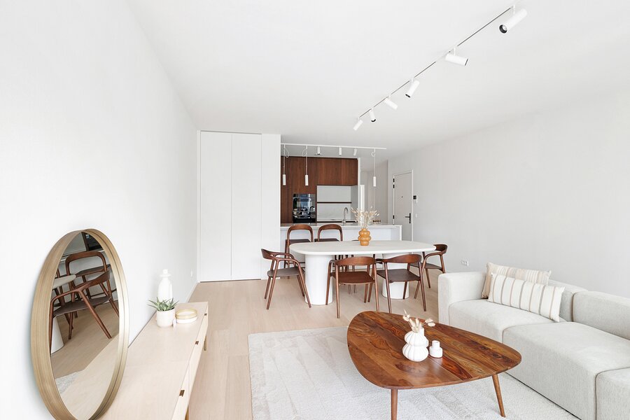 De leefruimte geniet van een mooie natuurlijke lichtinval en sluit naadloos aan op het aangename terras aan de voorzijde van het appartement. De moderne, smaakvolle keuken is volledig uitgerust en vormt een elegant geheel met de leefruimte.