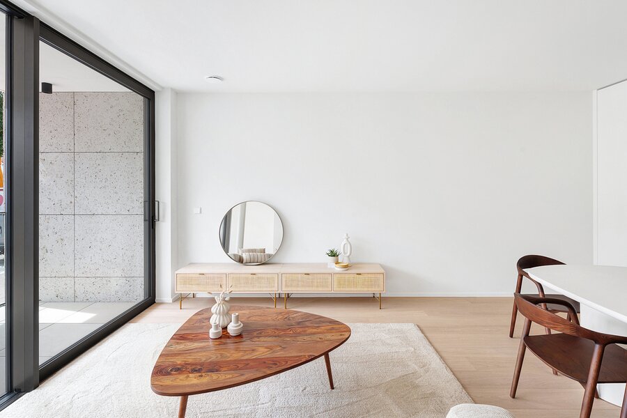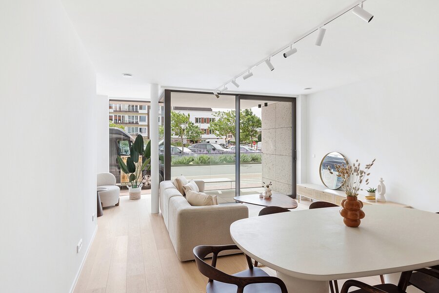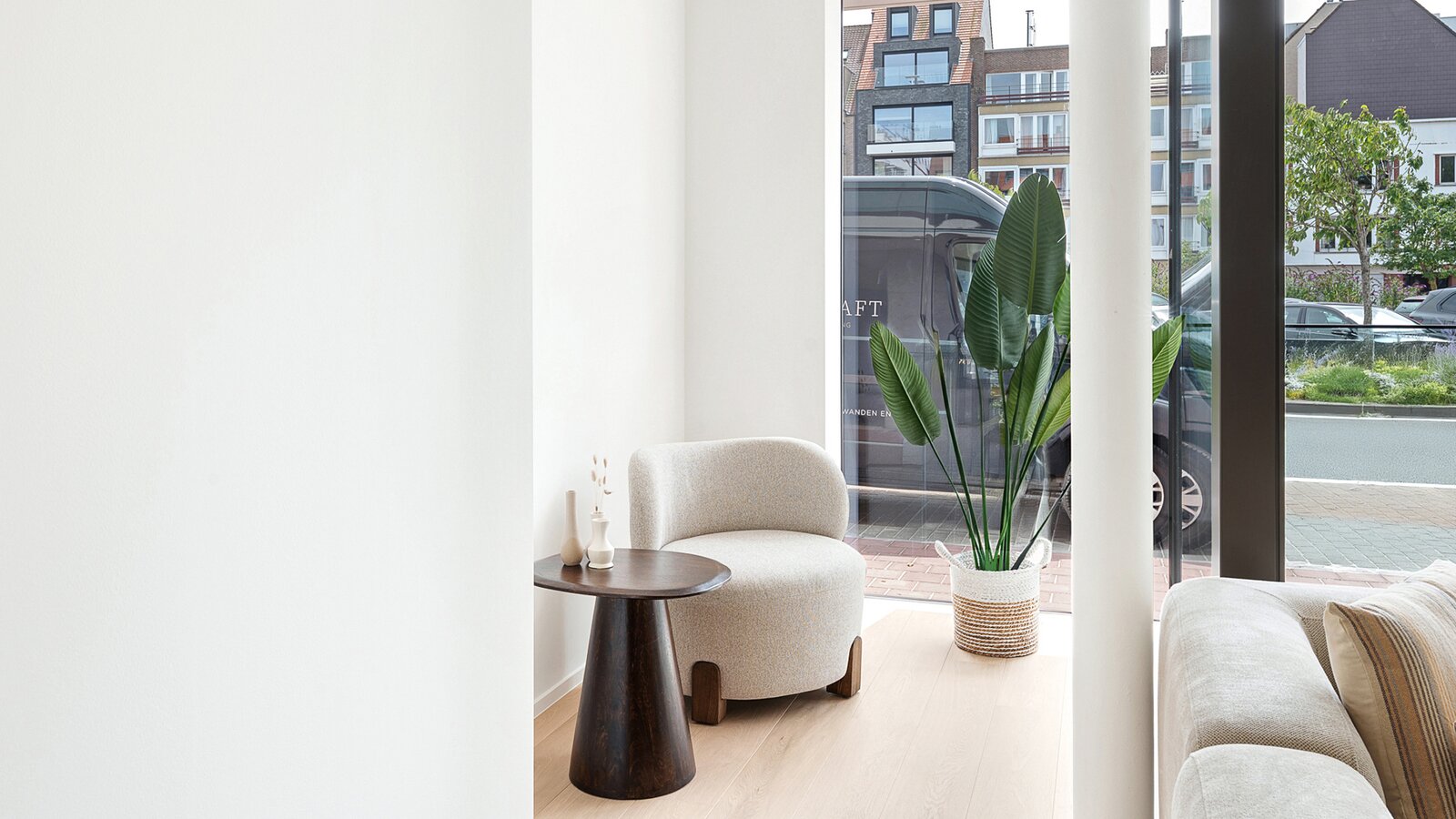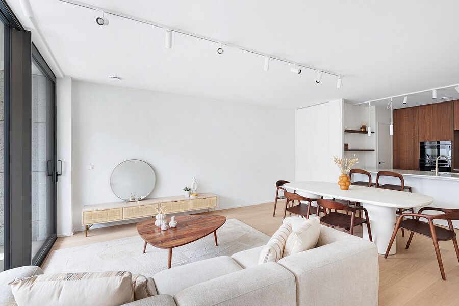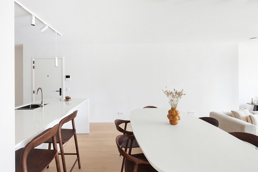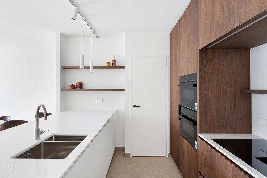De leefruimte geniet van een mooie natuurlijke lichtinval en sluit naadloos aan op het aangename terras aan de voorzijde van het appartement. De moderne, smaakvolle keuken is volledig uitgerust en vormt een elegant geheel met de leefruimte.