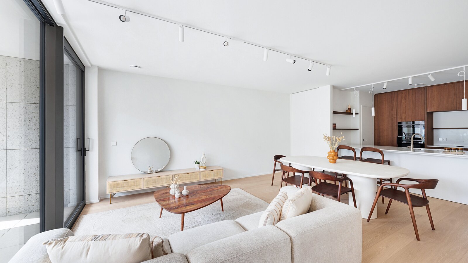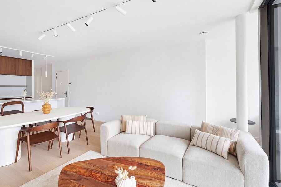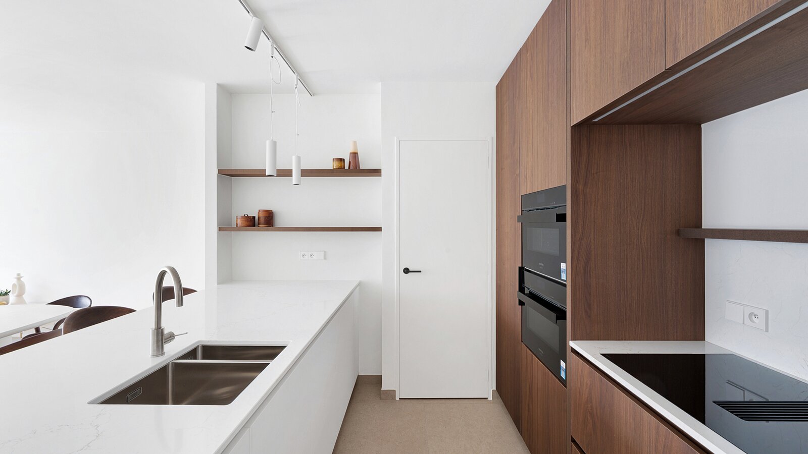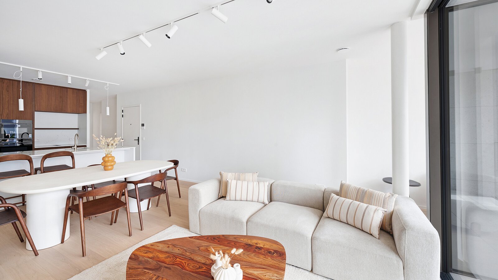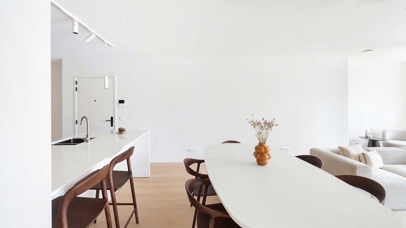De leefruimte geniet van een mooie natuurlijke lichtinval en sluit naadloos aan op het aangename terras aan de voorzijde van het appartement. De moderne, smaakvolle keuken is volledig uitgerust en vormt een elegant geheel met de leefruimte.