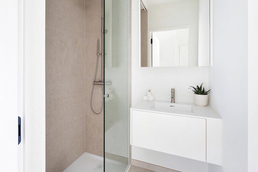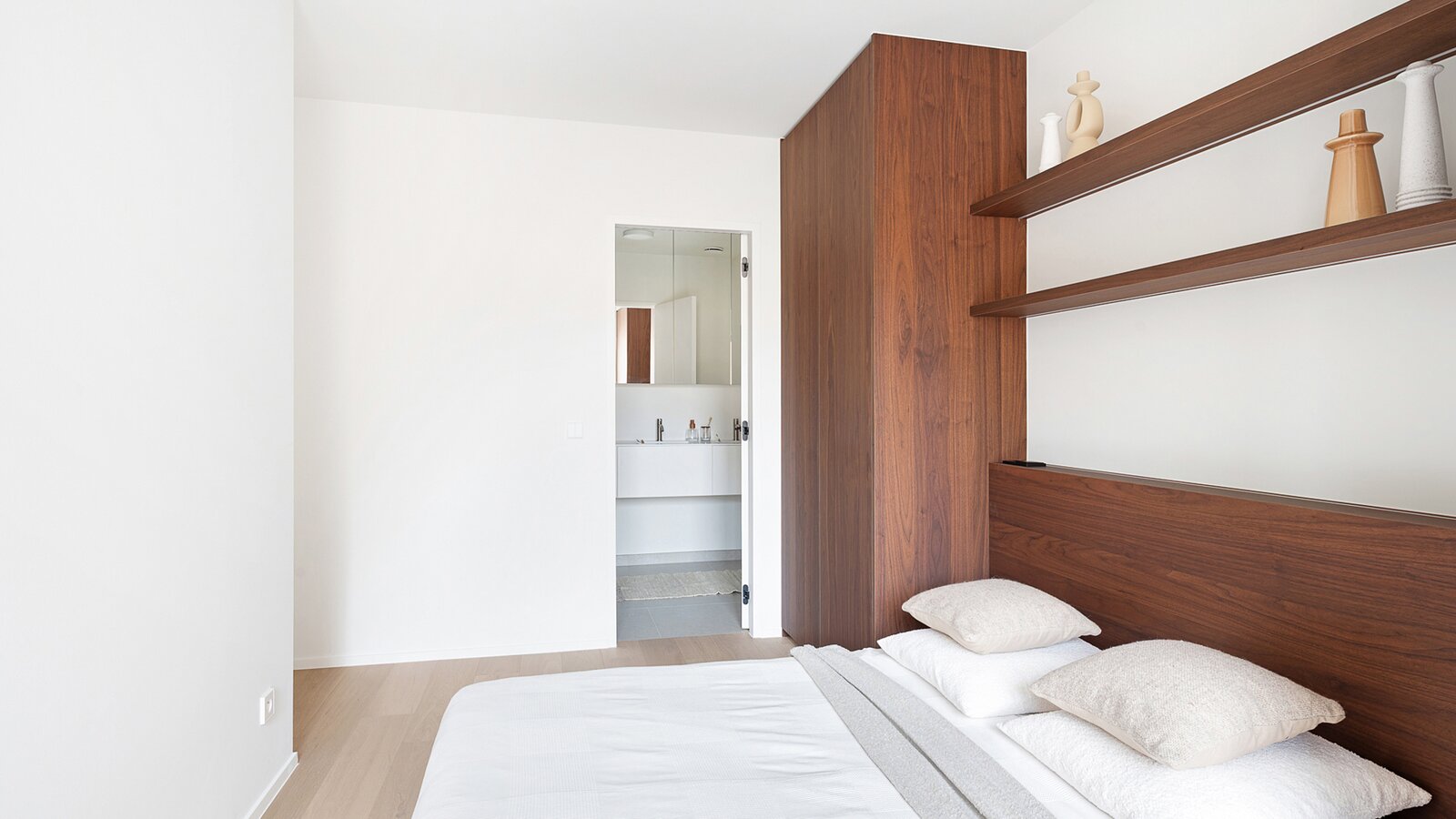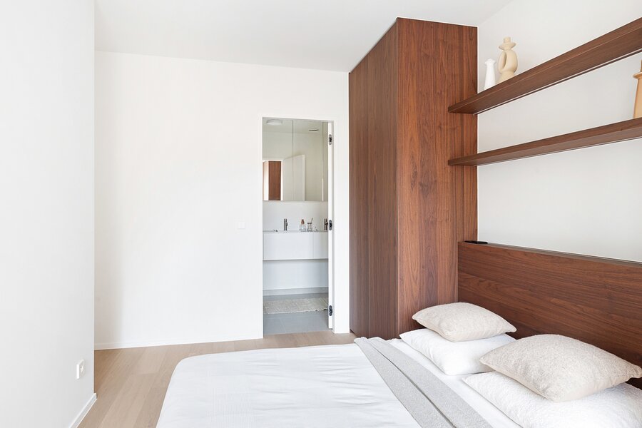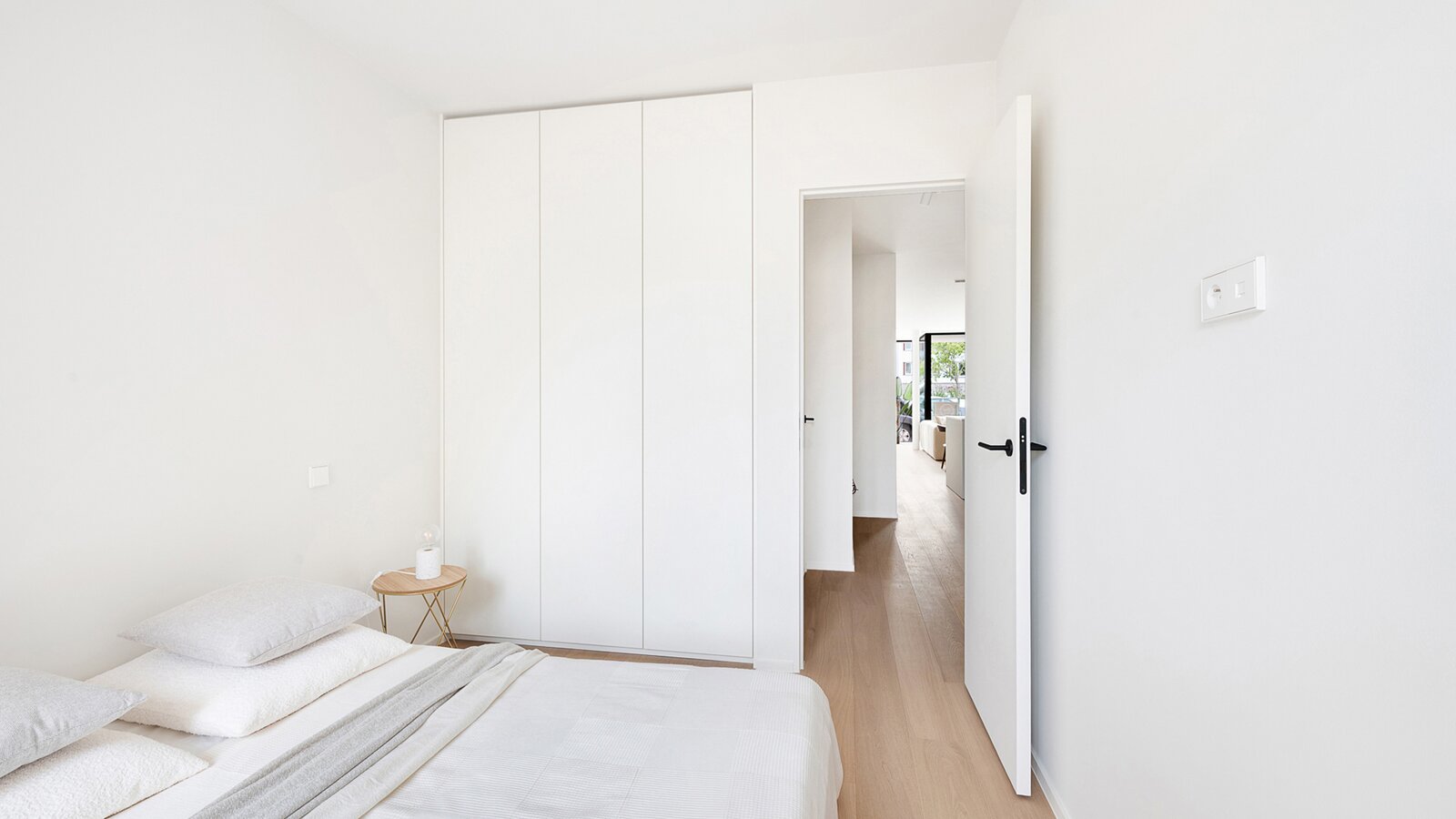 Achteraan bevinden zich drie comfortabele slaapkamers. De master bedroom beschikt over ingemaakte kasten en een ensuite badkamer. Daarnaast zijn er nog twee slaapkamers en een aparte douchekamer, wat het appartement uitermate geschikt maakt voor gezinnen of gasten.