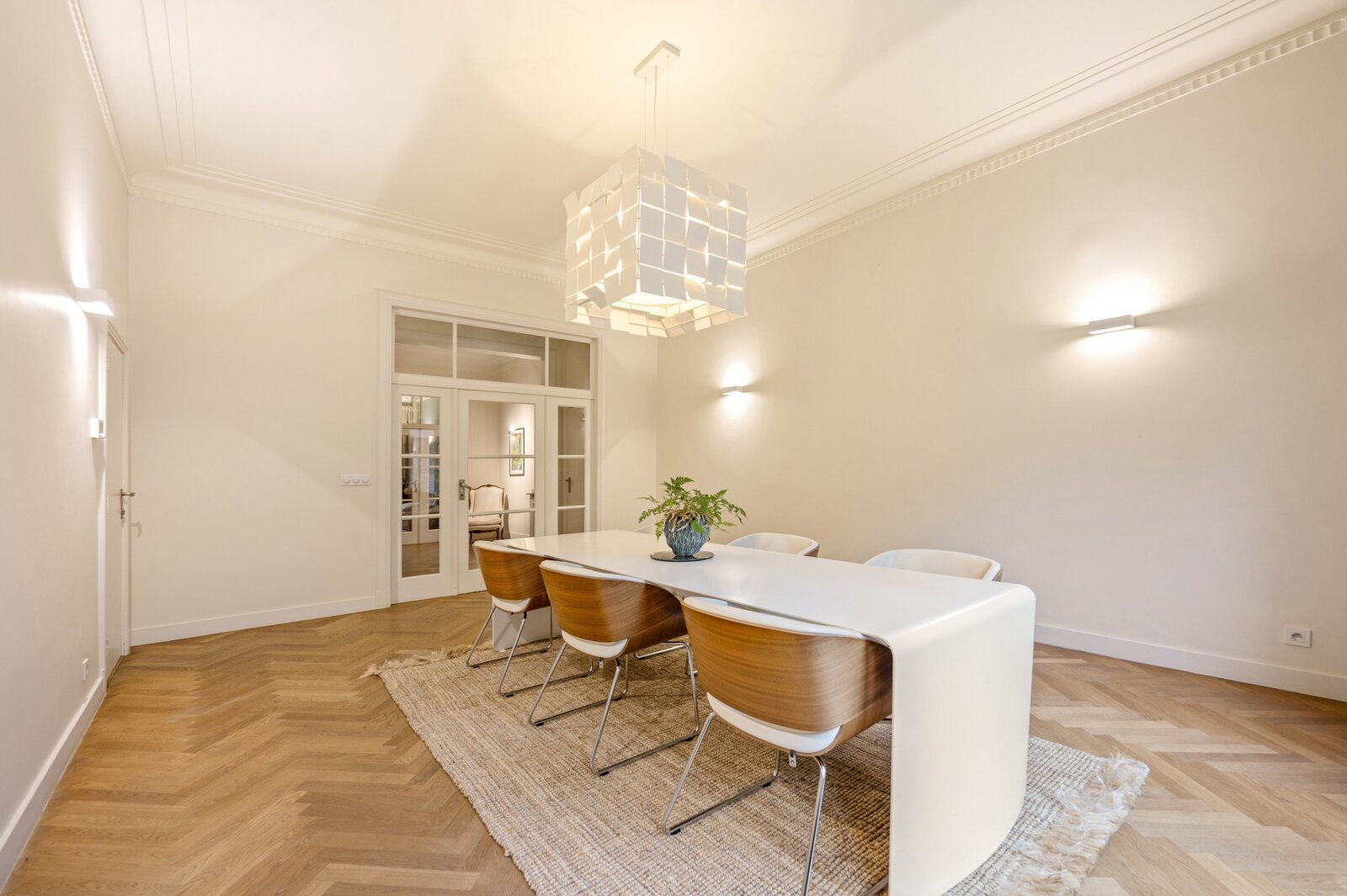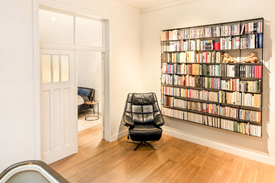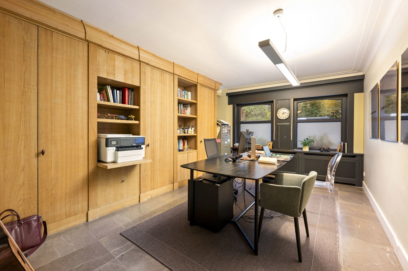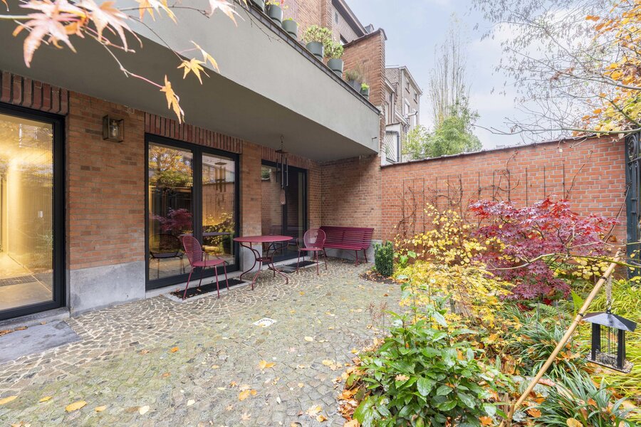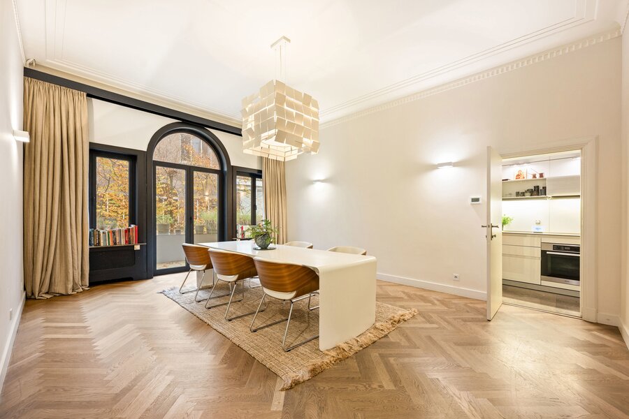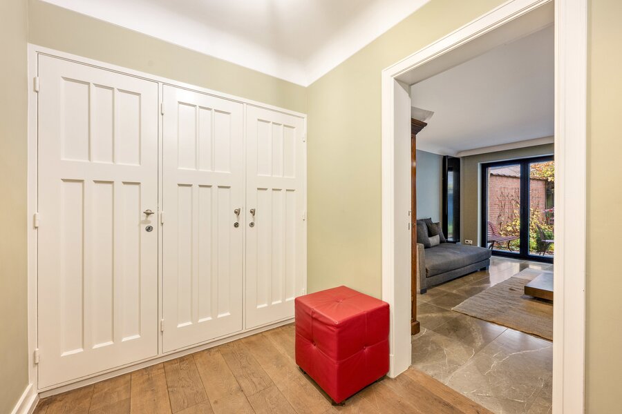 Bij het binnenkomen word je verwelkomd in een royale inkomhal die uitmondt in het imposante centrale trappenhuis, het kloppend hart van de woning. Op het gelijkvloers bevinden zich aan de voorzijde een elegante bureauruimte met maatwerk kasten, ideaal voor thuiswerk of praktijk. Aan de tuinzijde ligt een multifunctionele kamer met aansluitende douchekamer en een professionele keuken—perfect als gastenverblijf, kangoeroewoning of hobby-/wellnessruimte. De gezellige stadstuin met sfeerverlichting maakt het geheel compleet.