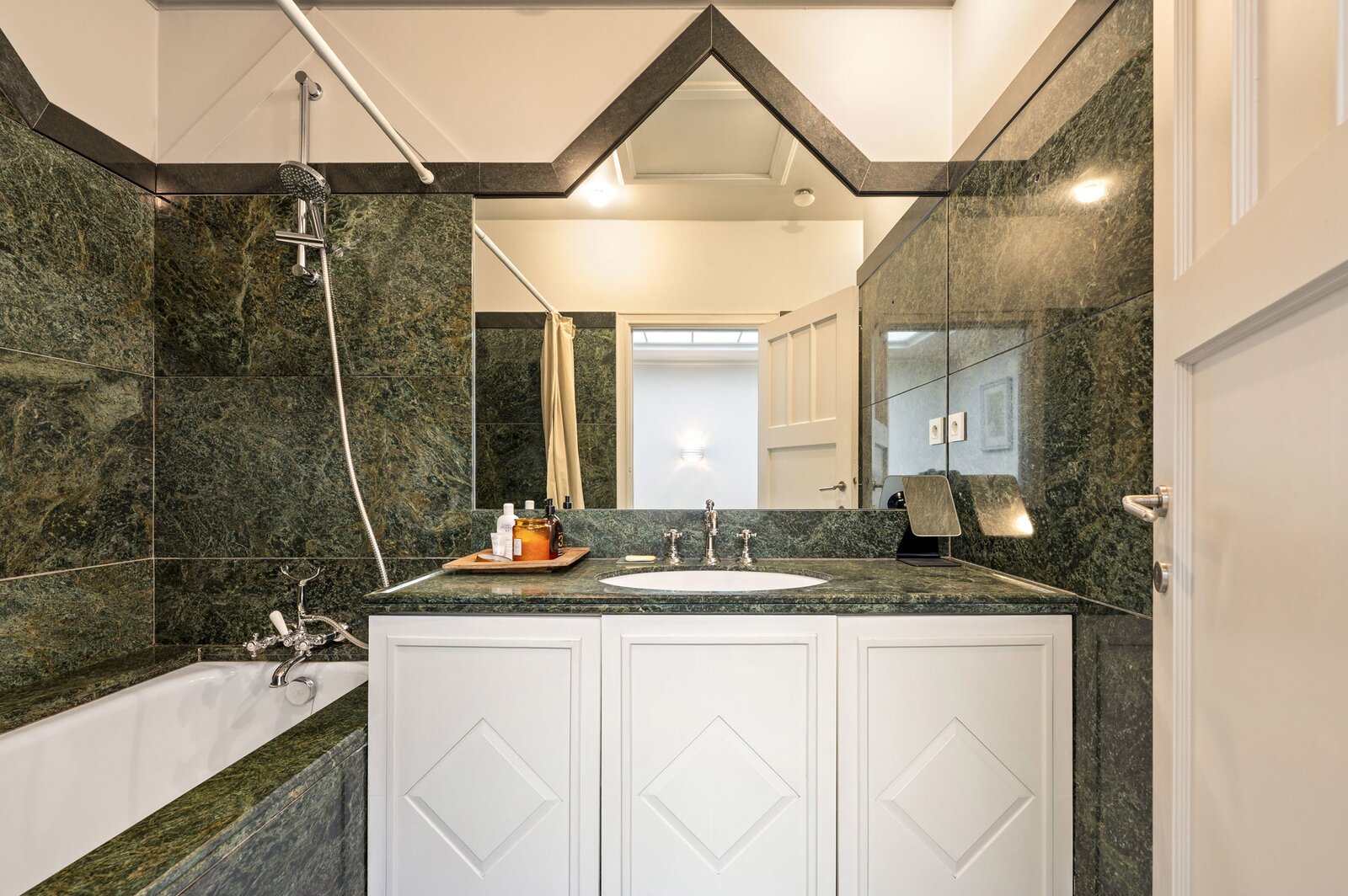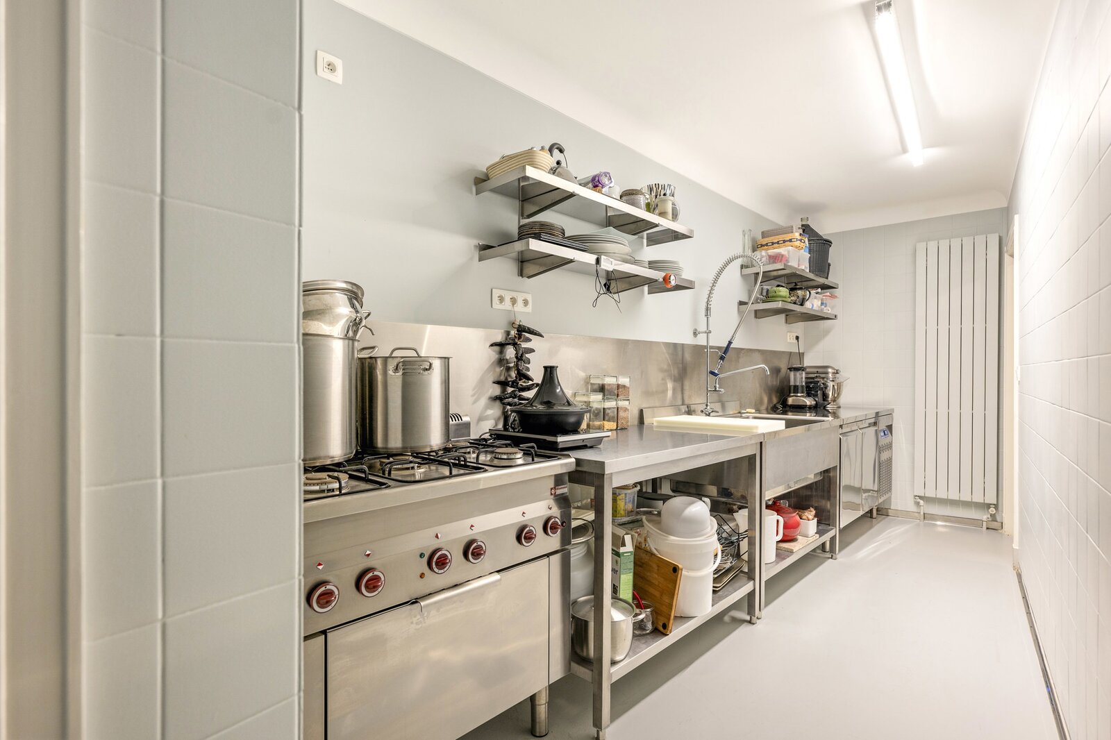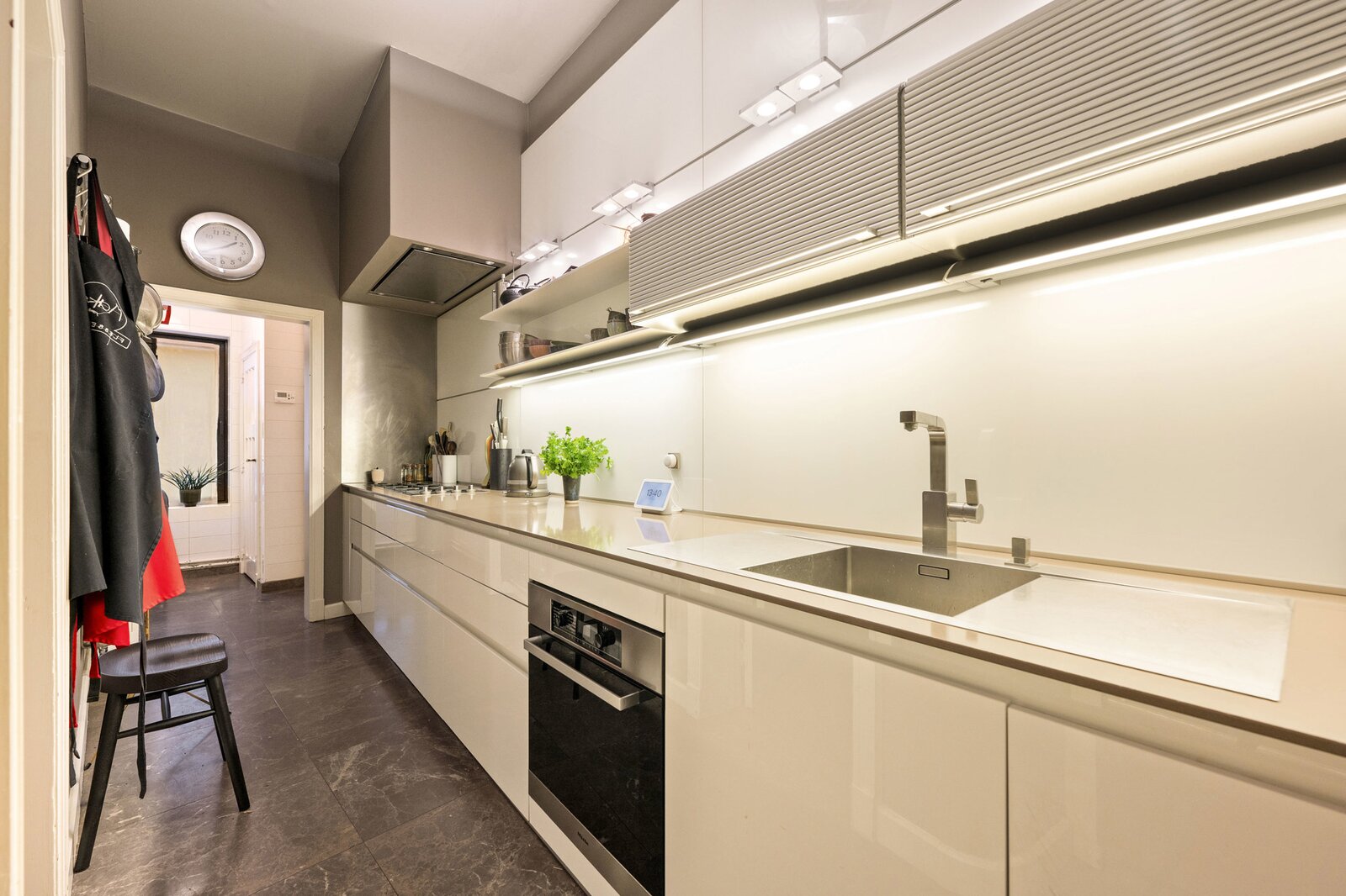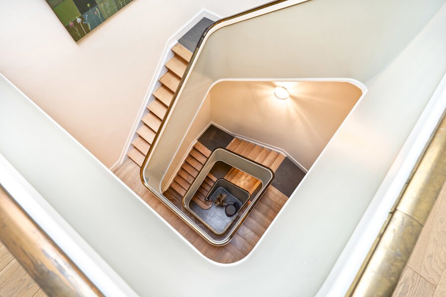 Bij het binnenkomen word je verwelkomd in een royale inkomhal die uitmondt in het imposante centrale trappenhuis, het kloppend hart van de woning. Op het gelijkvloers bevinden zich aan de voorzijde een elegante bureauruimte met maatwerk kasten, ideaal voor thuiswerk of praktijk. Aan de tuinzijde ligt een multifunctionele kamer met aansluitende douchekamer en een professionele keuken—perfect als gastenverblijf, kangoeroewoning of hobby-/wellnessruimte. De gezellige stadstuin met sfeerverlichting maakt het geheel compleet.