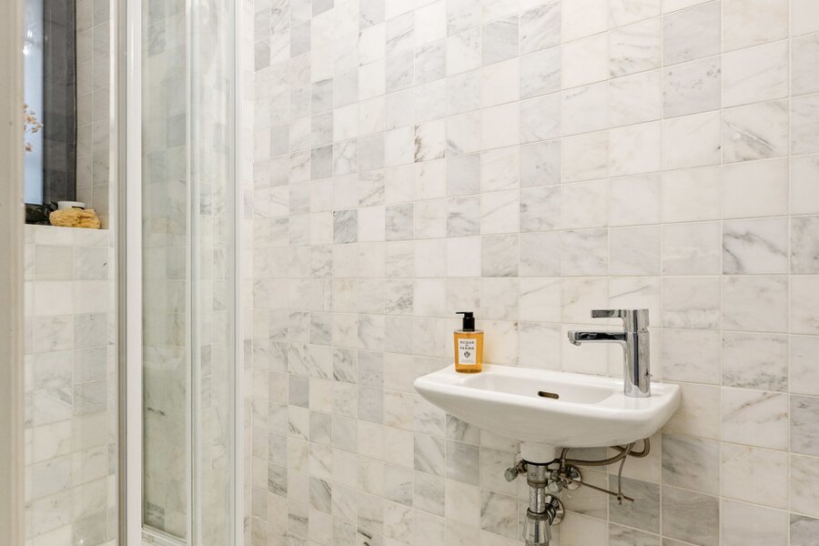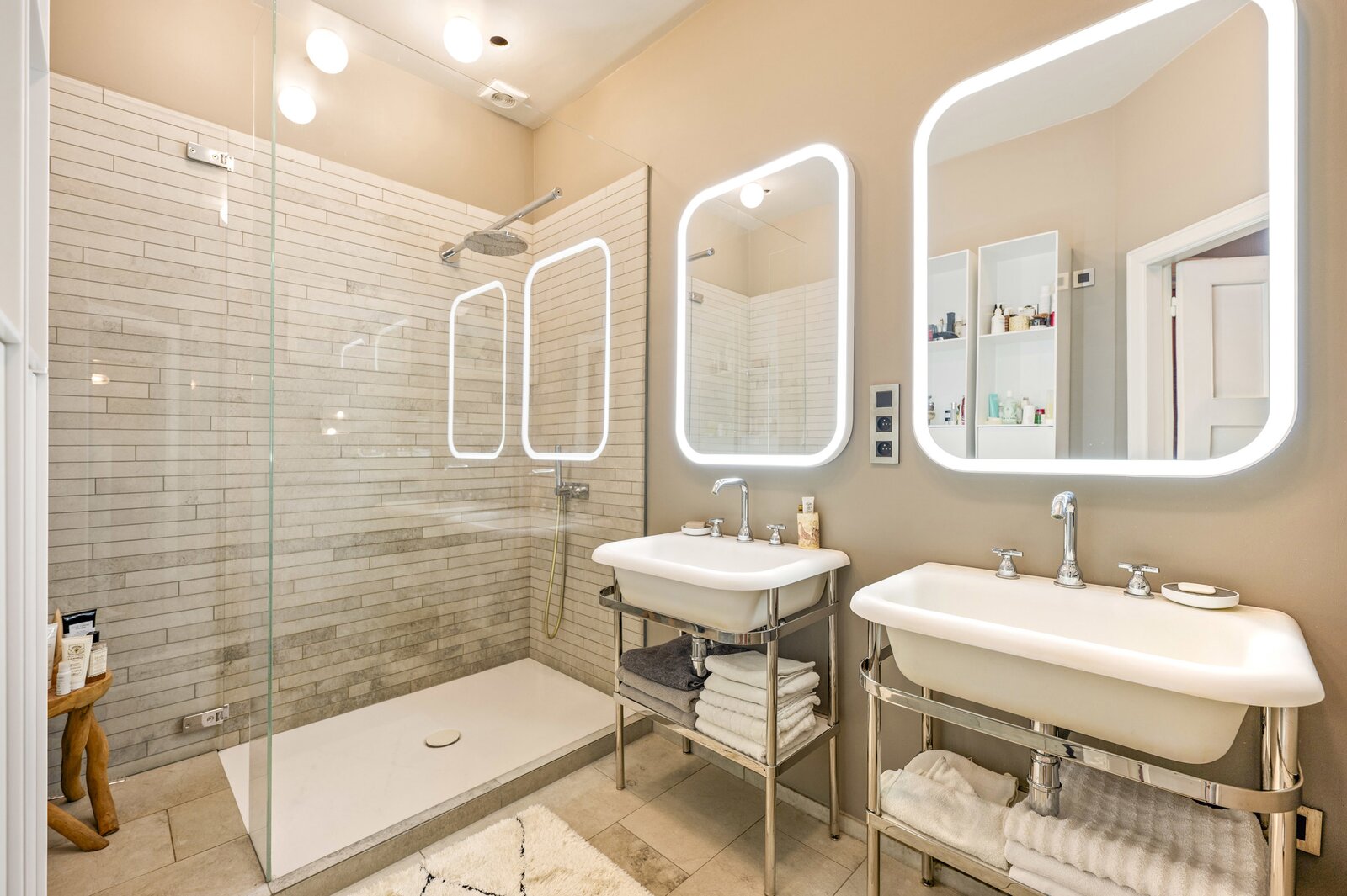 De tweede verdieping omvat een royale master bedroom met ingebouwde kasten en balkon. Aan de andere zijde vind je een tweede slaapkamer en een derde kamer die perfect dienstdoet als dressing of bureau. De moderne badkamer is ingericht met een inloopdouche en twee lavabomeubels van Agape. Het toilet is apart en beschikt over een handenwasser.