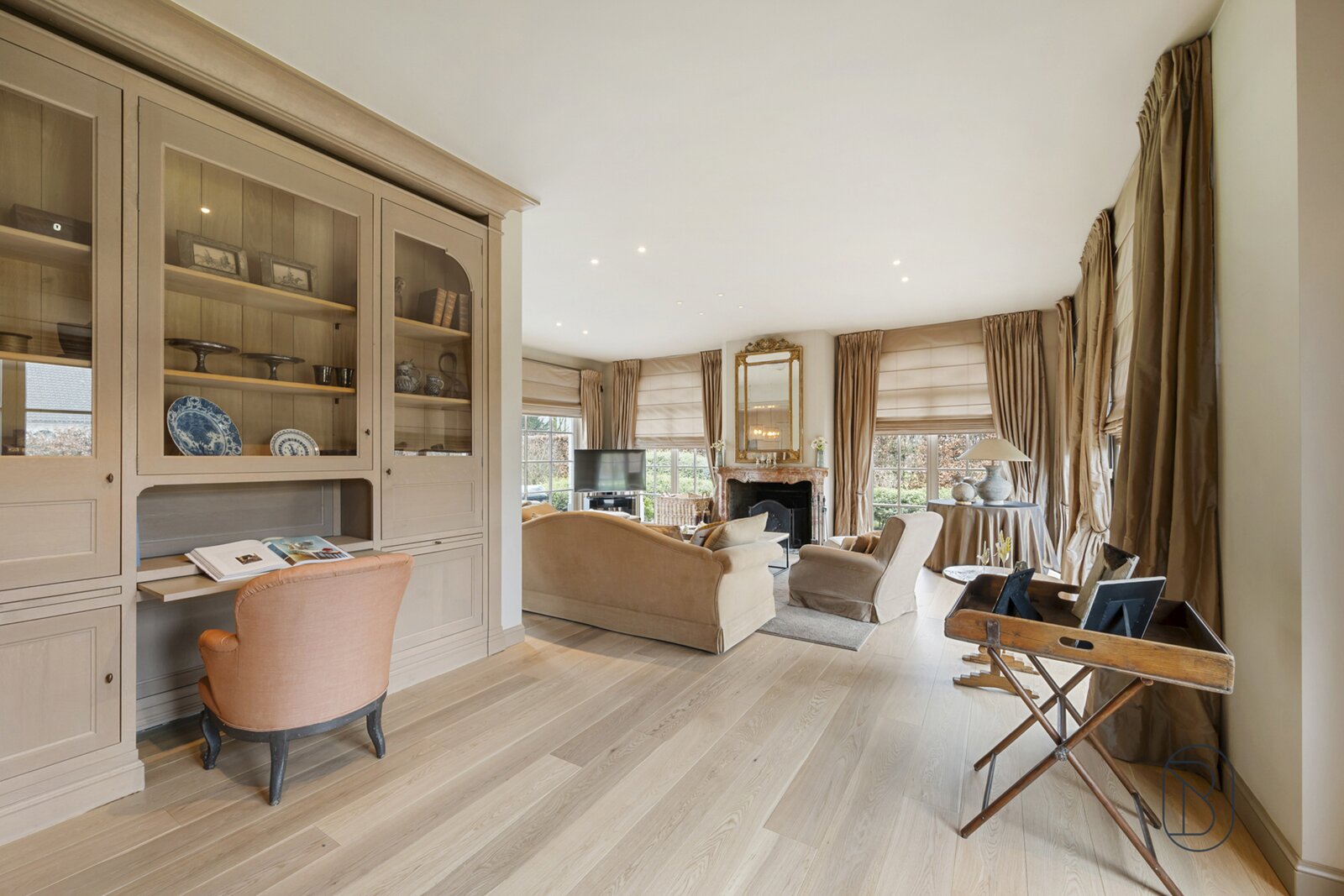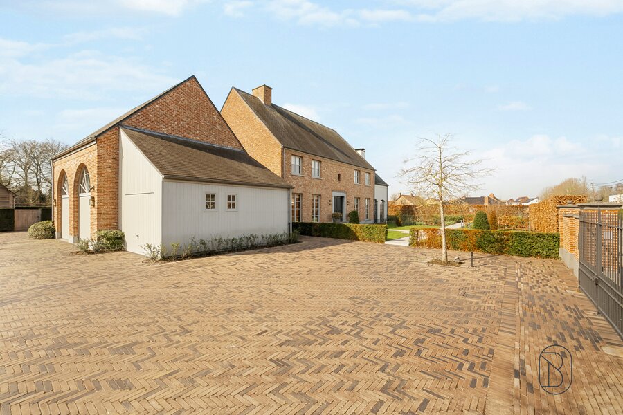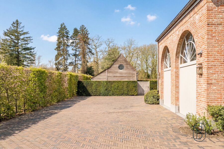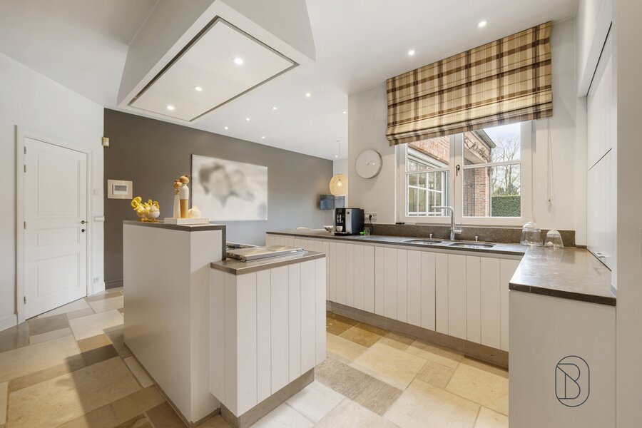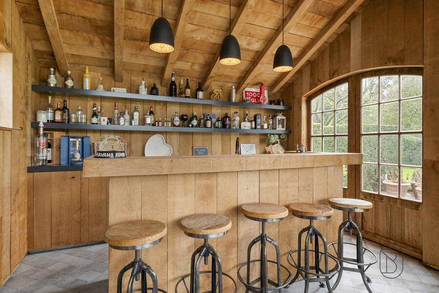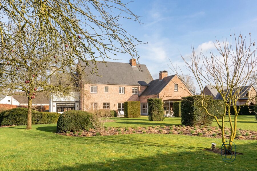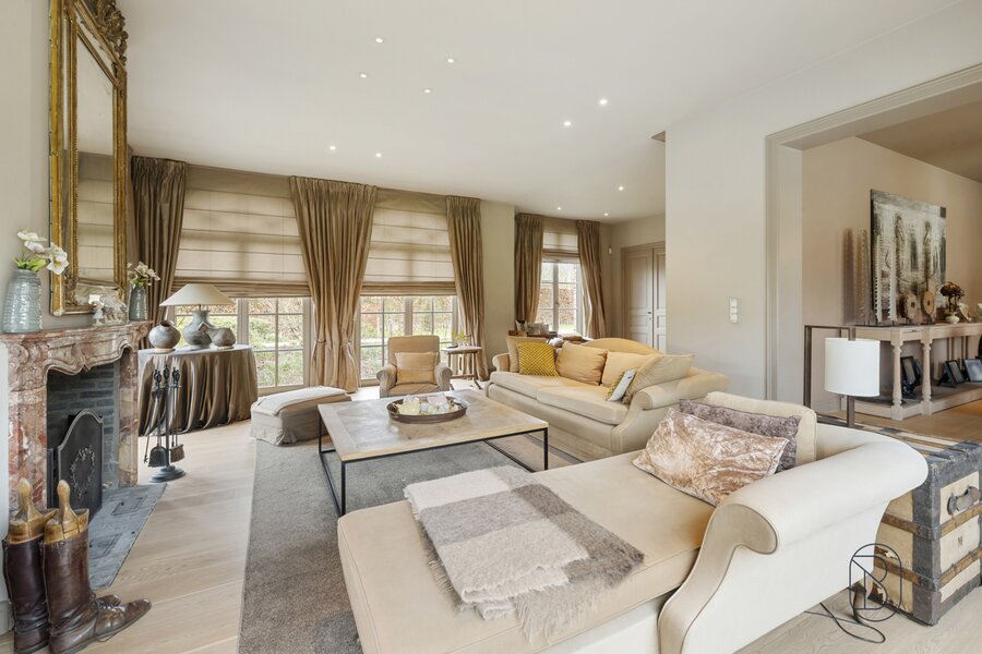 indrukwekkende inkomhal met prachtige trap, bureau, apart toilet en vestiaire, gezellige grote leefruimte (mooie schouw, parket, extra bureau), geïnstalleerde keuken met extra ontbijthoek, grenzend aan de orangerie (bar, open haard) met uitzicht op terras en tuin, extra bijkeuken en wasplaats (met koelcel); extra toilet, 3 garages (overzolderd).