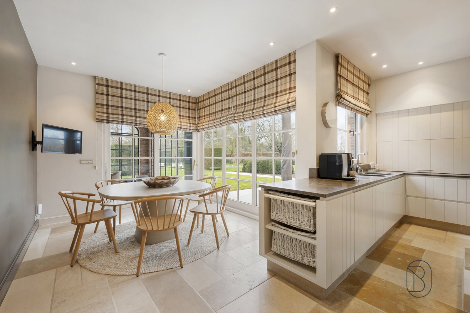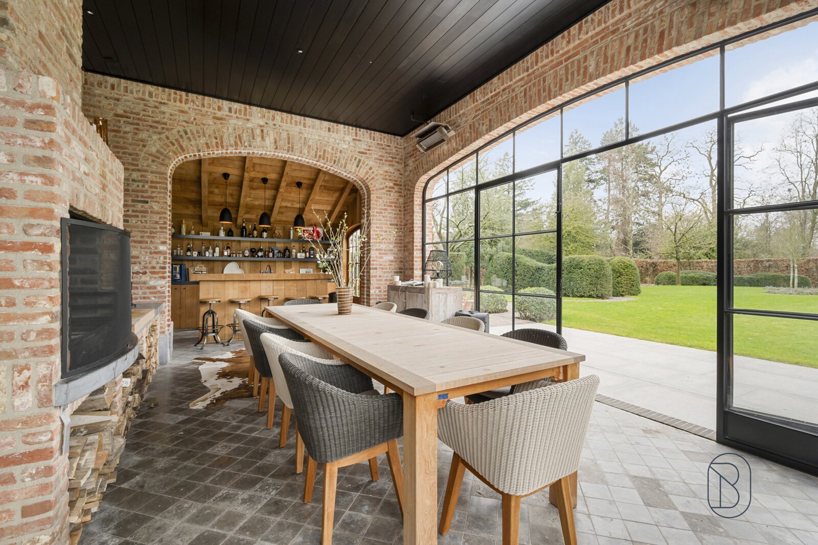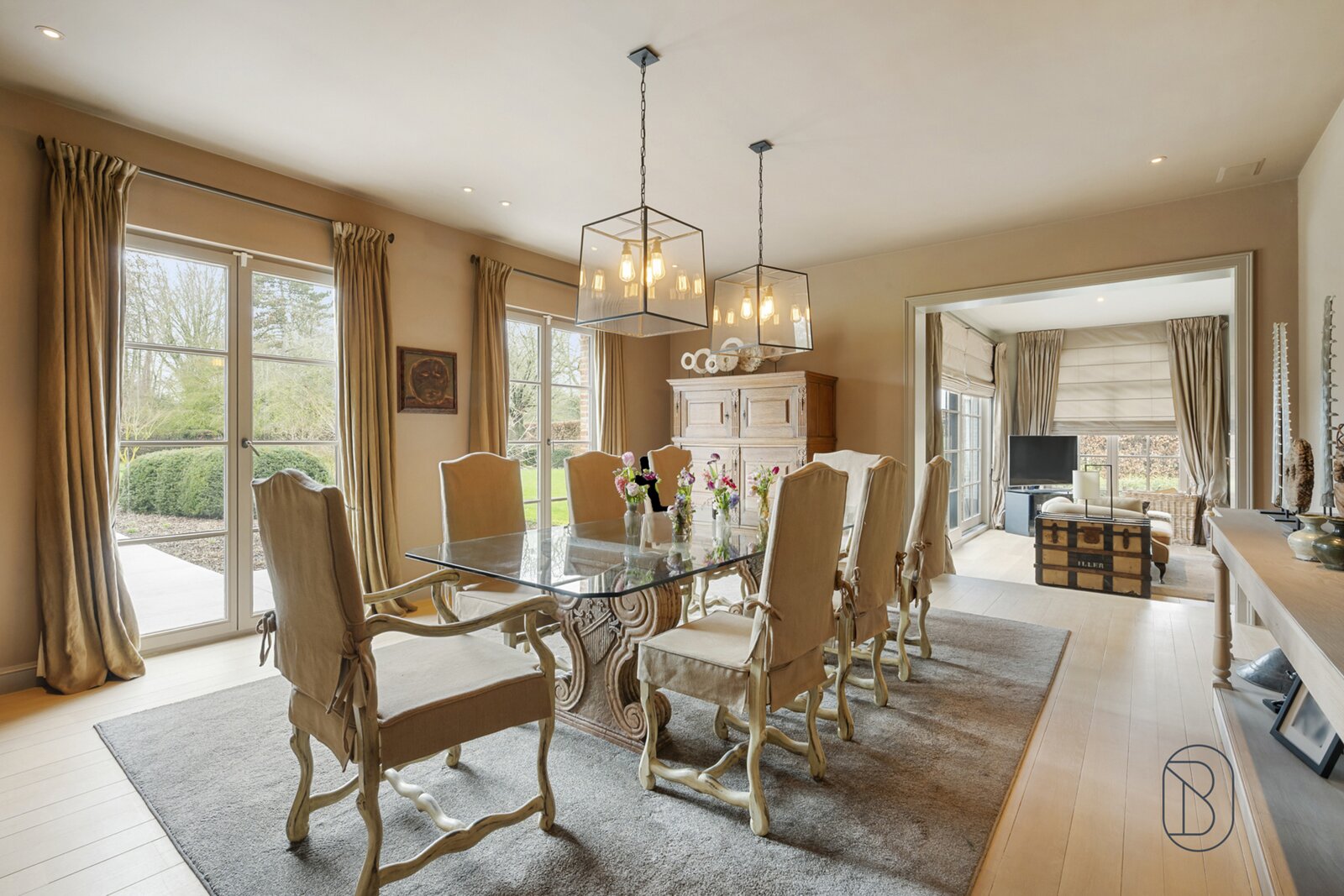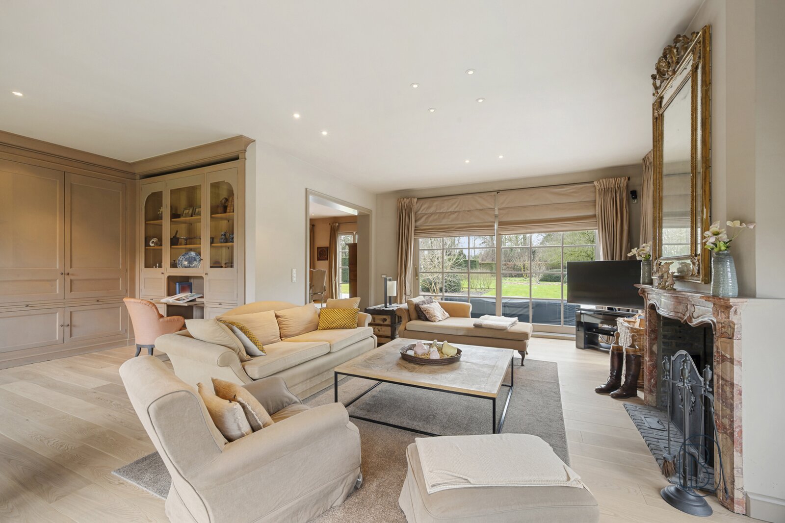 indrukwekkende inkomhal met prachtige trap, bureau, apart toilet en vestiaire, gezellige grote leefruimte (mooie schouw, parket, extra bureau), geïnstalleerde keuken met extra ontbijthoek, grenzend aan de orangerie (bar, open haard) met uitzicht op terras en tuin, extra bijkeuken en wasplaats (met koelcel); extra toilet, 3 garages (overzolderd).