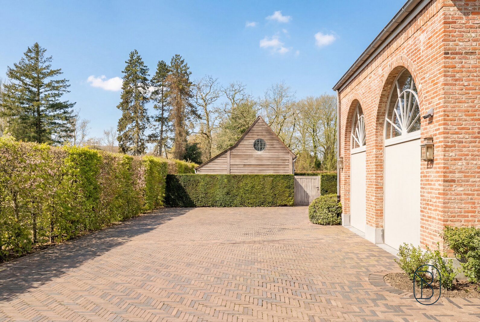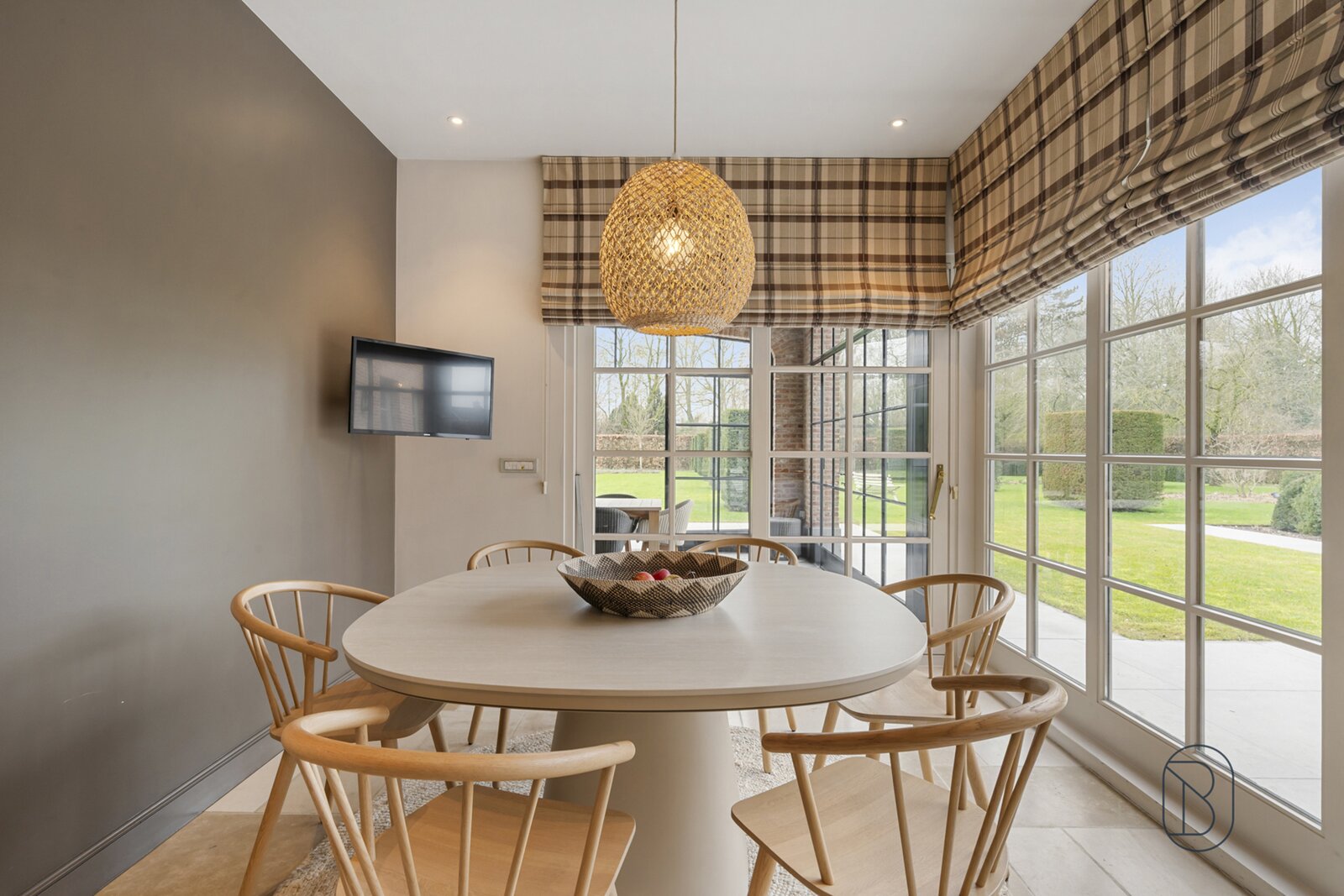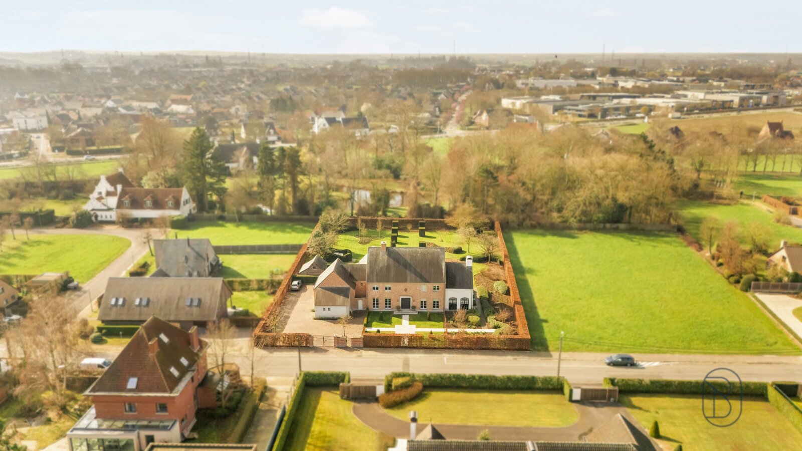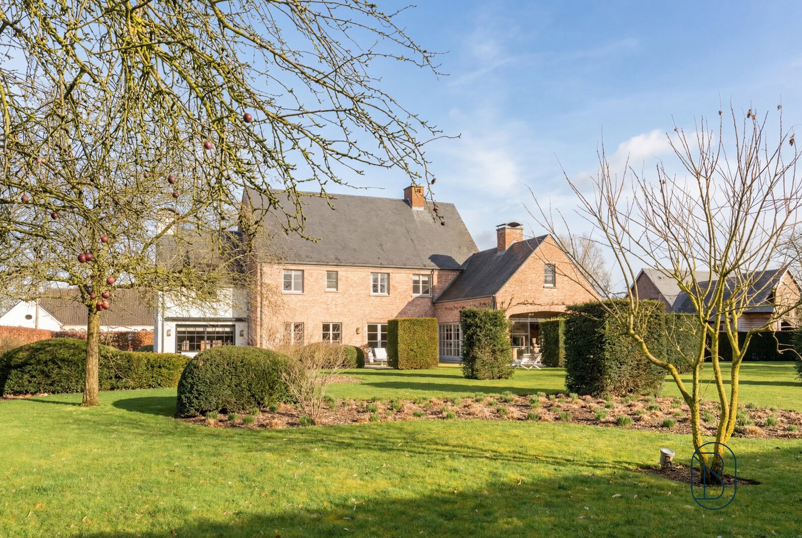 indrukwekkende inkomhal met prachtige trap, bureau, apart toilet en vestiaire, gezellige grote leefruimte (mooie schouw, parket, extra bureau), geïnstalleerde keuken met extra ontbijthoek, grenzend aan de orangerie (bar, open haard) met uitzicht op terras en tuin, extra bijkeuken en wasplaats (met koelcel); extra toilet, 3 garages (overzolderd).
