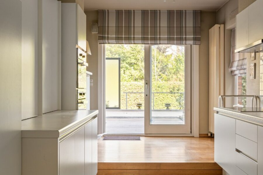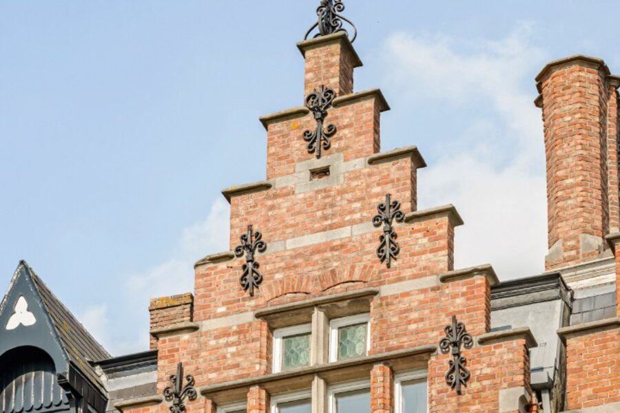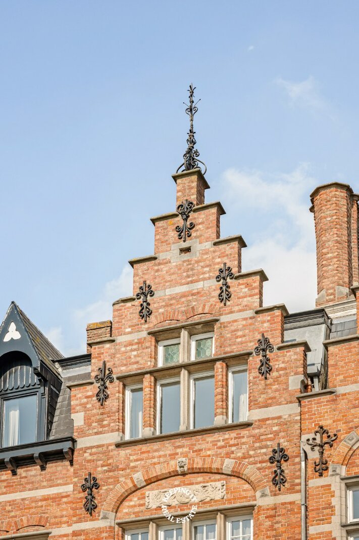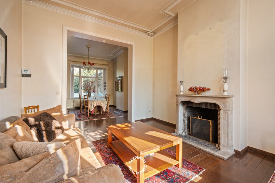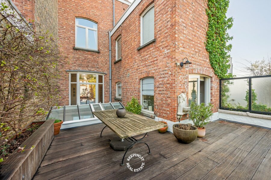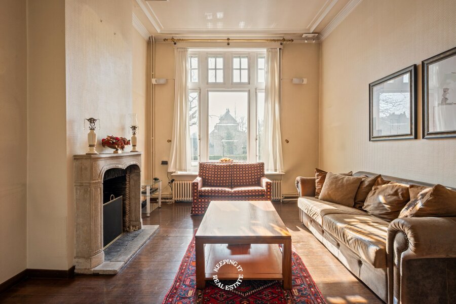 Op het gelijkvloers wordt u verwelkomd in een statige inkomhal met een elegante trap die meteen de toon zet voor de rest van de woning. De inkom vormt een stijlvolle introductie tot het karakter en de klasse die doorheen het volledige pand voelbaar zijn. De leefruimte bestaande uit salon en eetplaats wordt overgoten door natuurlijk licht en is voorzien van een open haard. Aansluitend treft men de ruime keuken die uitgeeft op het verhoogde terras met zicht op de stadstuin.