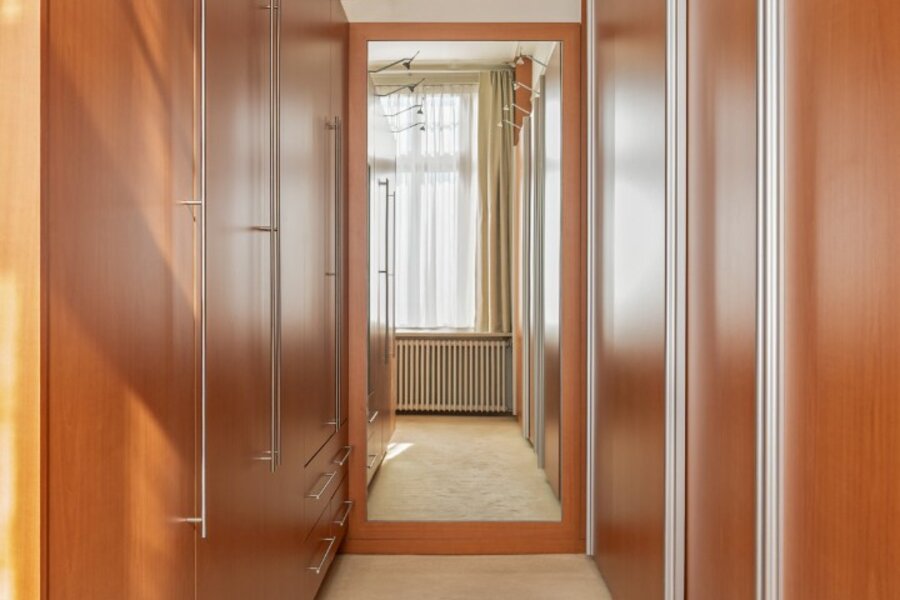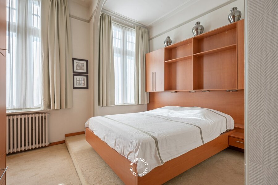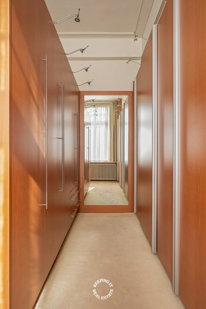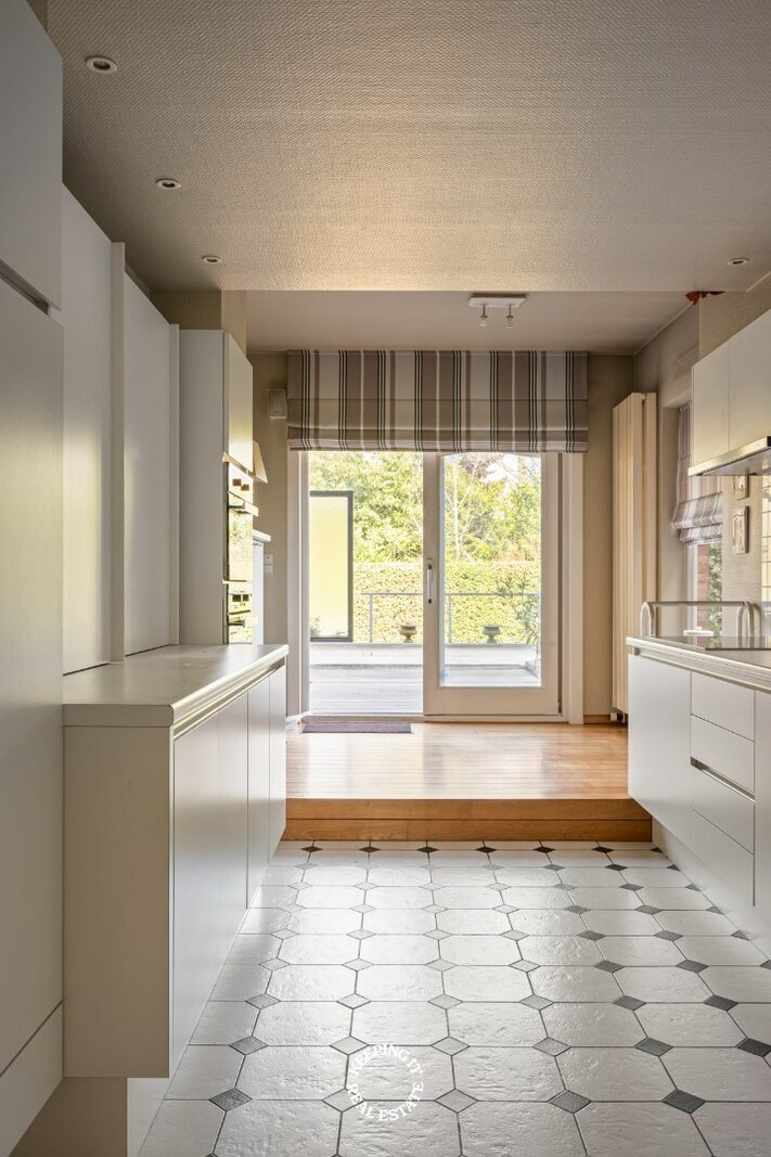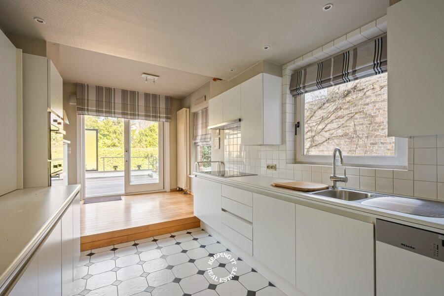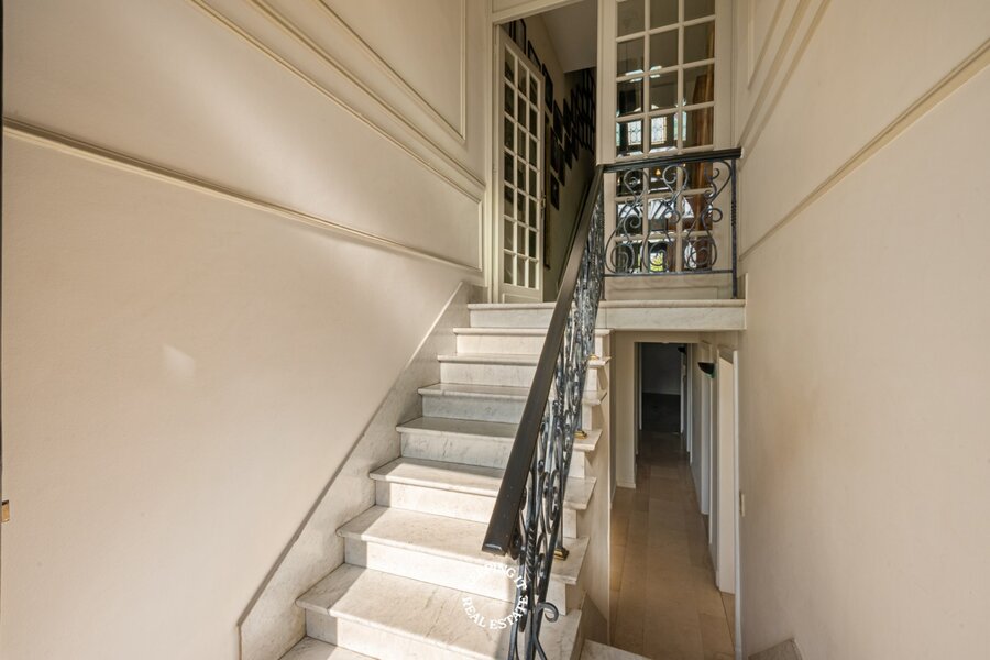 Op het gelijkvloers wordt u verwelkomd in een statige inkomhal met een elegante trap die meteen de toon zet voor de rest van de woning. De inkom vormt een stijlvolle introductie tot het karakter en de klasse die doorheen het volledige pand voelbaar zijn. De leefruimte bestaande uit salon en eetplaats wordt overgoten door natuurlijk licht en is voorzien van een open haard. Aansluitend treft men de ruime keuken die uitgeeft op het verhoogde terras met zicht op de stadstuin.