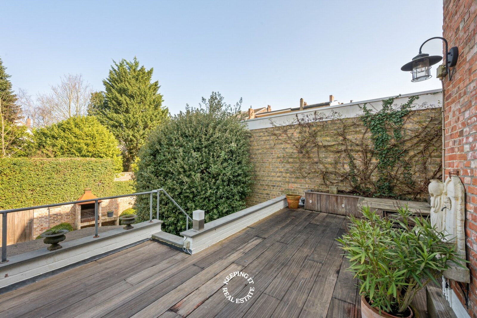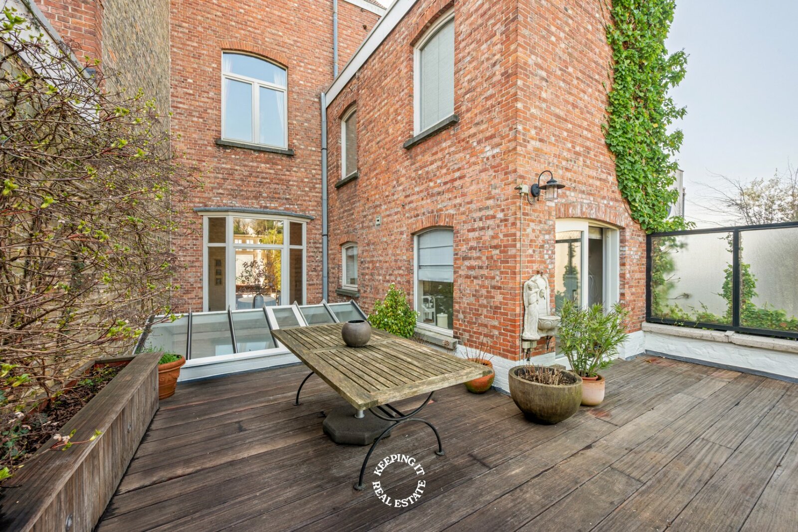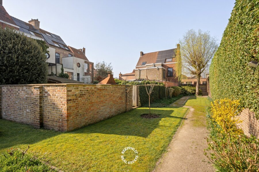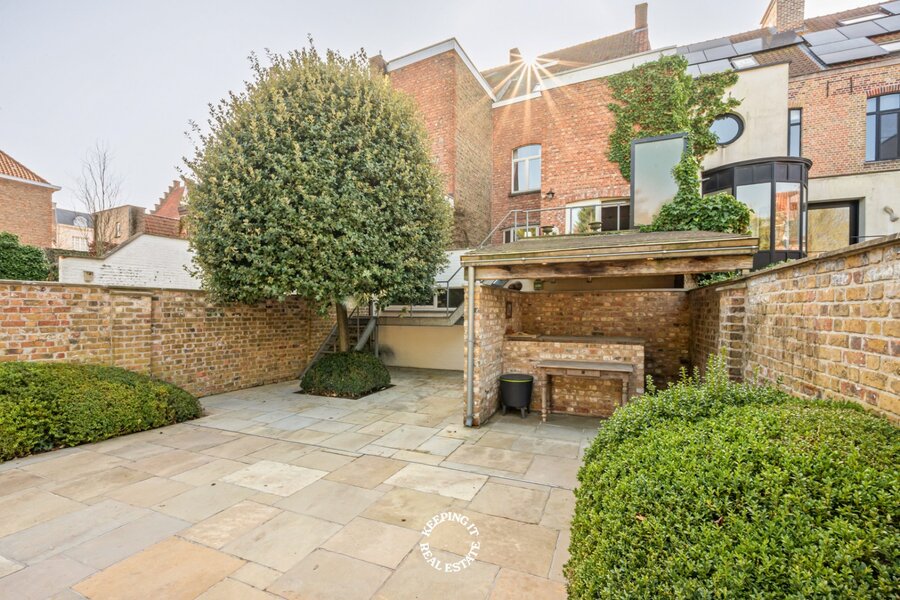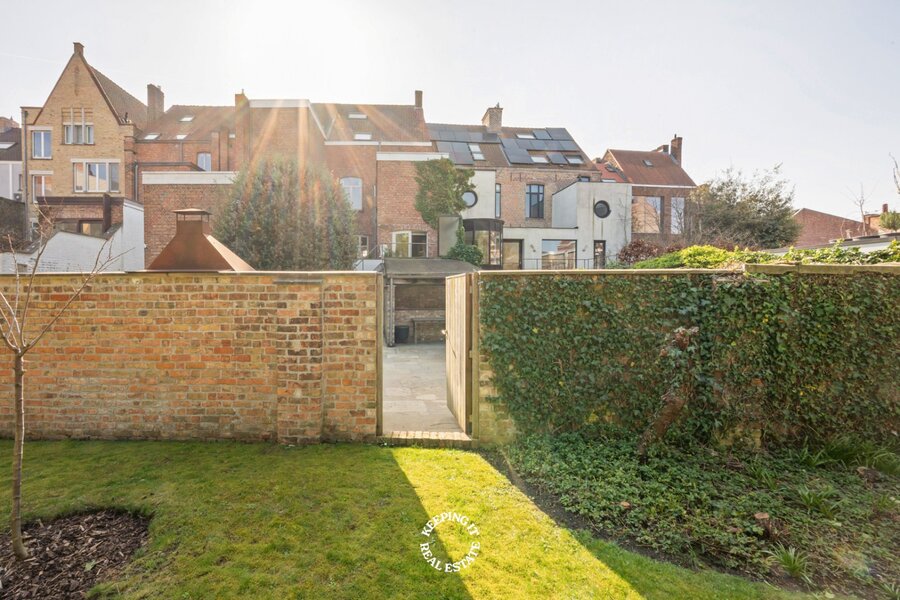 Ook buiten komt de charme van deze woning volledig tot zijn recht. De stadstuin vormt een groene, zonovergoten oase van rust midden in de stad. Met haar overdekte buitenbar vormt ze het ideale decor voor lange zomeravonden, gezellige ontvangsten en ontspannen momenten met familie en vrienden. Tot slot is er nog een fietsenberging achterpoort met een recht van doorgang. Er is ook een mogelijkheid om de huur van 2 garages over te nemen.