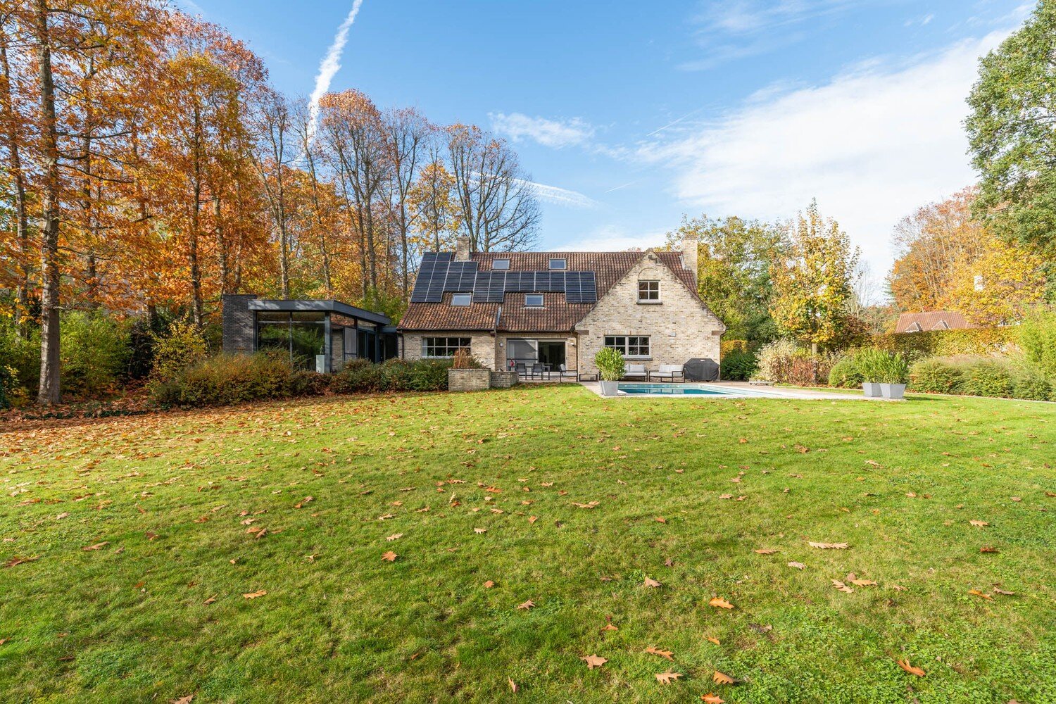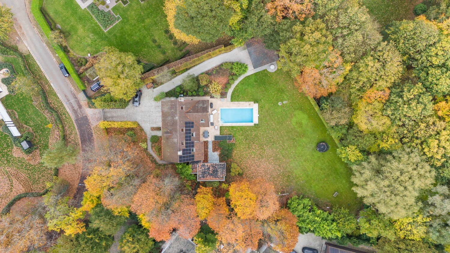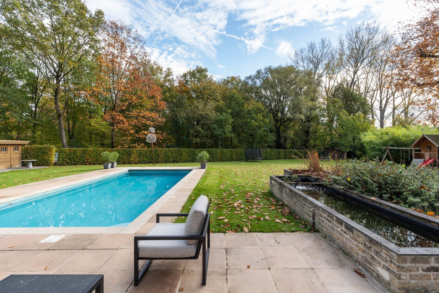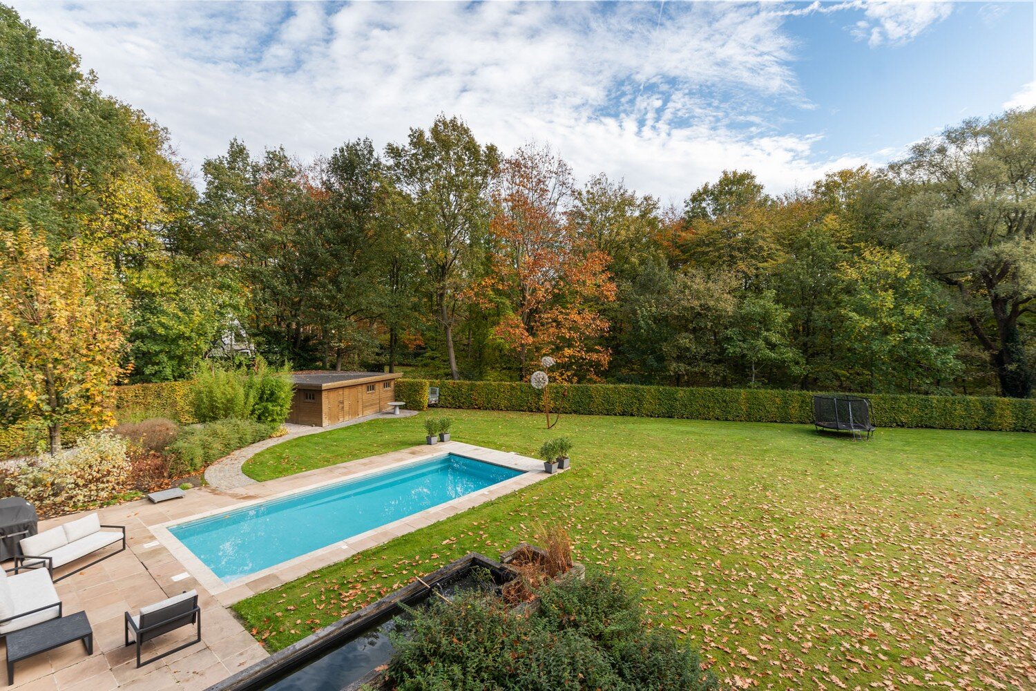 De buitenruimte is een paradijs voor wie van rust en natuur houdt: een prachtig aangelegde, brede tuin met terras, een verwarmd zwembad, en een sfeervolle vijver vormen samen een unieke plek om te ontspannen in volledige privacy. Dankzij de openheid van het perceel en de zuidgerichte ligging heeft de tuin de hele dag zon, terwijl de omliggende bomen zorgen voor privacy zonder dat er schaduw over het perceel valt. Daarnaast biedt het bijgebouw met carport en garage extra opbergruimte voor wagens, fietsen en tuinmateriaal.