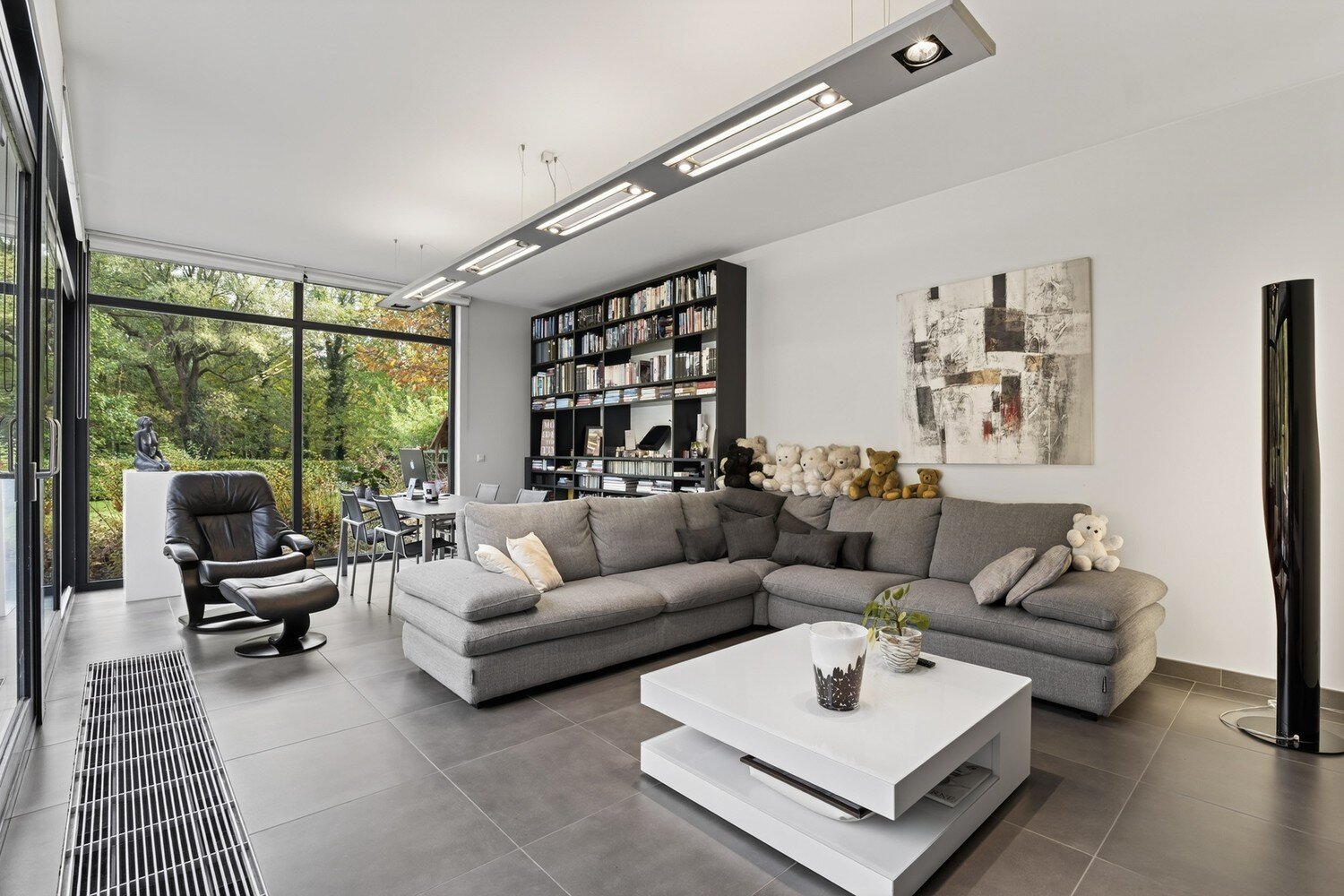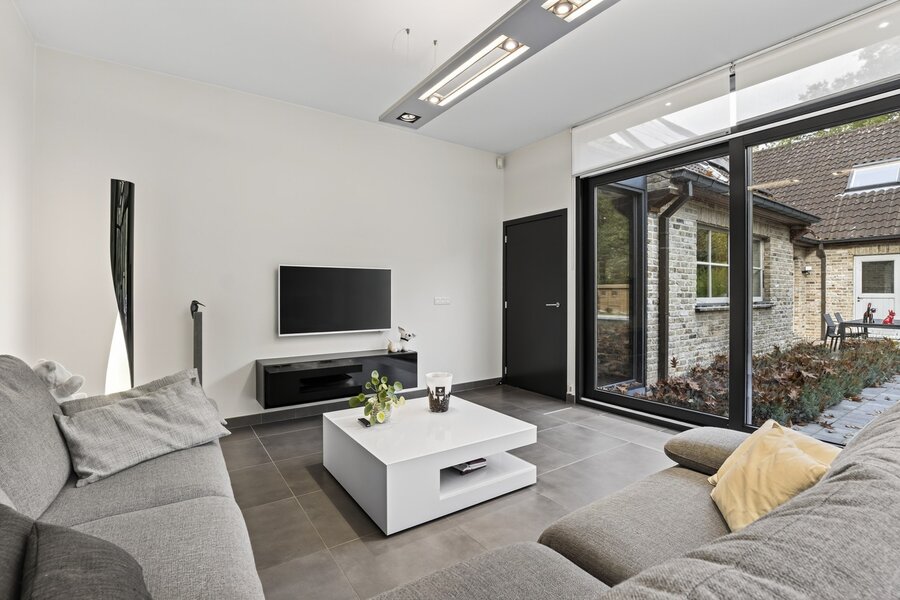 De lichtrijke leefruimte met gezellige zithoek en eetgedeelte sluit naadloos aan op de open, volledig ingerichte keuken met ontbijthoek. Aansluitend bevindt zich een wasruimte en een dubbele inpandige garage met automatische poorten. De inkomhal geeft toegang tot de eerste bureau- en leefruimte en is voorzien van een gastentoilet.