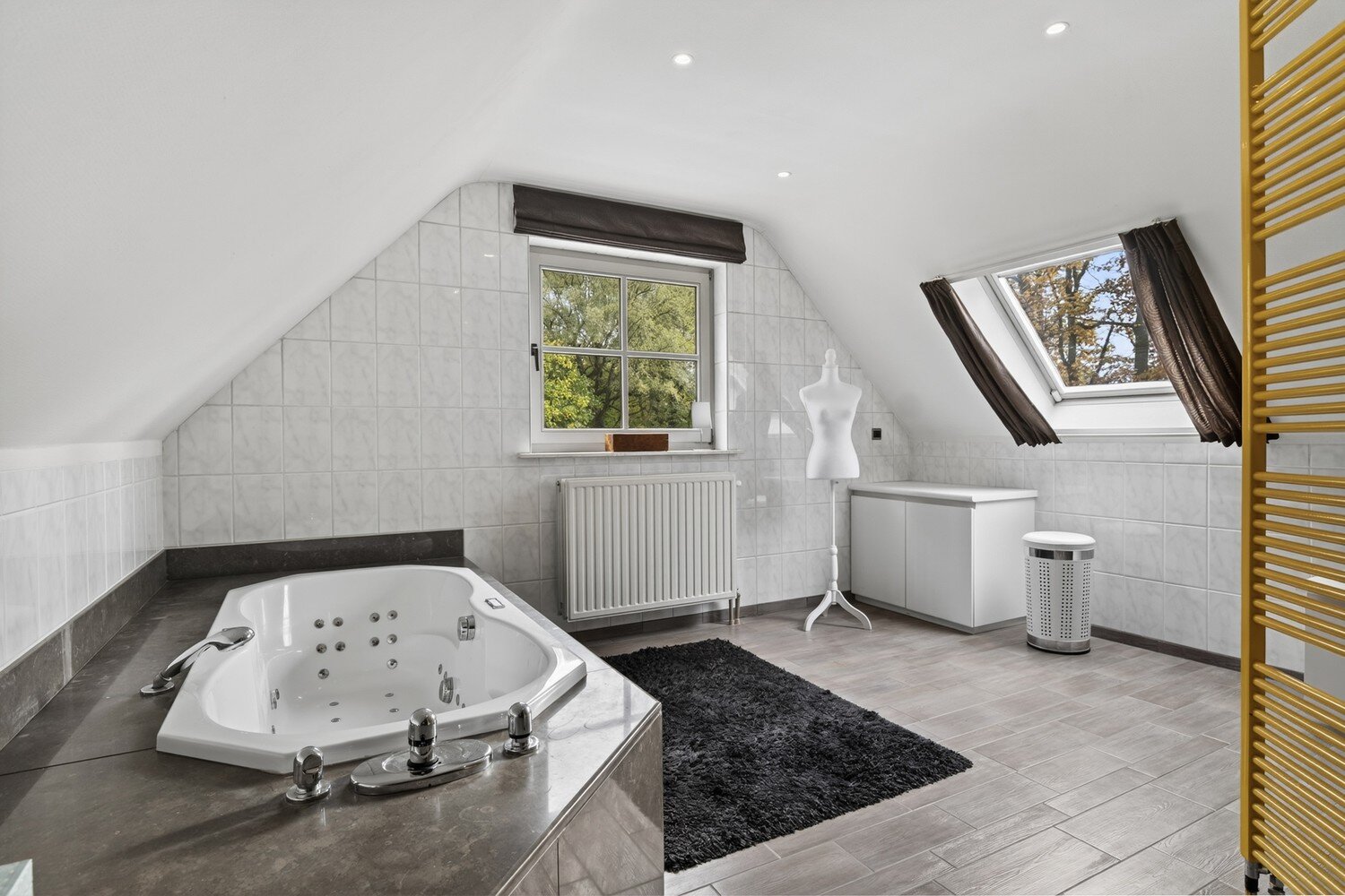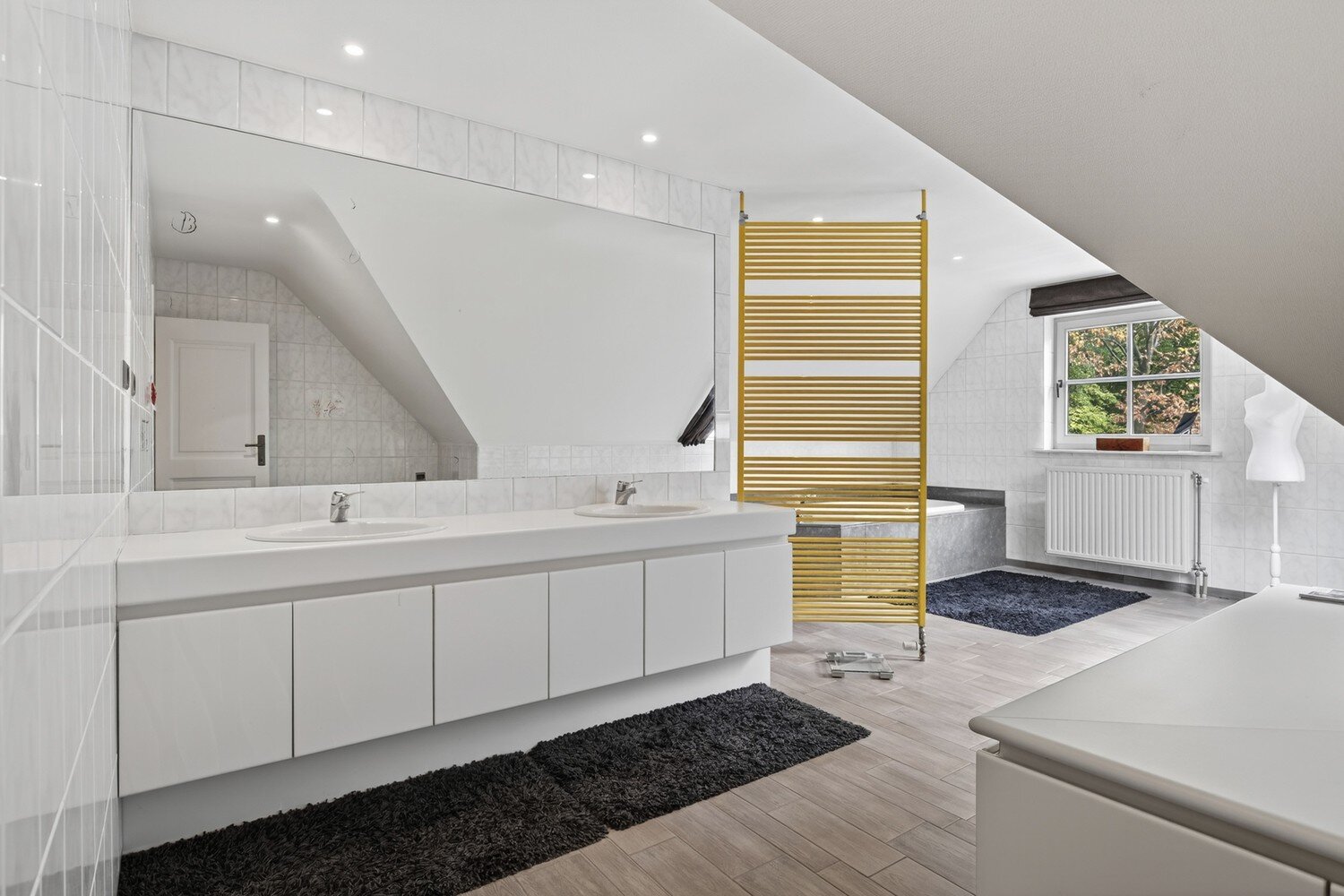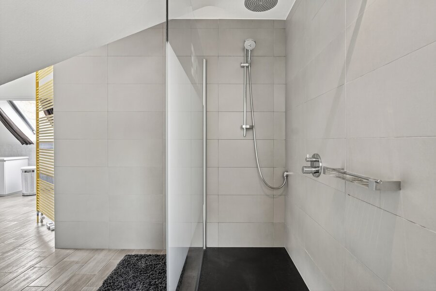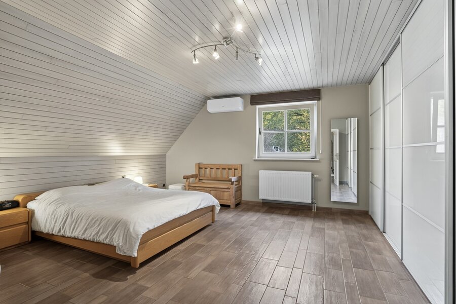 Op de eerste verdieping bevinden zich vier ruime slaapkamers waarvan de master is voorzien van ingemaakte kasten, en een verzorgde badkamer met dubbele lavabo, inloopdouche en bubbelbad. Via een vaste trap bereikt u de zolderverdieping, die kan worden ingericht als extra slaapkamer(s) of polyvalente ruimte.