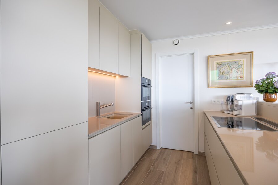 De volledig ingerichte open keuken sluit harmonieus aan bij de leefruimte en straalt hedendaags comfort uit.