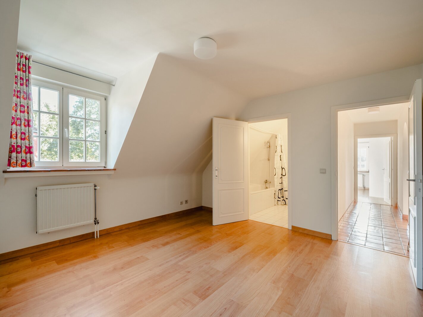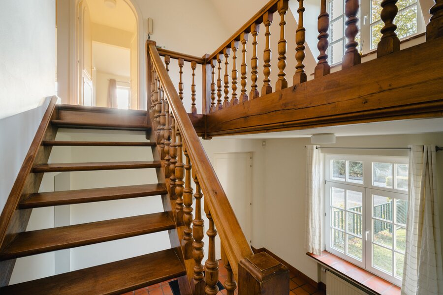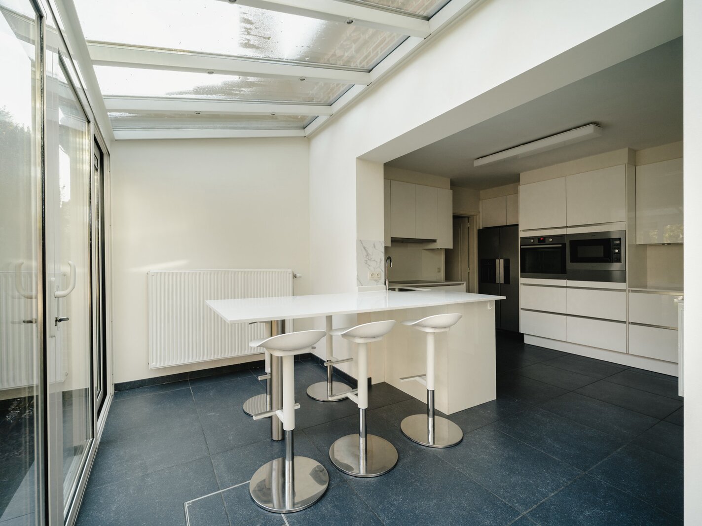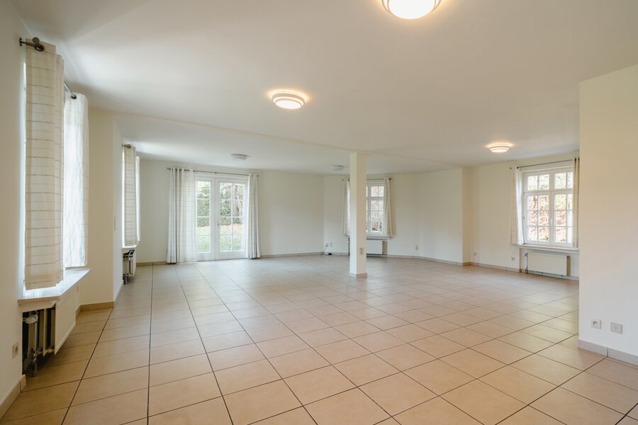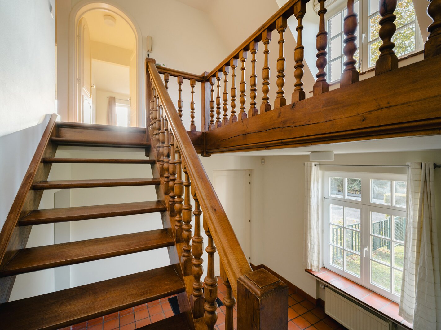 De woning komt uit op een inkomhal met gastentoilet en leidt naar de leefruimtes van 40 m², die baden in het licht dankzij erkers met uitzicht op de tuin. De woonkamer is voorzien van een werkende open haard en een eetkamer. Een grote, volledig ingerichte keuken met eetkamer en toegang tot de tuin maakt de woning compleet. Boven zijn er vier slaapkamers, elk met een inloopkast en een eigen badkamer, en een bergzolder. Een dubbele garage maakt de woning compleet.