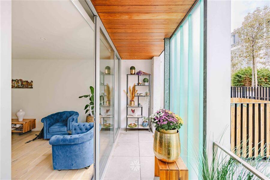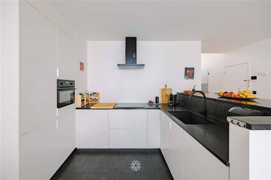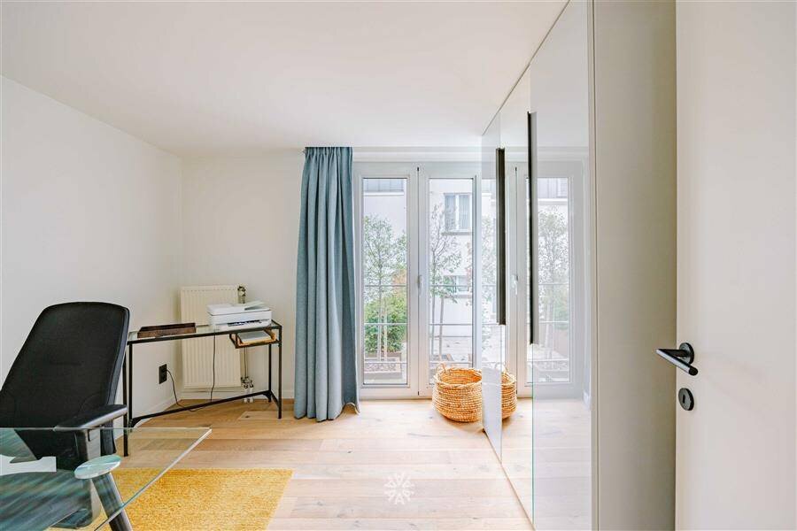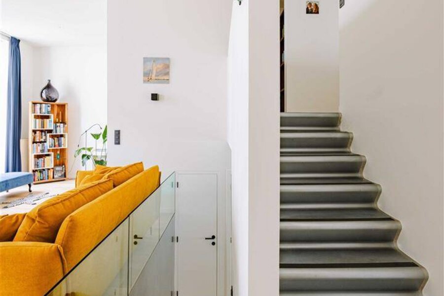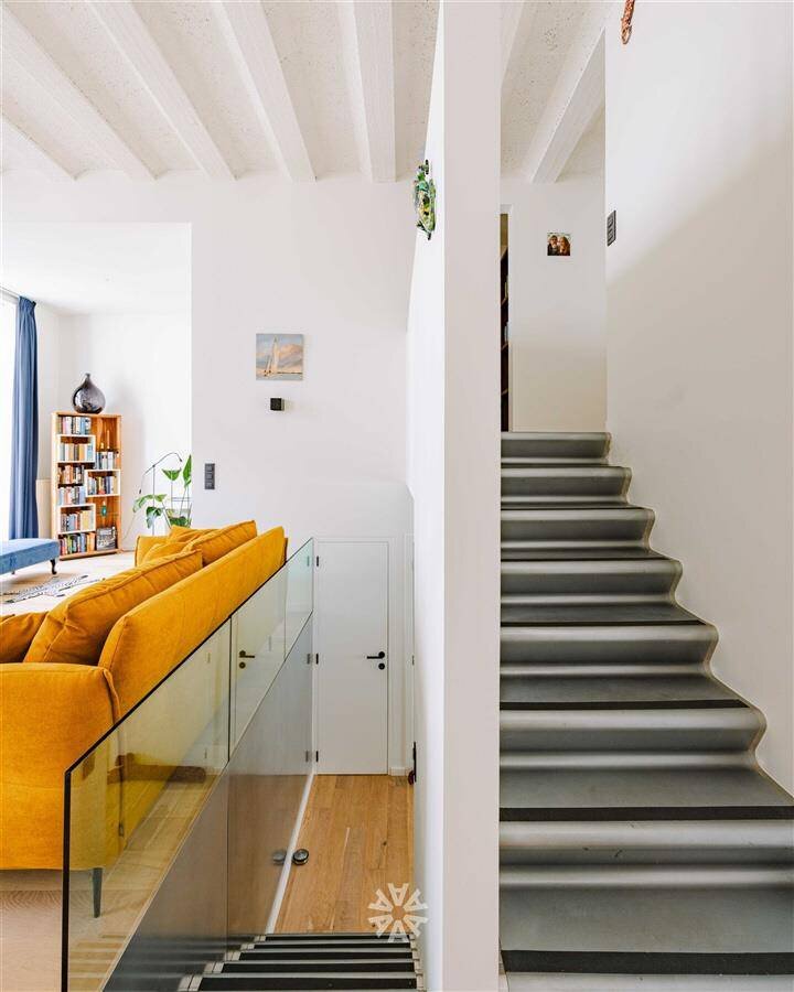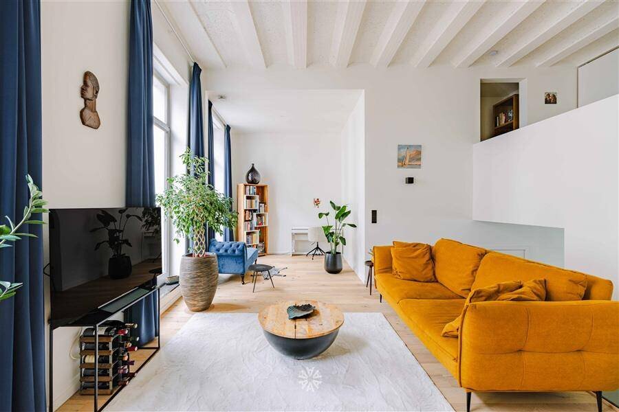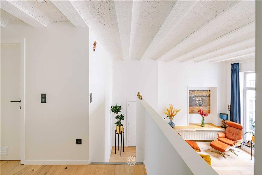 Deze unieke opportuniteit omvat een lichtrijke leefkeuken met eetkamer en toegang tot het zonnige terras, en een apart gastentoilet. Via de stijlvolle trap komen we aan in de ruime woonkamer met hoge plafonds, veel lichtinval en uitgesproken loft-vibes. Verder beschikt het trendy appartement over een nachthal met een extra berging, een tweede toilet, een badkamer met inloopdouche en lavabomeubel en twee volwaardige slaapkamers.