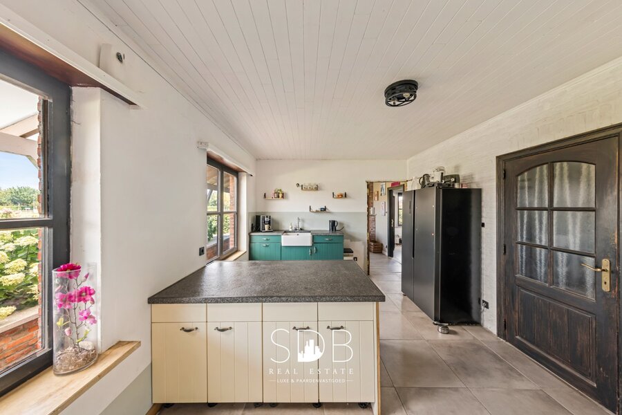 Aansluitend tref je de lichtrijke keuken aan die voorzien is van een keukeneiland en tijdens het kokerellen kan je ten volle genieten van de grazende paarden in de weides. Waarbij een cozy eetruimte bij de keuken aansluit.