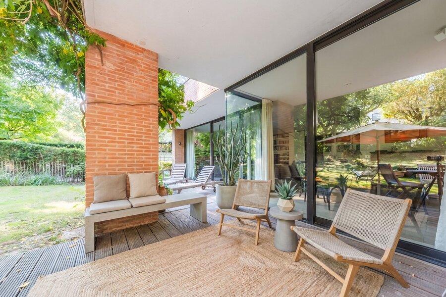 Bij binnenkomst verdeelt de hal de verschillende ruimtes van het huis door middel van plafondhoge deuren, wat het gevoel van ruimte en vloeibaarheid versterkt. Het opent naar een ruime woonkamer met een open haard en geniet van een ideale oriëntatie. De grote schuiframen, die de hele gevel bedekken, zorgen voor opmerkelijke helderheid en bieden directe toegang tot het terras, voorzien van een barbecuehoek.