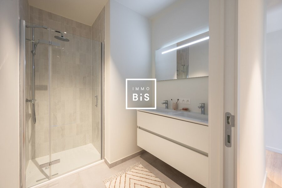Inkomhal met gastentoilet en vestiaire. Lichtrijke leefruimte en open keuken uitgevend op het terras van 11m².