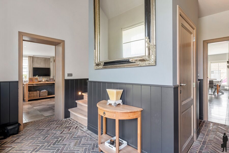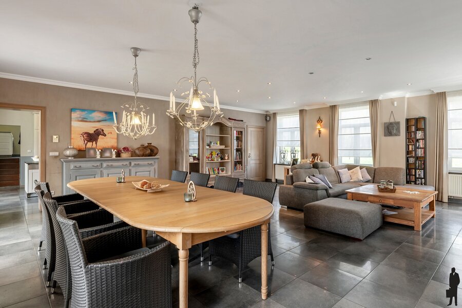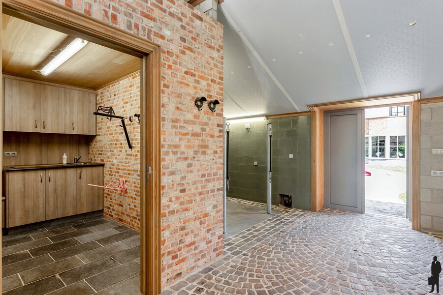 Riante en uiterst kwalitatief gerenoveerde hoevevilla (renovatie 2000-2002) nabij Postel op domein van 8.875 m² met 4 tot 6 slaapkamers, 3 badkamers, bureauruimte, eigen fitness en ruimte voor opslag en paardenstallingen. In de loods achteraan (ca. 180 m²) is een deel volledig ingericht voor het onderbrengen van paarden, pony's of andere weidedieren; een ander deel wordt momenteel gebruikt voor opslag. In de loods grenzend aan de woning (ca. 163 m²) bevindt zich nog bijkomende opslagruimte (bv. voor trailers). De ruimte is multifunctioneel en doet momenteel dienst als werkkamer en ingerichte fitnessruimte. De buitenstallen (met boxen, zadel- en verzorgingskamer) zijn voorzien van een aangrenzende graspaddock zodat dieren voldoende ruimte en bewegingsvrijheid hebben. De hoevevilla zelf is hoogwaardig afgewerkt en biedt een combinatie van wooncomfort, praktische voorzieningen (o.a. douchekamer in buitenhal, wellnessbadkamer boven, etc.) en enorm veel ruimte en lichtinval. Zij beschikt verder over een uiterst gunstige EPC-score van 175kWh/m²/jaar (label B).