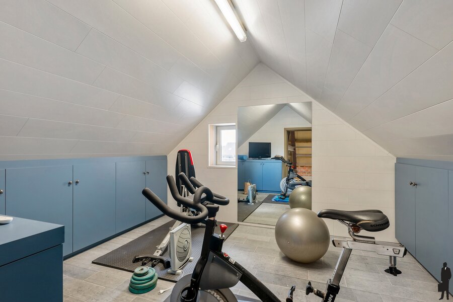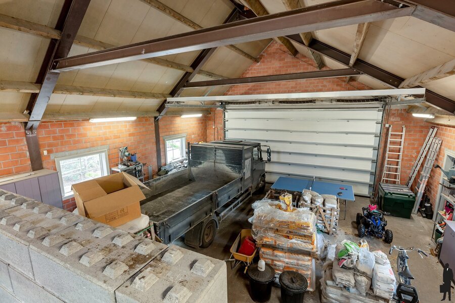 Het eigendom beschikt over een groot garagegebouw met twee brede sectionale poorten. Deze ruimte is uitermate geschikt voor opslag of het stallen van rollend materieel, zoals landbouwvoertuigen of trailers. Op de bovenverdieping van het garagegebouw is er een volledig ingerichte fitnessruimte, ideaal voor wie graag thuis sport.