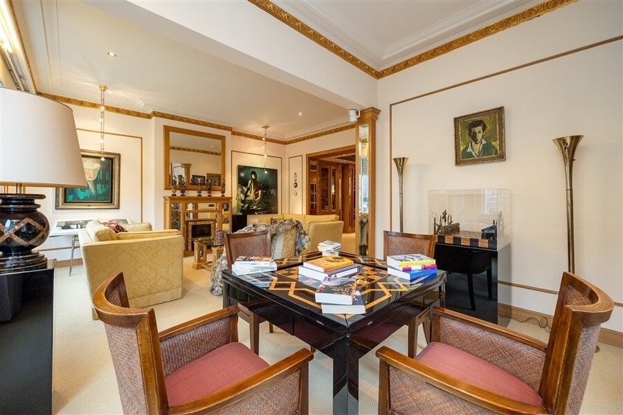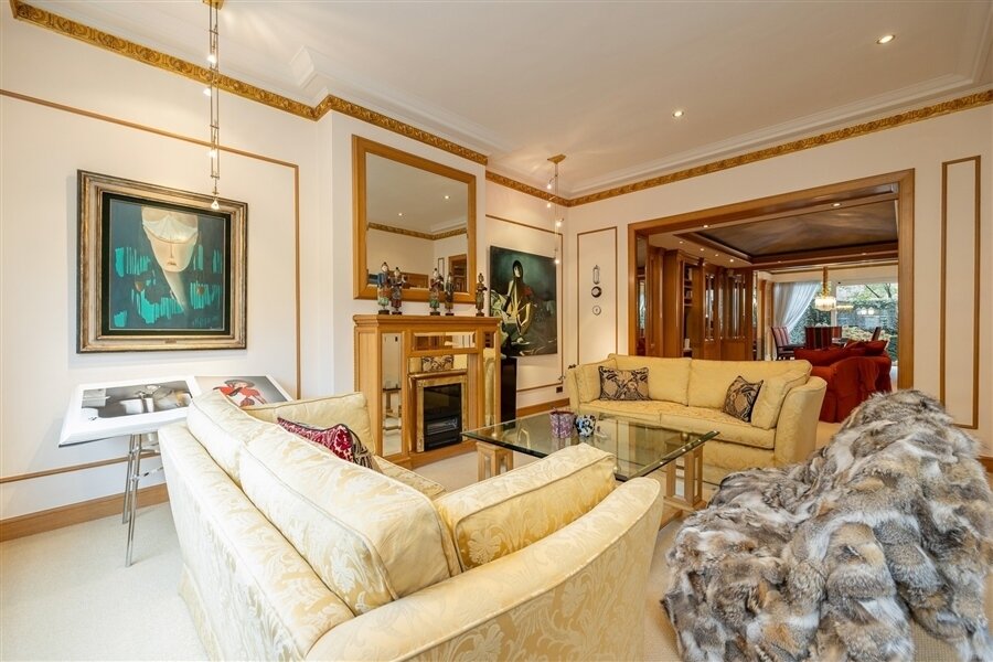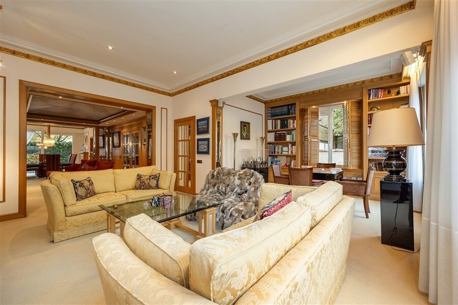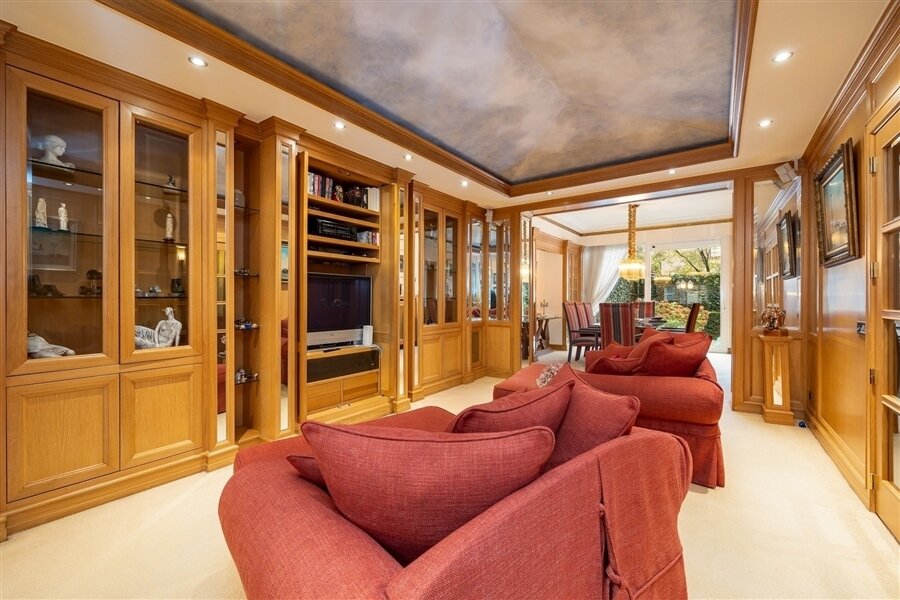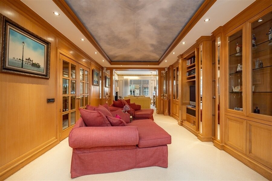 Leefruimte met ingebouwde bibliotheek,TV-kast en aparte zitruimte .