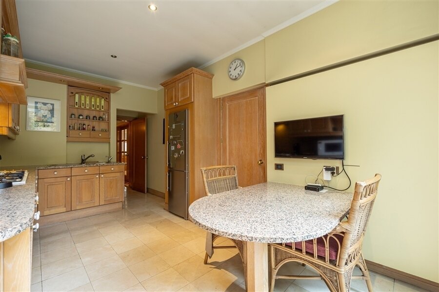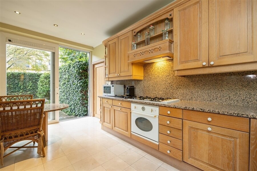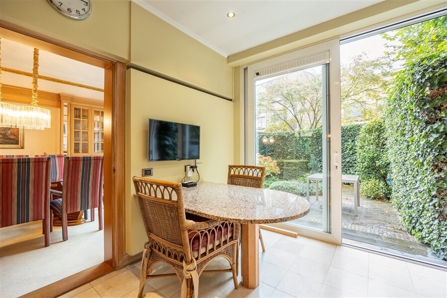 Volledig ingerichte keuken met zithoek. Aanpalende eetkamer. Beiden geven via schuiframen uit op een aangename, ingerichte tuin.