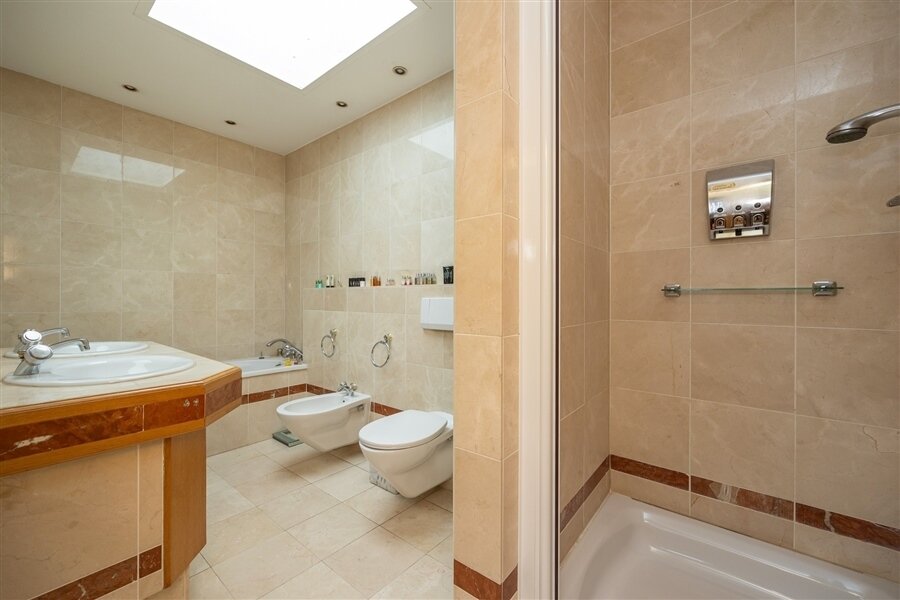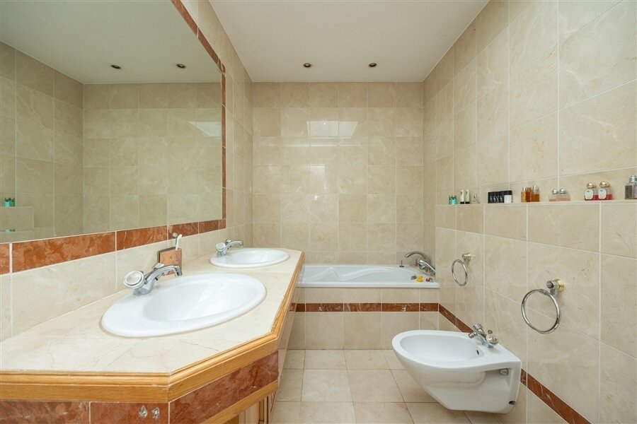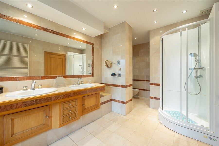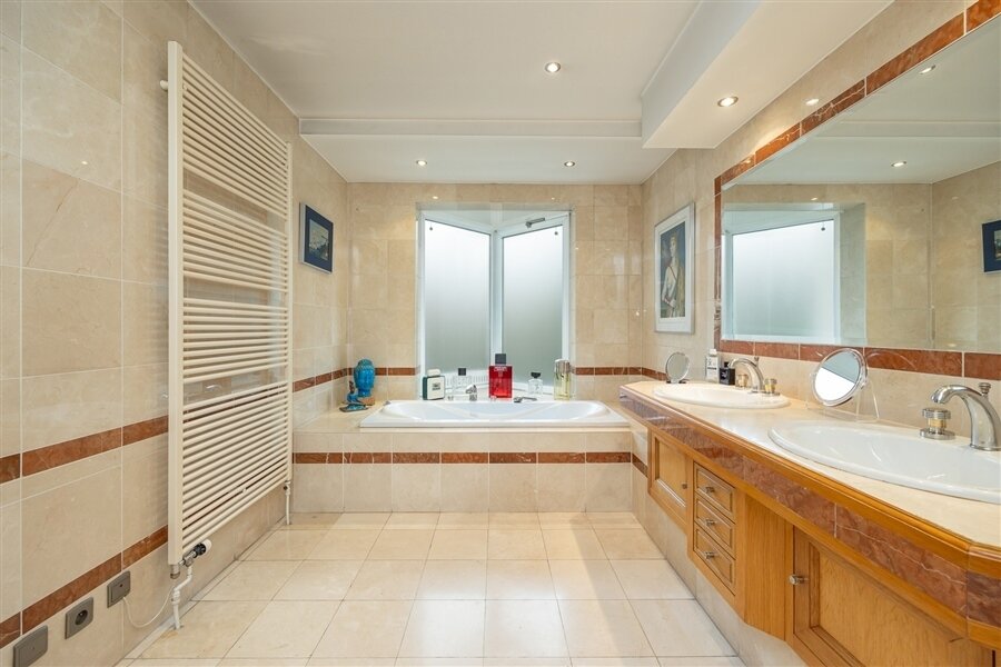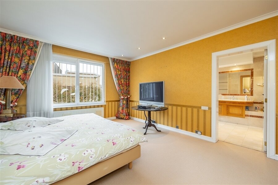Grote masterbedroom met ingemaakte dressing en ruime badkamer met ligbad, douche, dubbele lavabo en toilet.