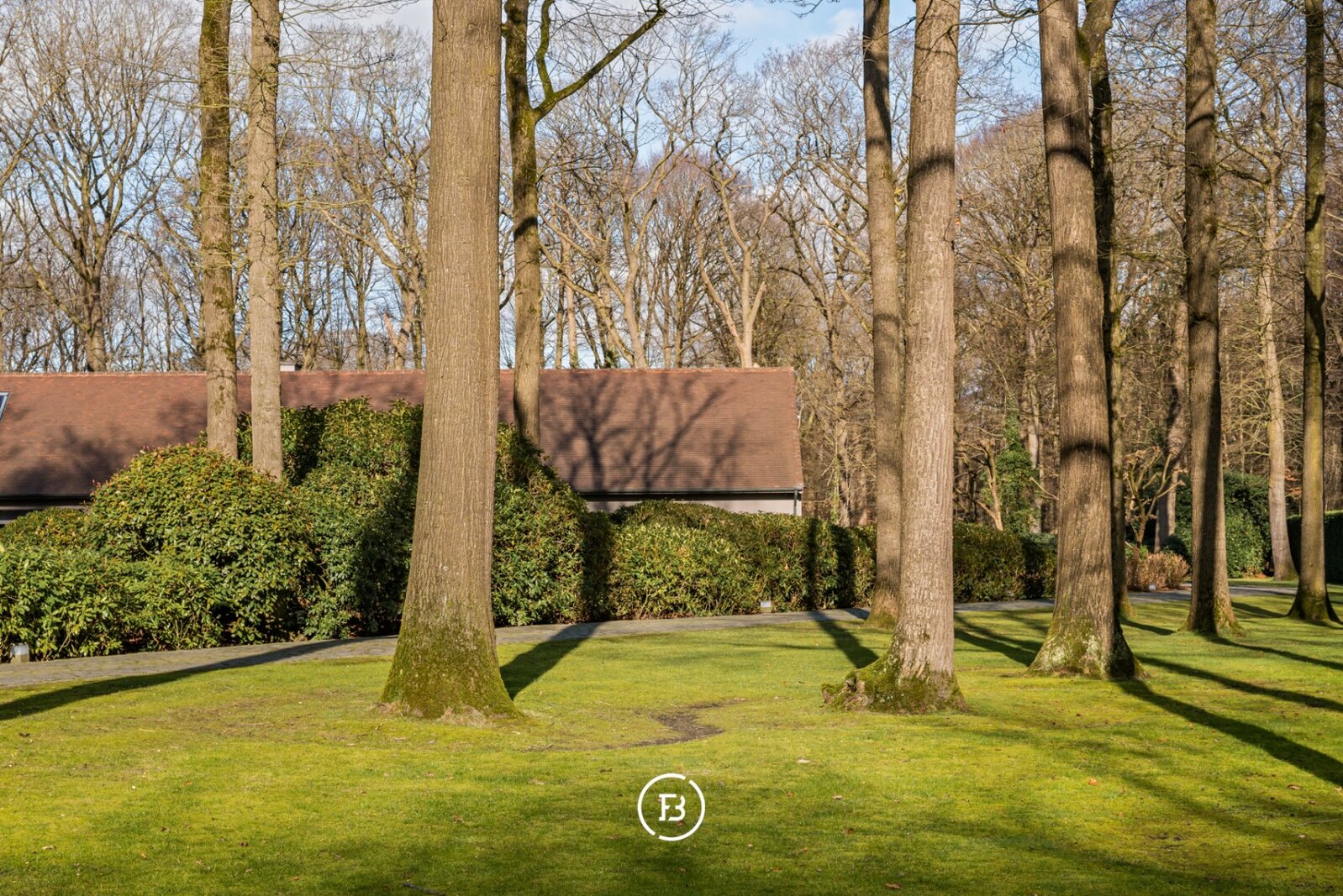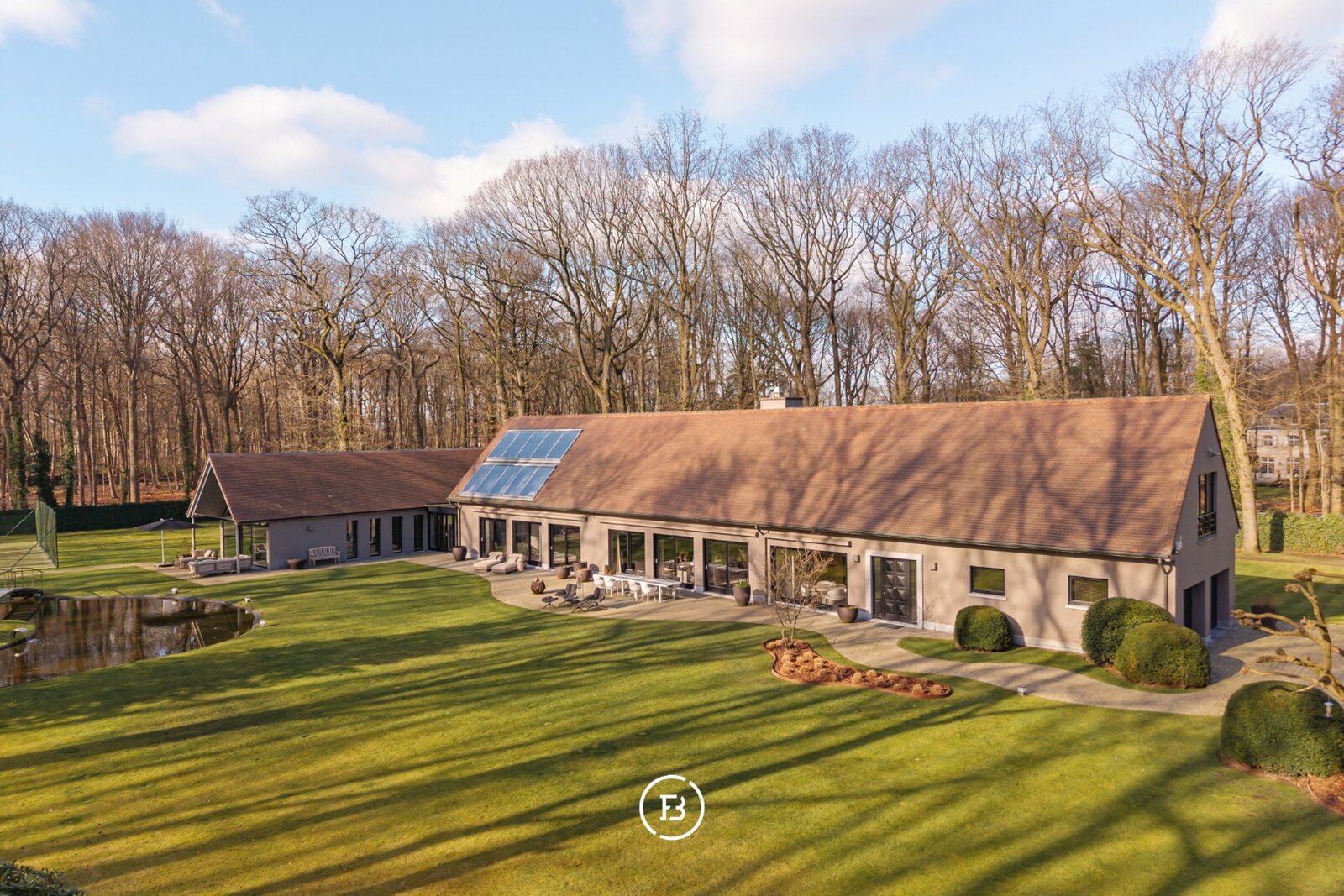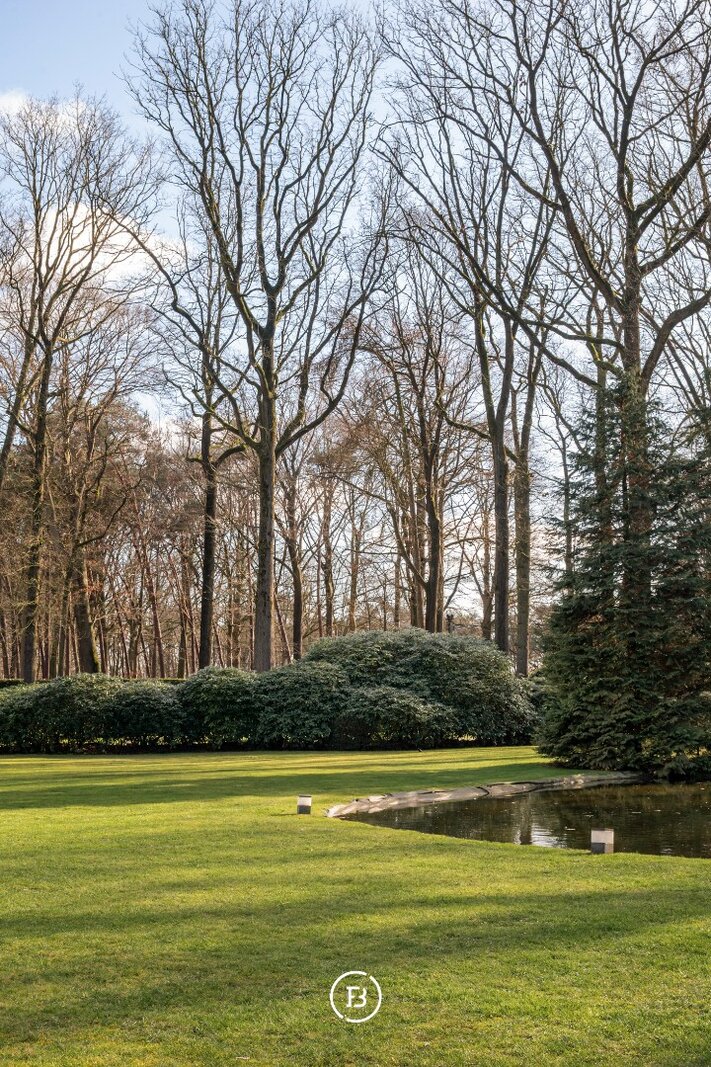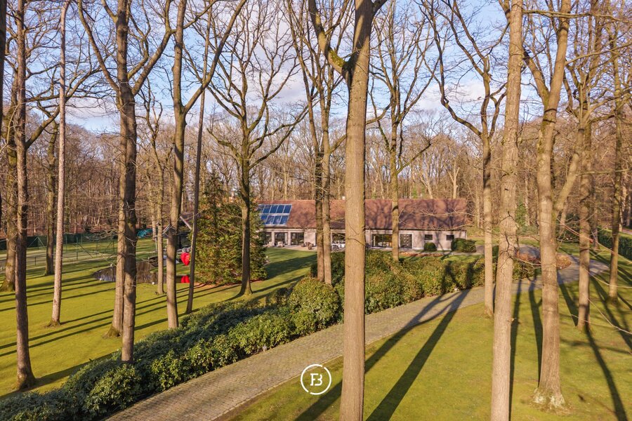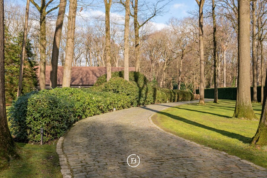 Op één van de mooiste en meest gegeerde percelen van het bos, een uitzonderlijk zuidgericht domein van 13.570 m², ligt deze tijdloze villa waar rust, privacy en actief genieten perfect samenkomen. Het terrein wordt gekenmerkt door een zeldzame combinatie van majestueuze bomen en open, lichtrijke ruimtes, waardoor het een parkachtig en tegelijk luchtig karakter krijgt. Het omheinde perceel is bereikbaar via een indrukwekkende oprijlaan en ontvouwt zich als een privépark met vijver en een tennisplein in kunstgras.