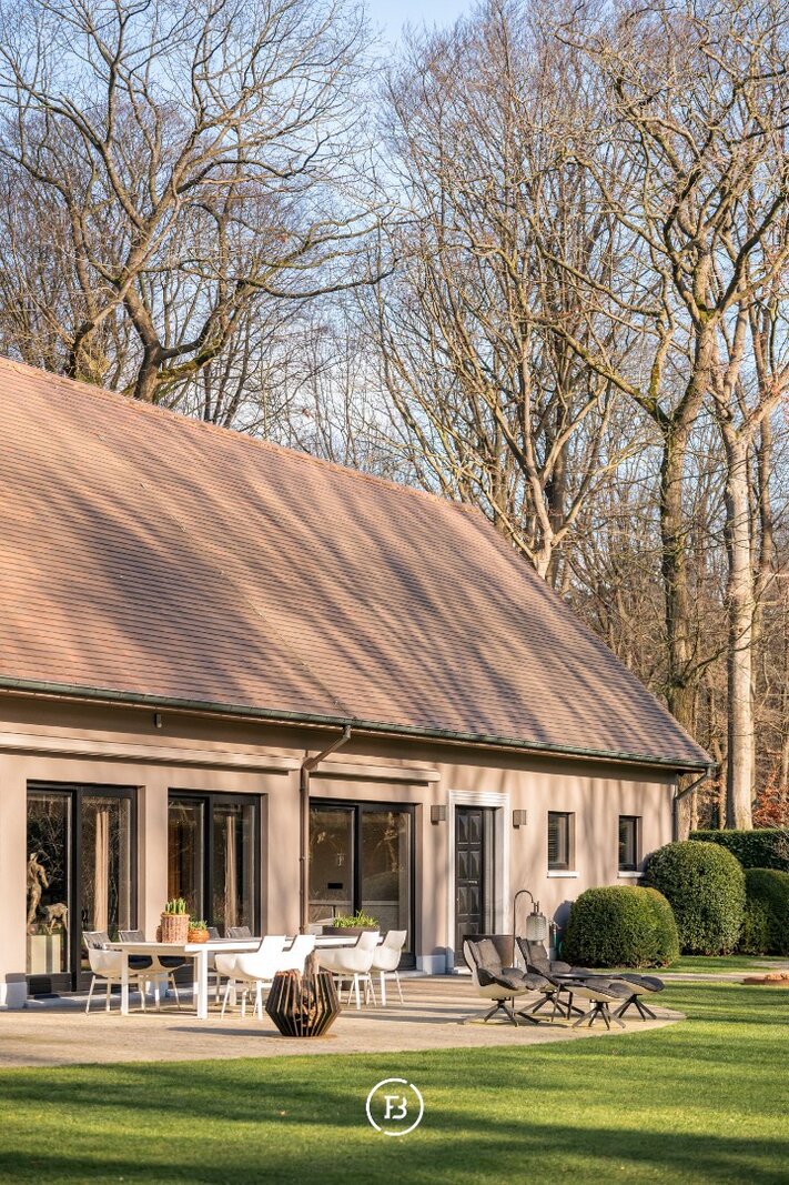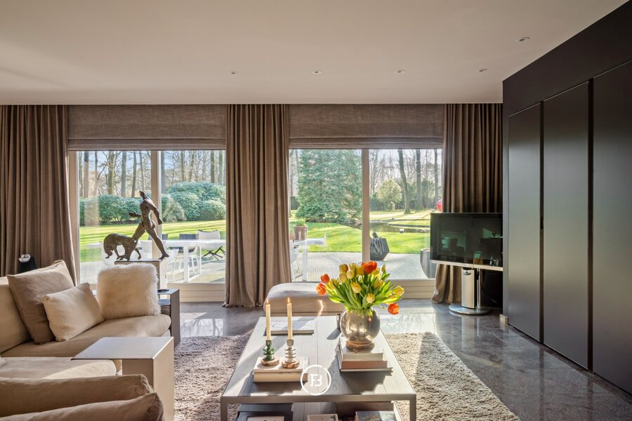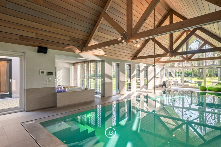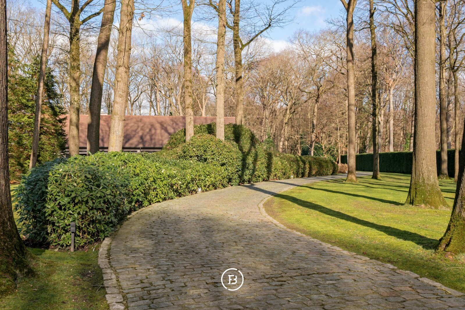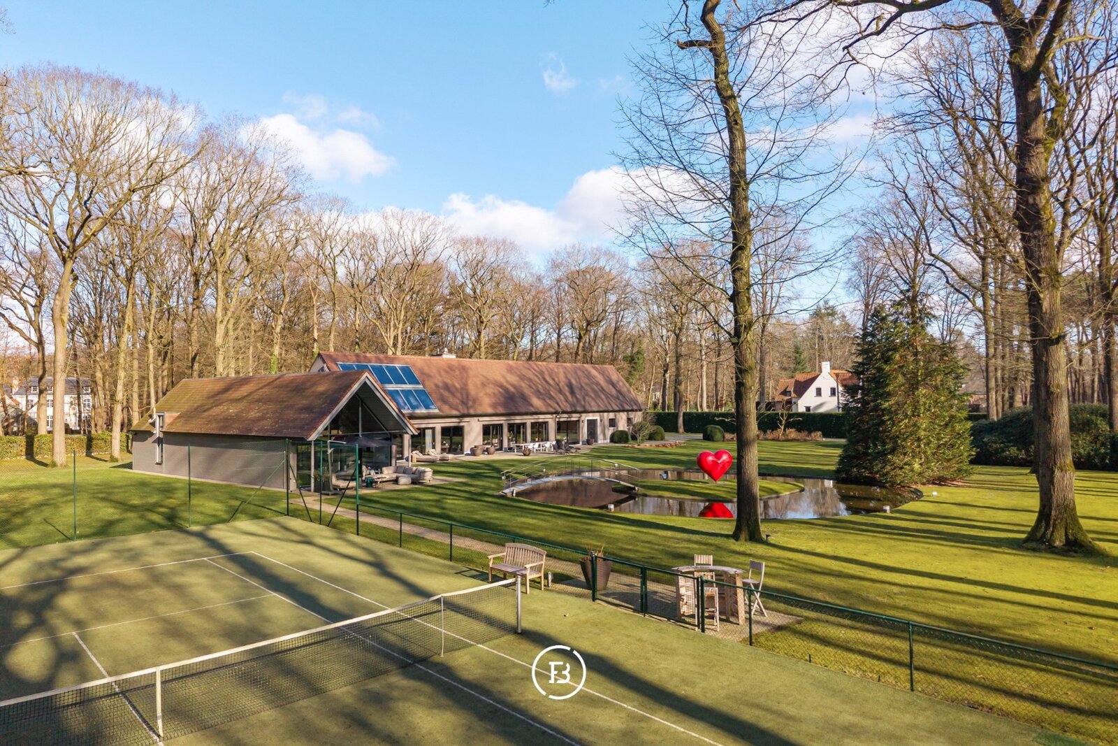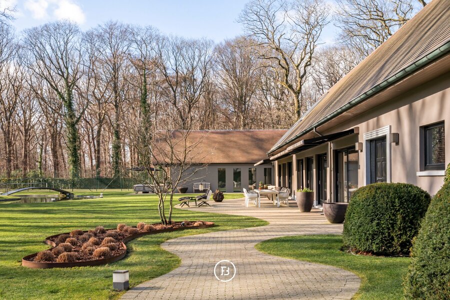 Op één van de mooiste en meest gegeerde percelen van het bos, een uitzonderlijk zuidgericht domein van 13.570 m², ligt deze tijdloze villa waar rust, privacy en actief genieten perfect samenkomen. Het terrein wordt gekenmerkt door een zeldzame combinatie van majestueuze bomen en open, lichtrijke ruimtes, waardoor het een parkachtig en tegelijk luchtig karakter krijgt. Het omheinde perceel is bereikbaar via een indrukwekkende oprijlaan en ontvouwt zich als een privépark met vijver en een tennisplein in kunstgras.