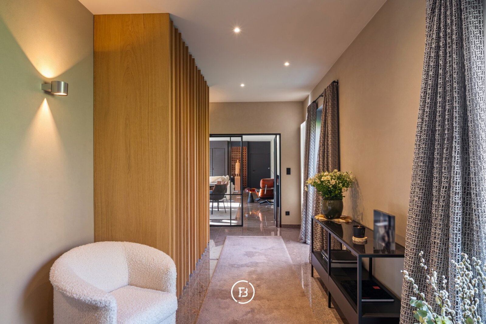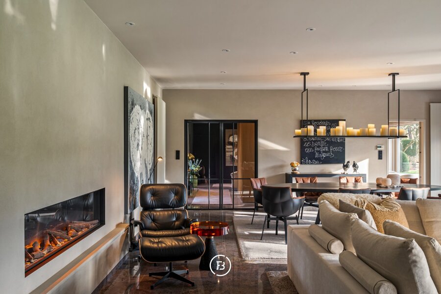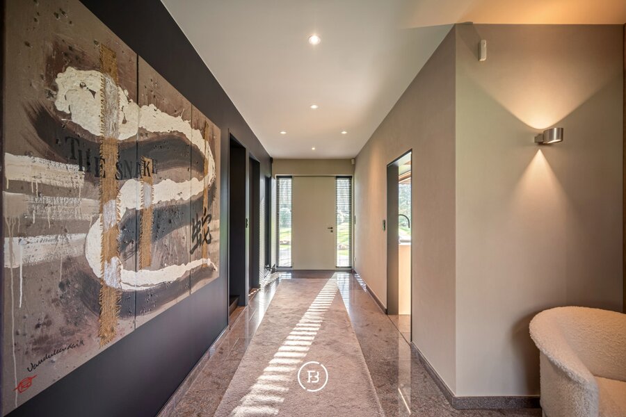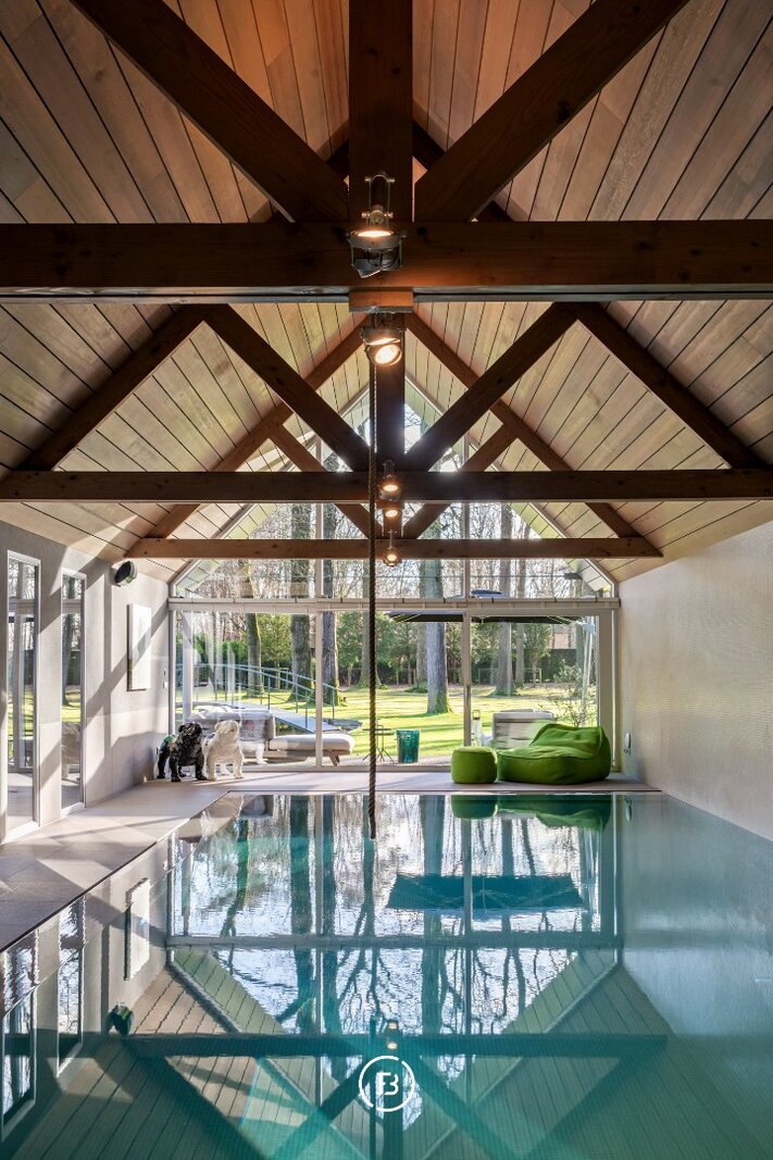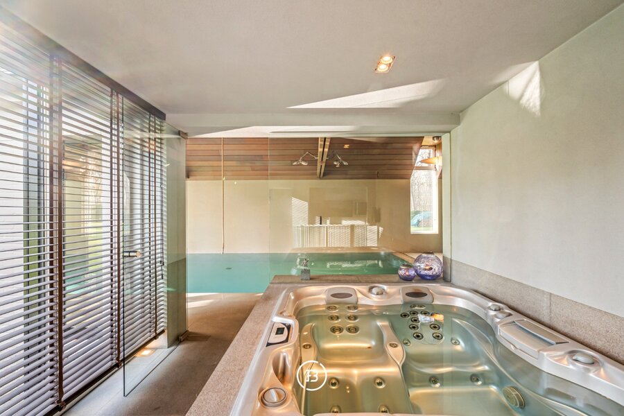 Het gelijkvloers biedt een vernieuwde keuken die naadloos overgaat in de leefruimte met sfeervolle haard, een master bedroom met badkamer en directe toegang tot het wellnessgedeelte met binnenzwembad, jacuzzi en douche, bereikbaar via de slaapkamer én een aparte gang. Verder is er nog een slaapkamer met eigen sanitaire voorzieningen, uitgevend op een patio, een grote berging en een ruime dubbele garage.