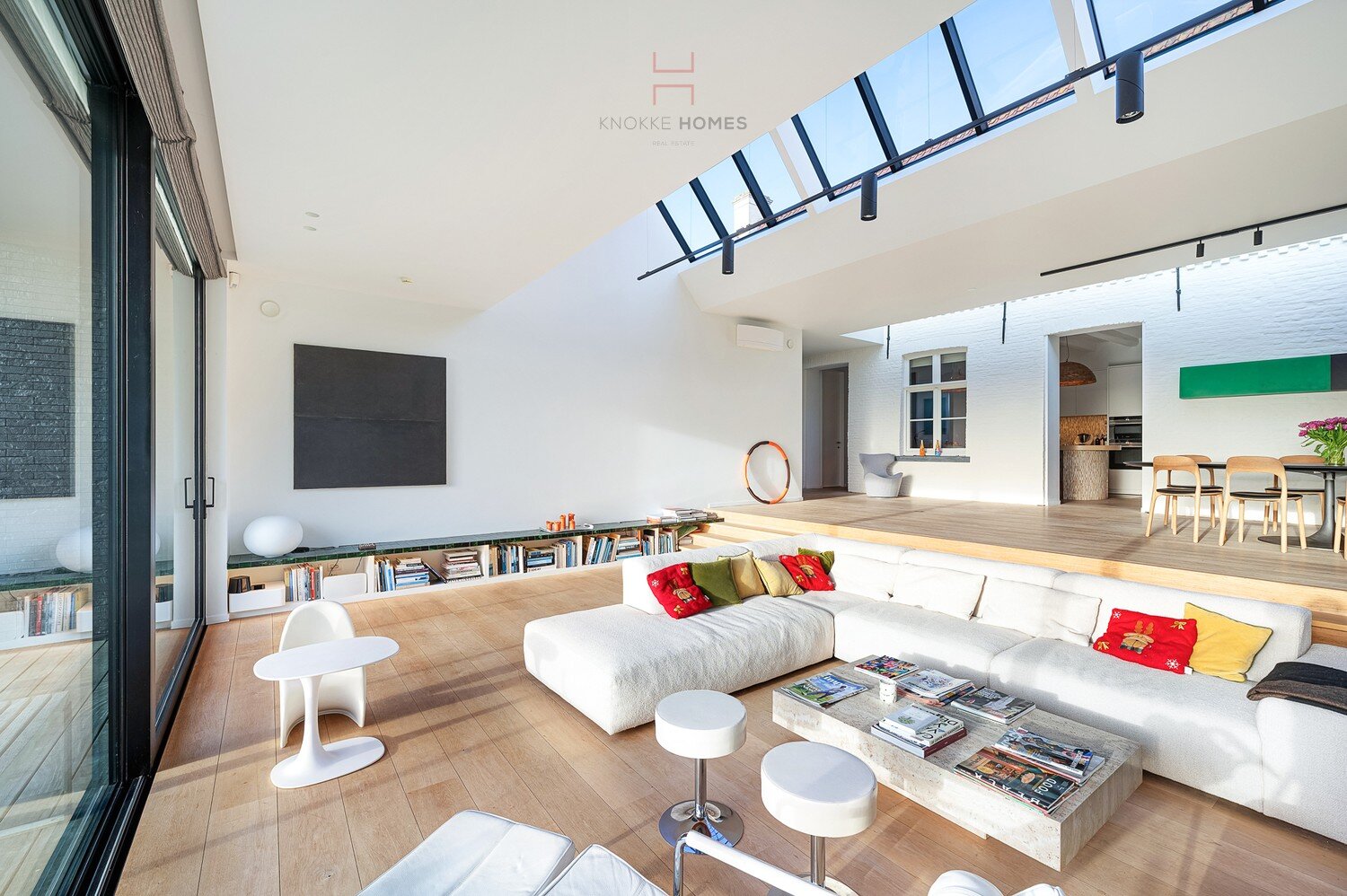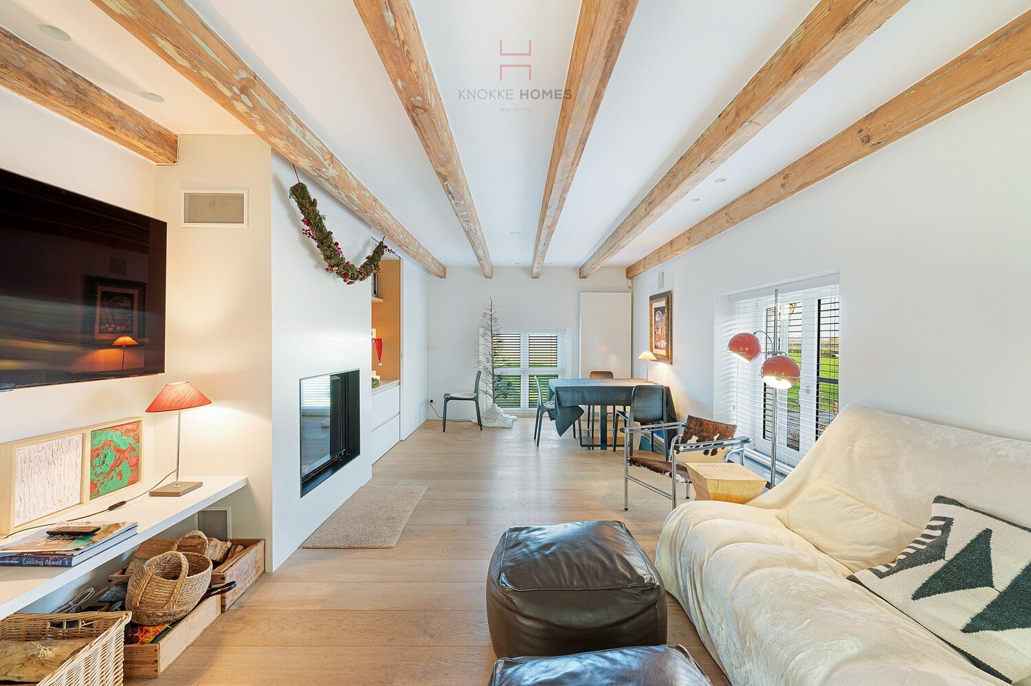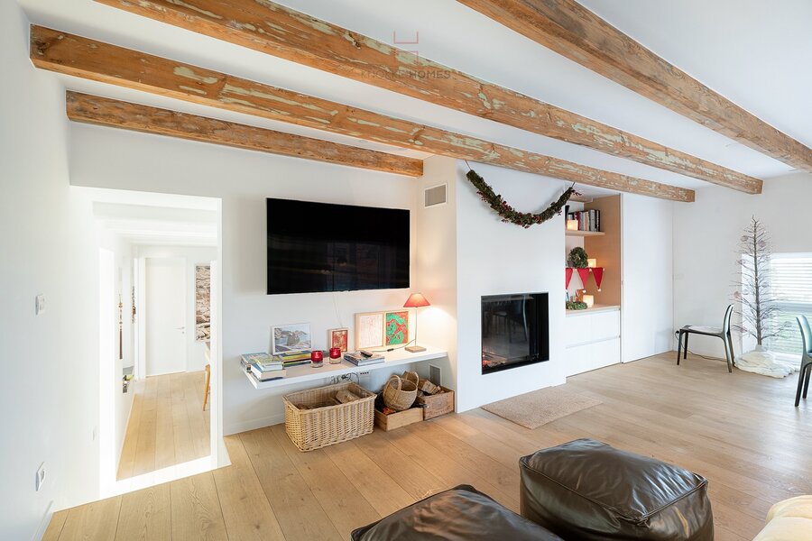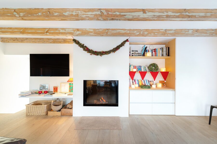 Een charmante tussenverdieping doet dienst als intieme tv- en leeshoek met open haard — een perfecte plek om tot rust te komen.