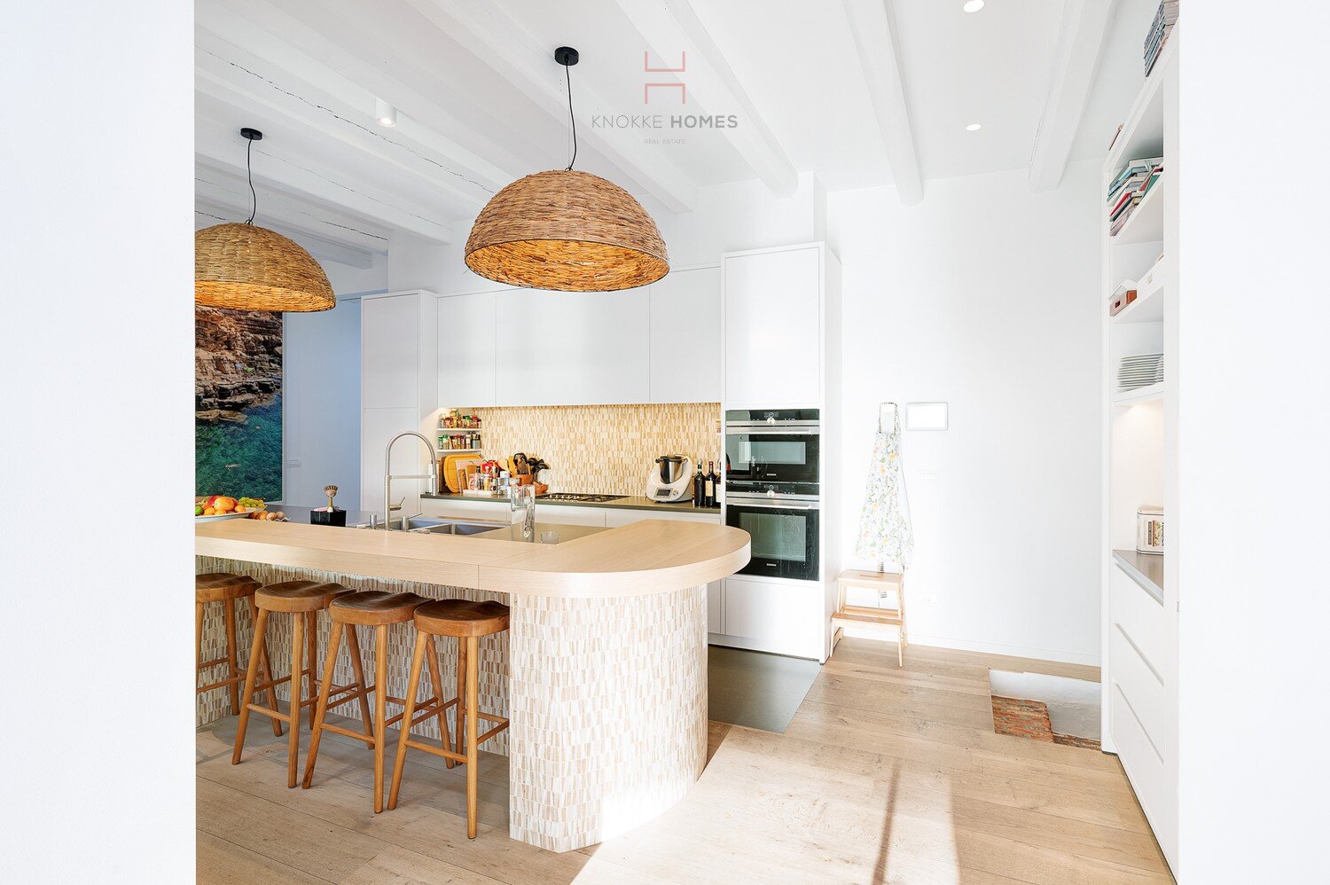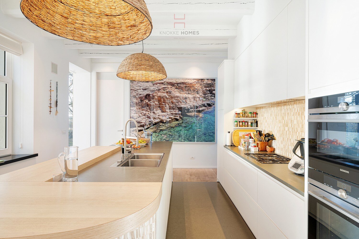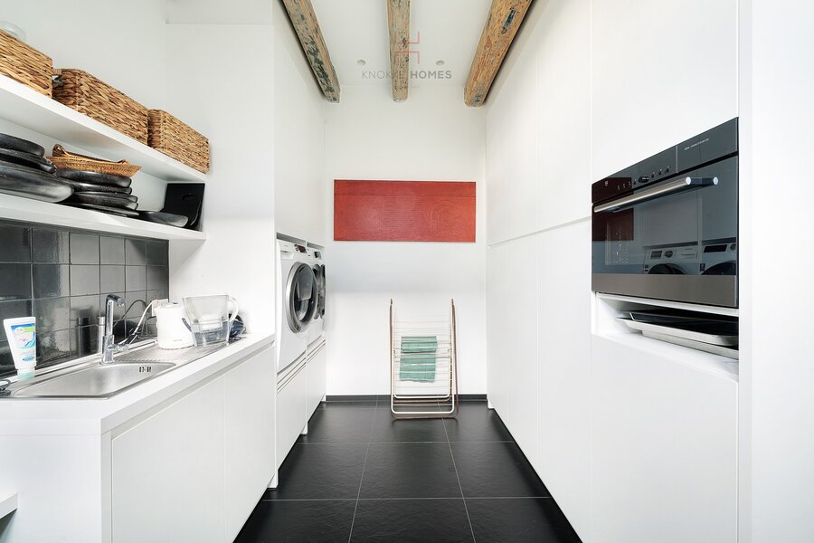Via de inkomhal met vestiaire en gastentoilet bereikt u de royale leefruimte waar grote glaspartijen het omliggende landschap als een levend schilderij binnenbrengen. De open eet- en zithoek sluiten naadloos aan op de luxueuze leefkeuken met kookeiland, afgewerkt in hoogwaardige materialen en voorzien van alle comfort. Aansluitend bevindt zich een praktische bijkeuken.
