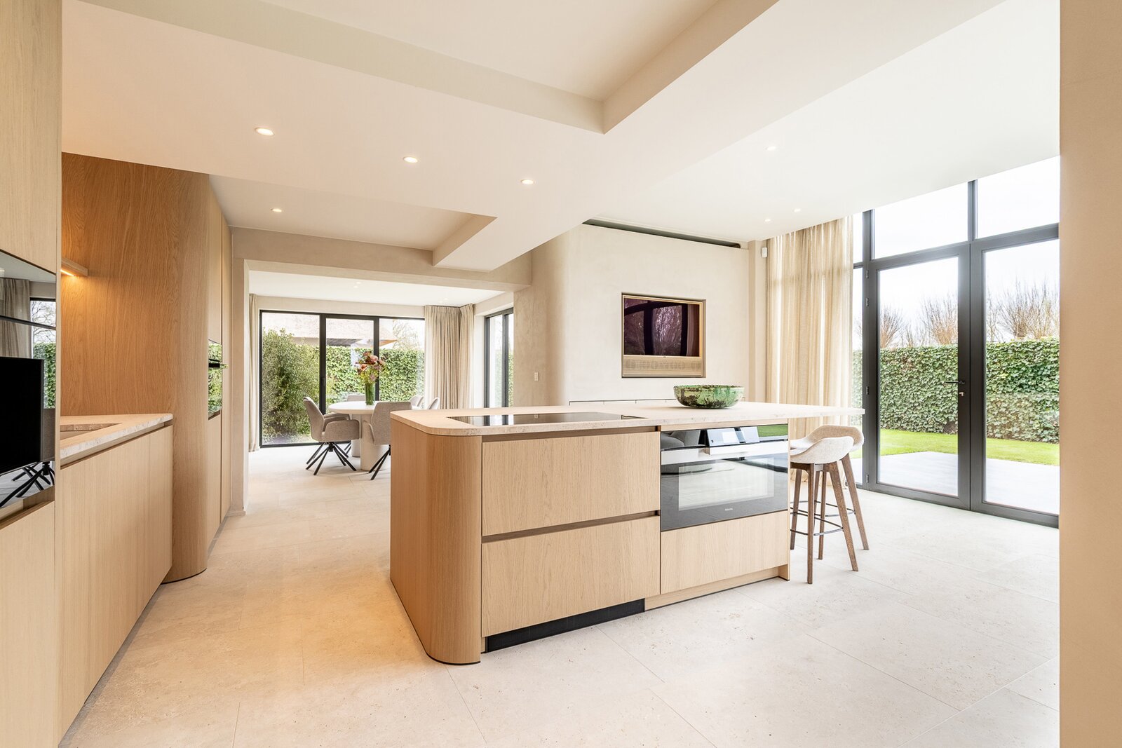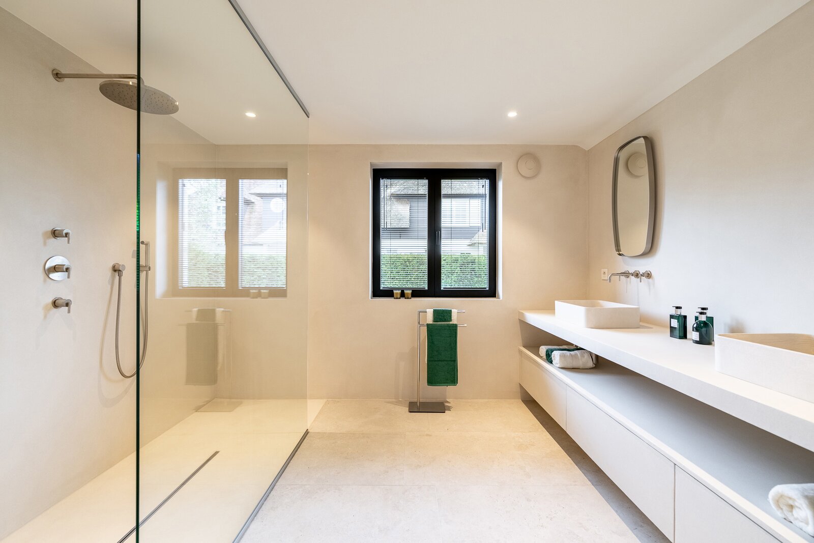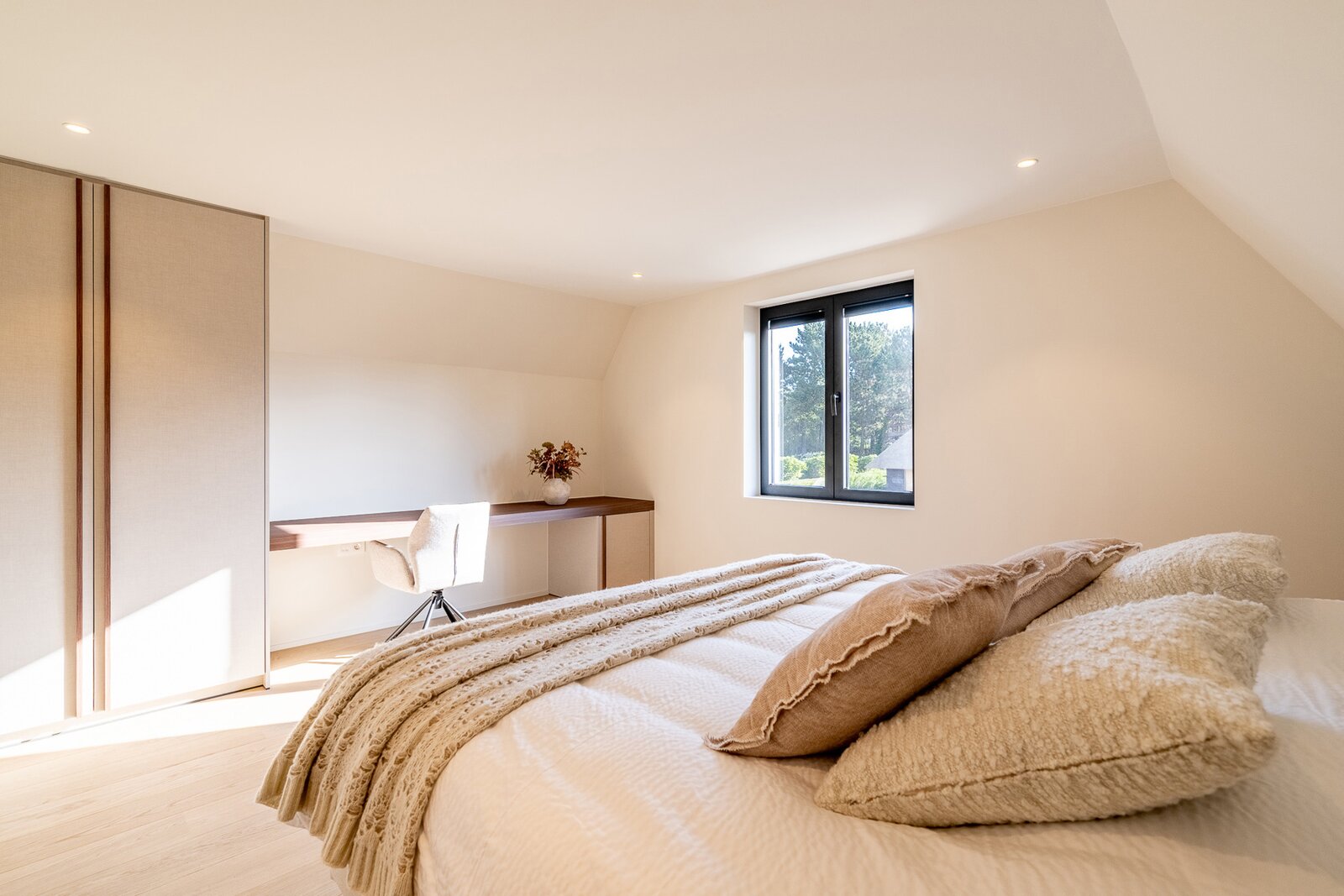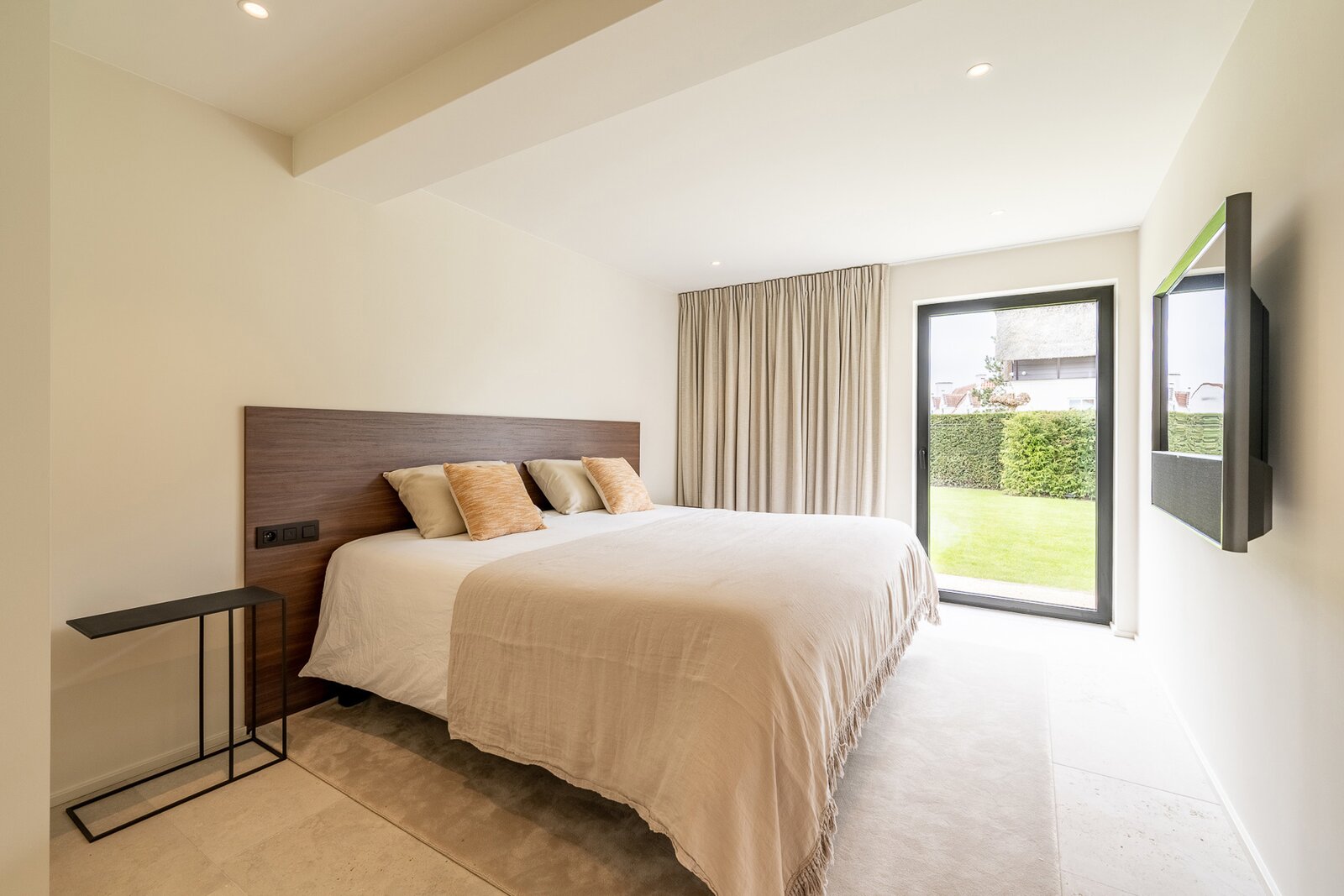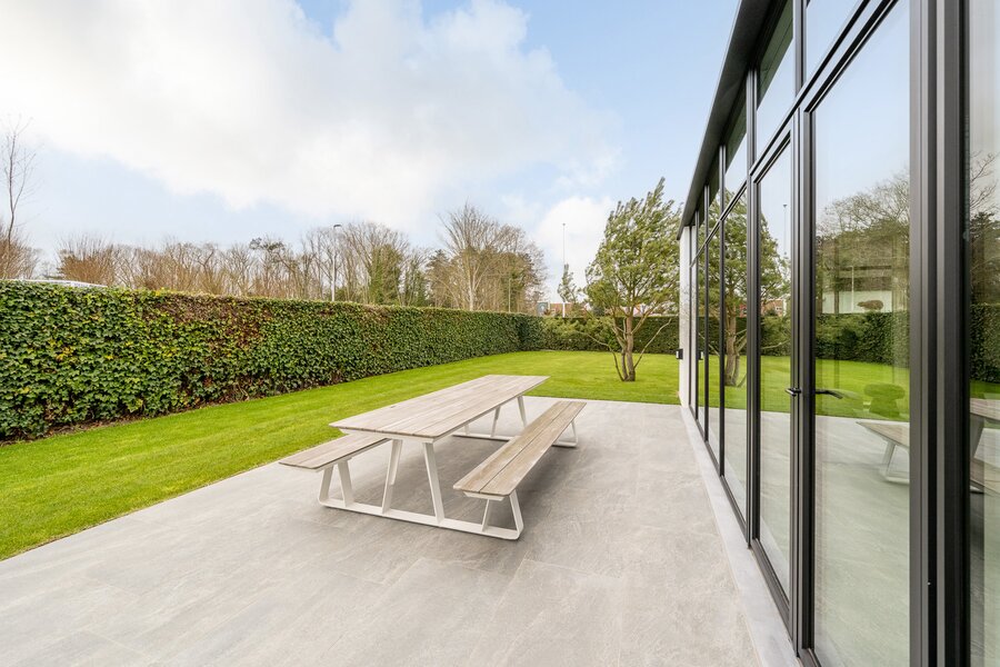 De lichtrijke leef- en eetruimte sluit naadloos aan op de volledig uitgeruste leefkeuken, die voorzien is van vloerverwarming en airconditioning. Vanuit hier heb je toegang tot het zonnige terras en de prachtig aangelegde tuin. Op het gelijkvloers bevindt zich ook de master bedroom met ensuite dressing, badkamer en apart toilet, wat een bijzonder praktisch en luxueus comfort biedt.