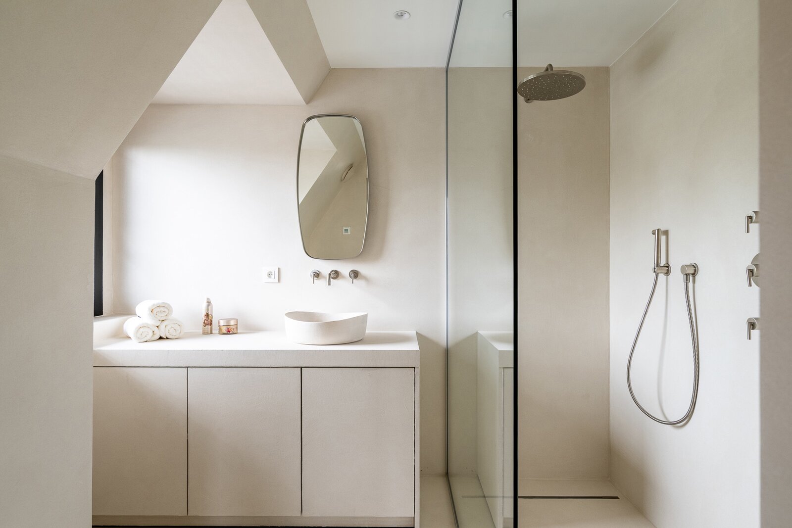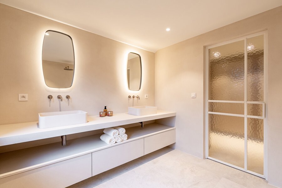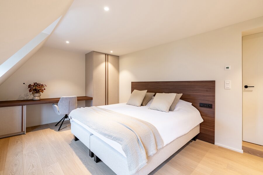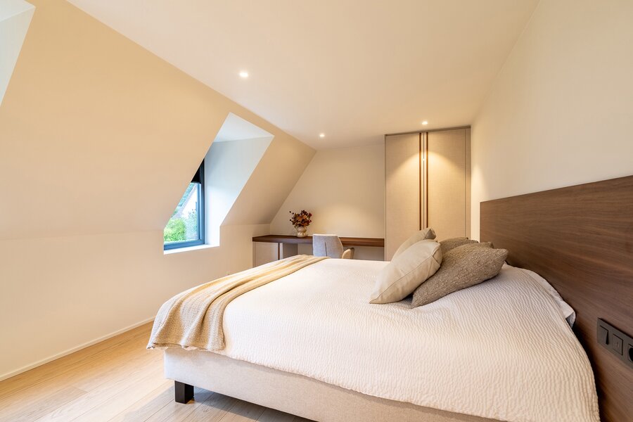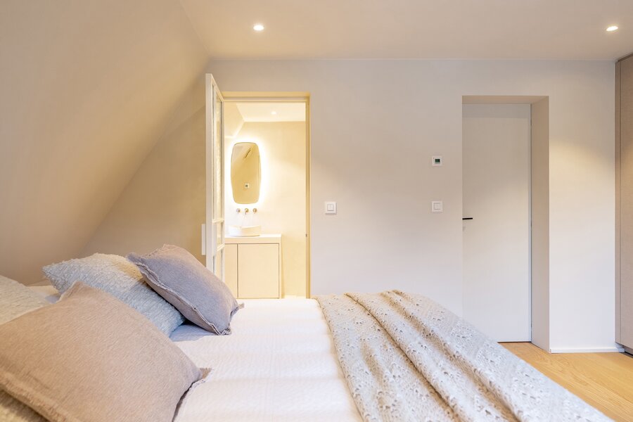 De bovenverdieping telt drie ruime slaapkamers, elk met een eigen douchekamer en toilet. Daarnaast is er een praktische wasplaats met ingebouwde kasten, die indien gewenst ook als baby- of logeerkamer kan worden ingericht. Via de nachthal is er toegang tot de royale zolder, die extra mogelijkheden biedt.