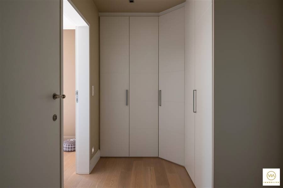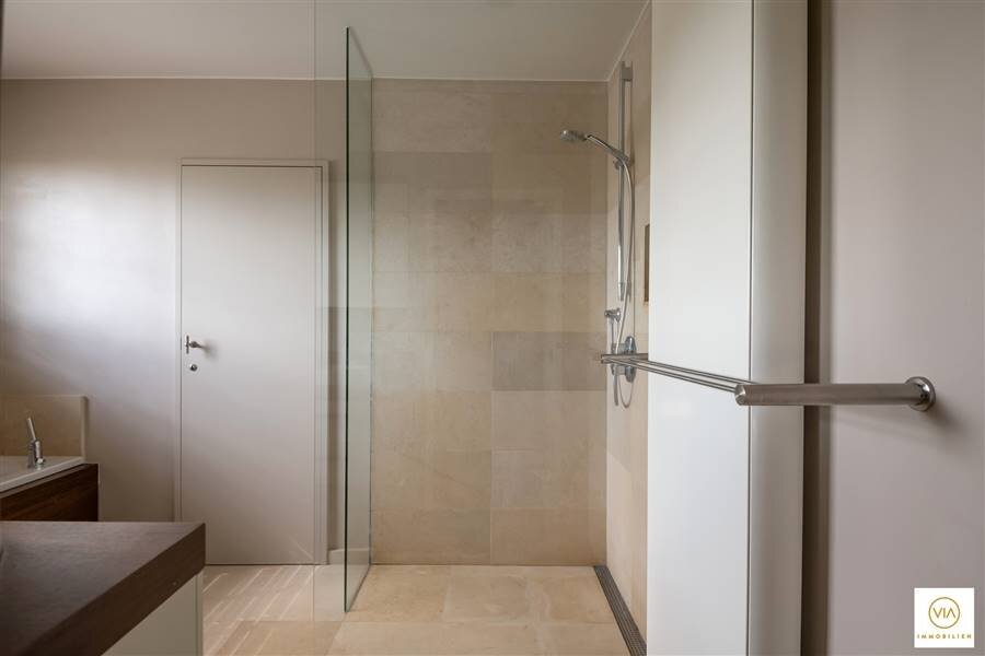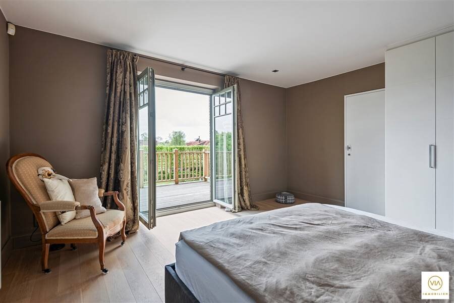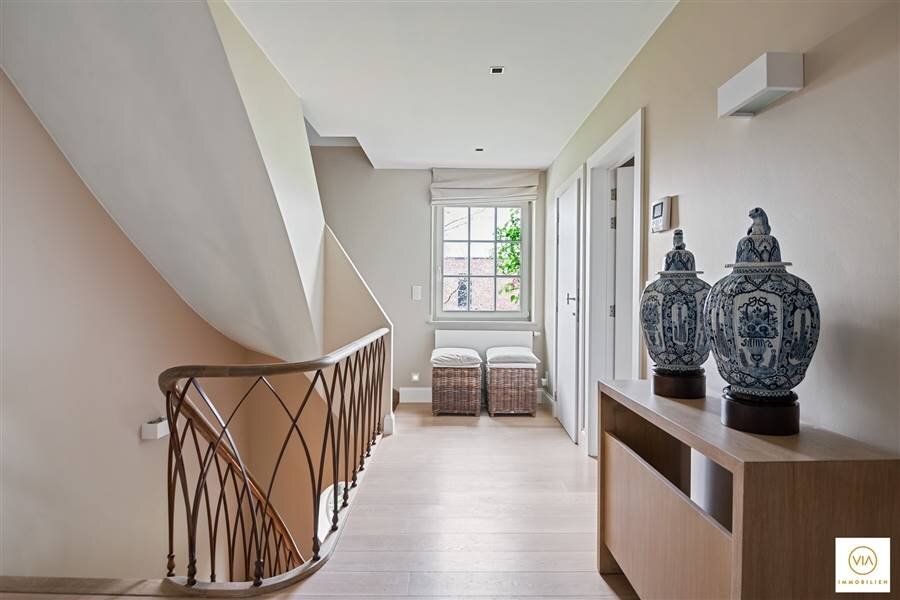 Op de eerste verdieping treffen we een subliem mastersuite (inloopdressing, badkamer en kamer) met aansluitend ruim terras. Twee ruime slaapkamers met inbouwkasten en een tweede mooie badkamer. Aparte strijk-en waskamer.