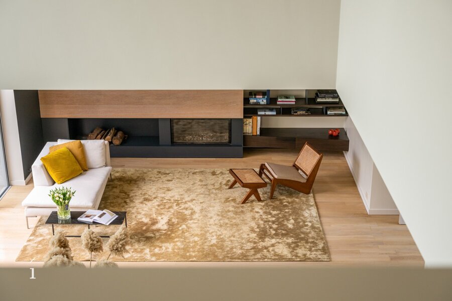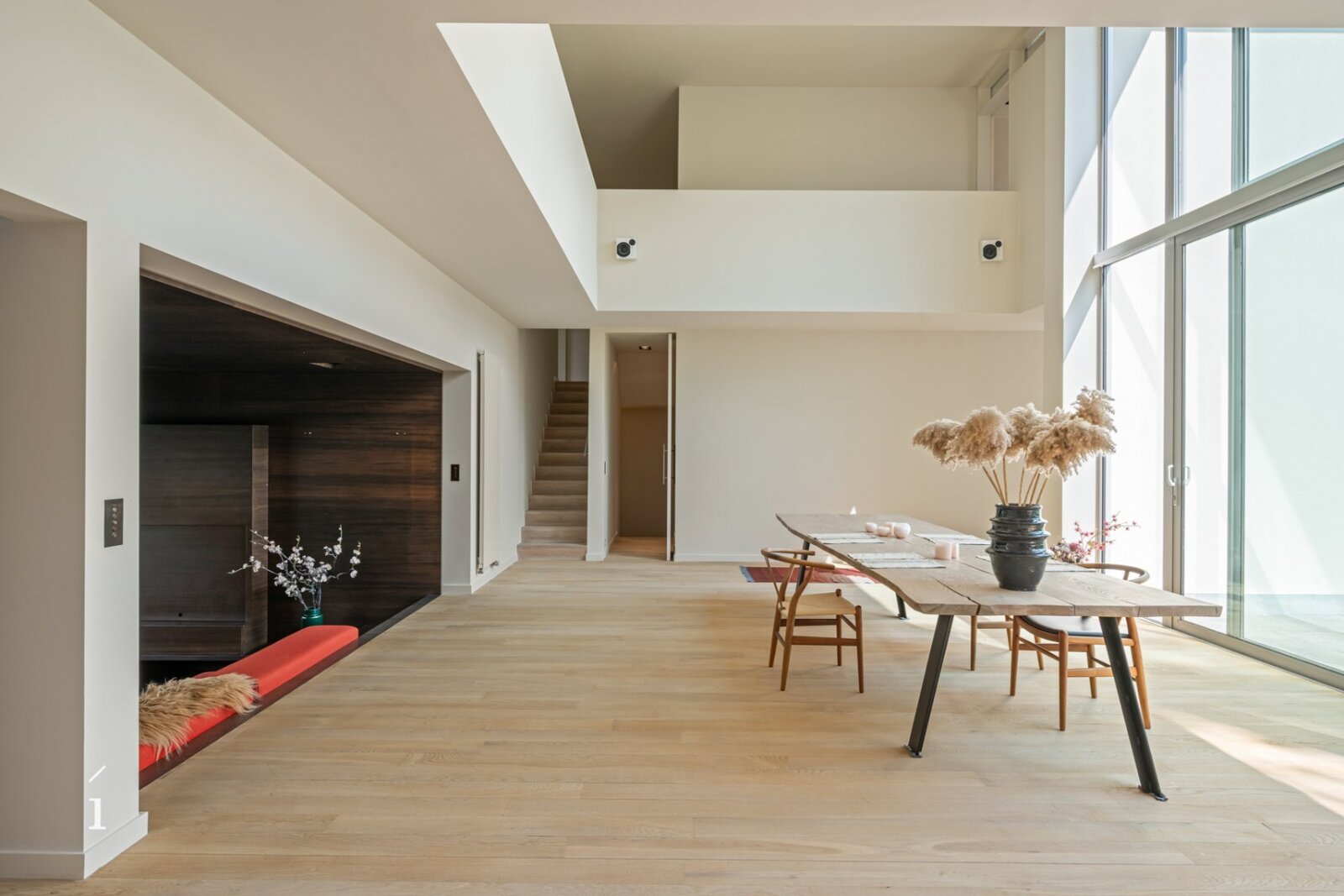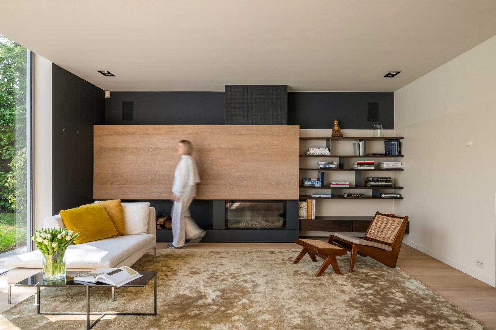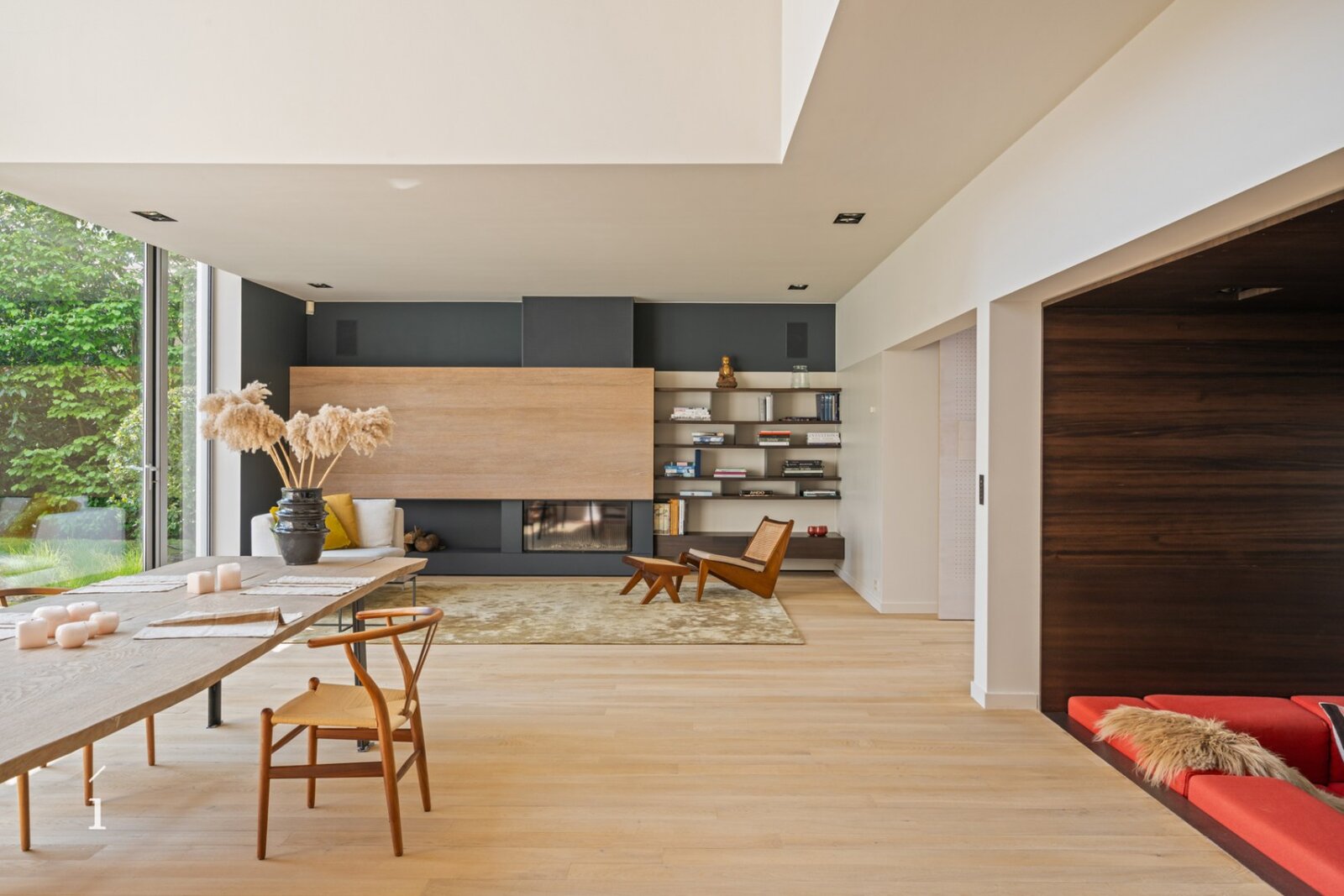 De ruime inkomhal zet meteen de toon met een vestiaire, gastentoilet en bureau . De leefruimtes zijn ontworpen met oog voor harmonie: de woonkamer, met zijn sfeervolle open haard, vloeit naadloos over in de eetkamer waar plafondhoge raampartijen en een indrukwekkende vide zorgen voor een adembenemend zicht op de tuin. Het intieme loungegedeelte in verzonken niveau creëert een gezellige cocon, perfect voor sfeervolle avonden met familie en vrienden.