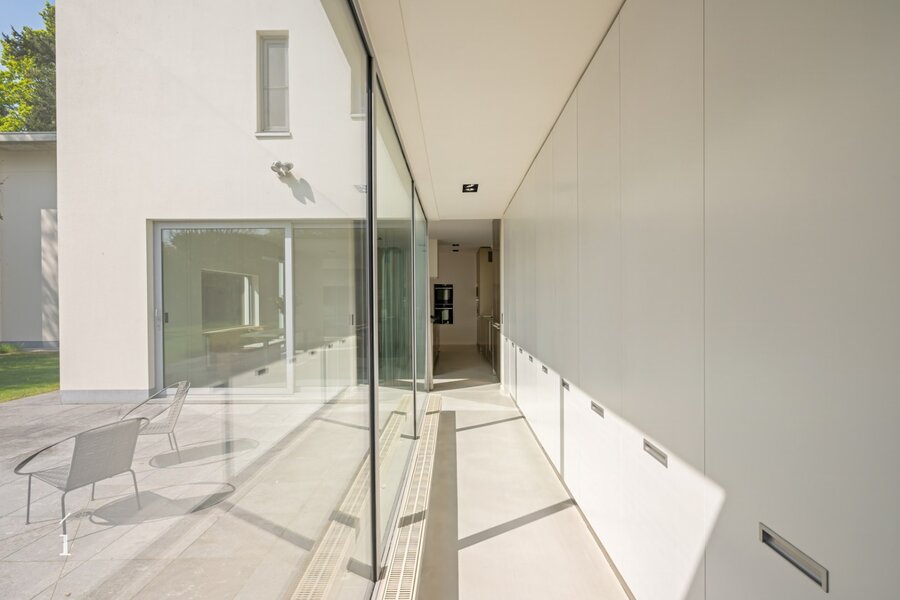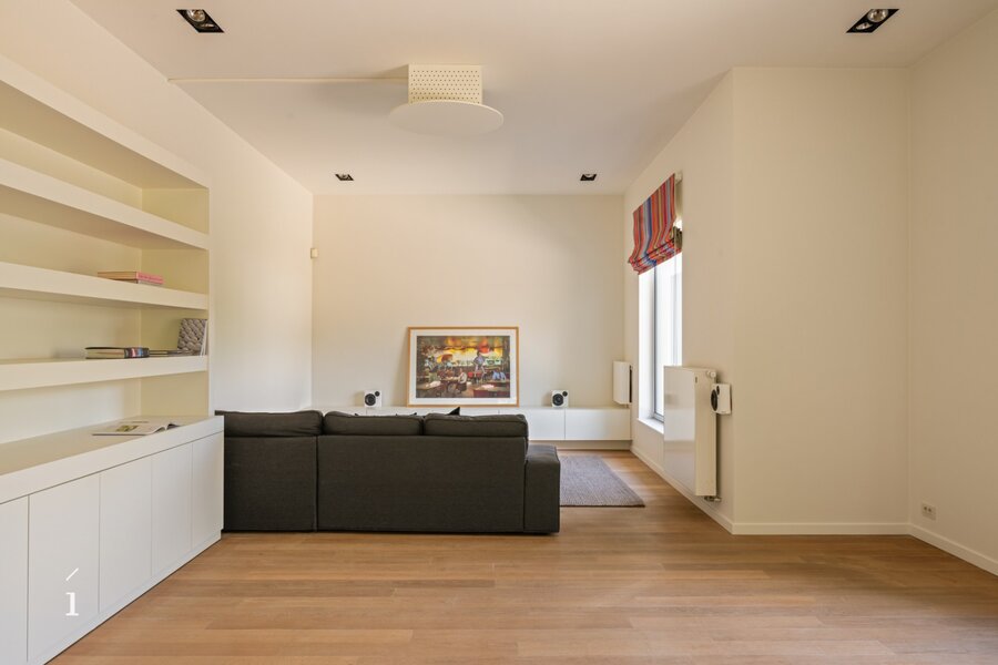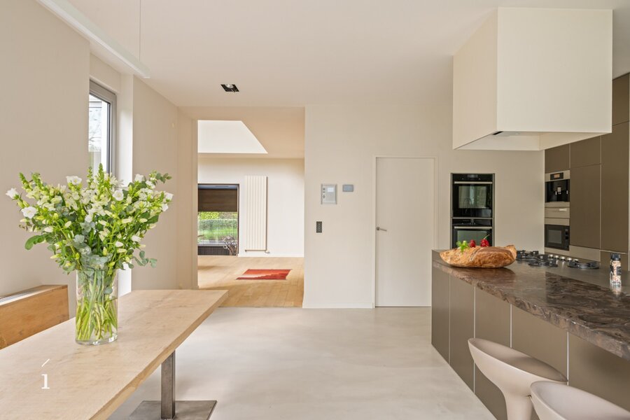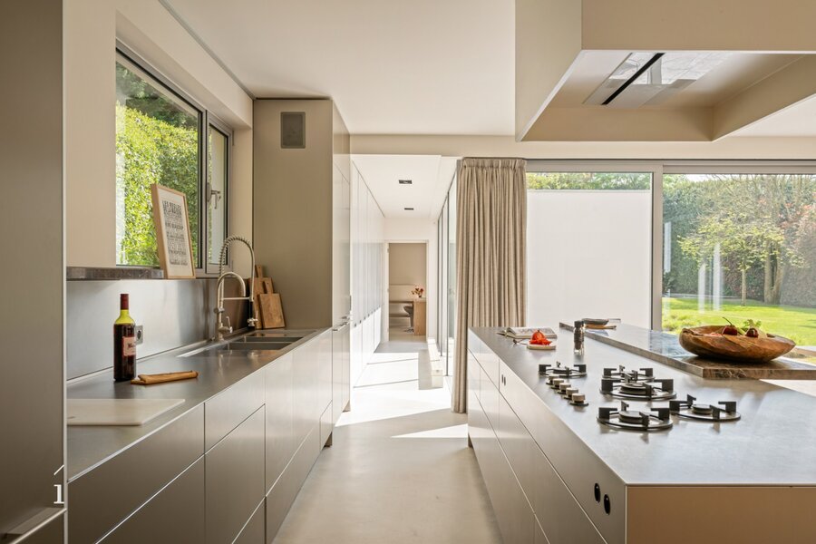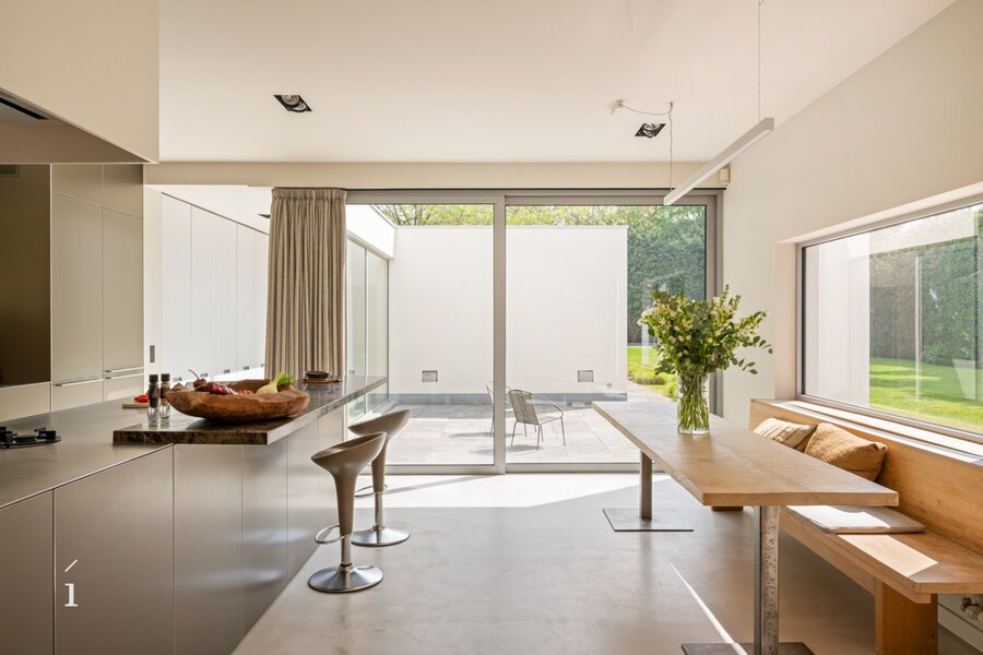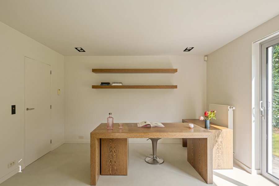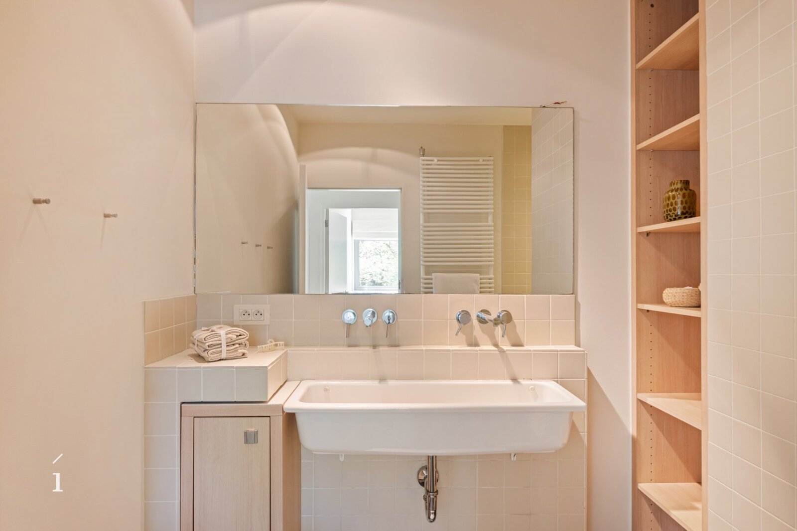 De aparte ingang met mudroom, extra vestiaire en toilet benadrukt het praktische comfort van deze woning. De keuken is een absolute blikvanger: een Bulthaup-keuken in champagnekleur, volledig uitgerust met hoogwaardige toestellen en een uitnodigende eetplaats. Via de keuken bereikt u een zonnig, intiem terras – perfect voor een ontbijt in de ochtendzon of een sfeervol aperitiefmoment.
