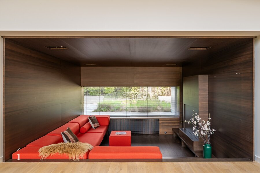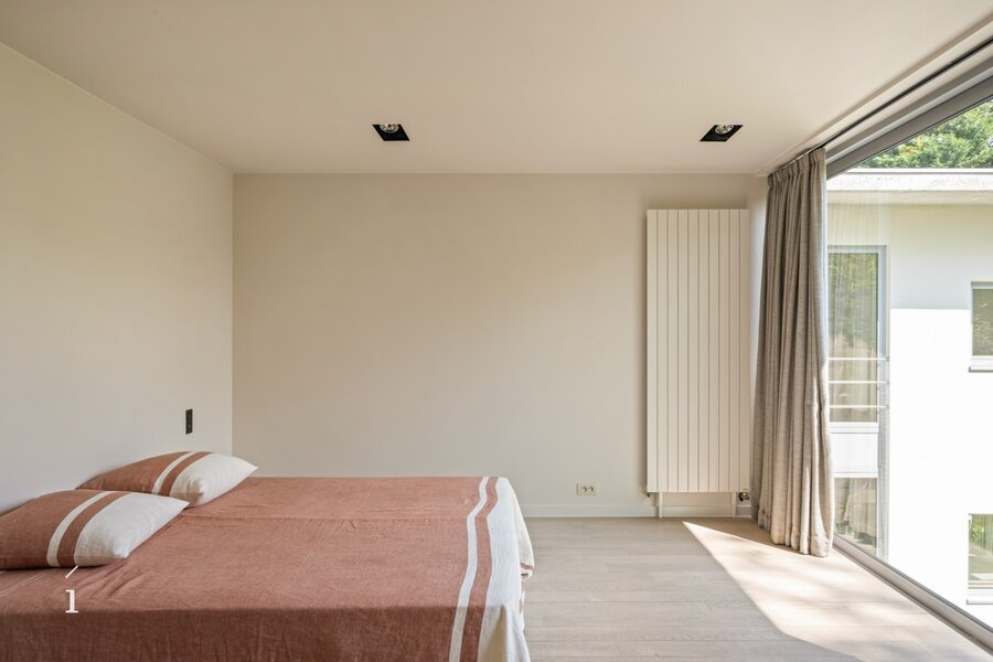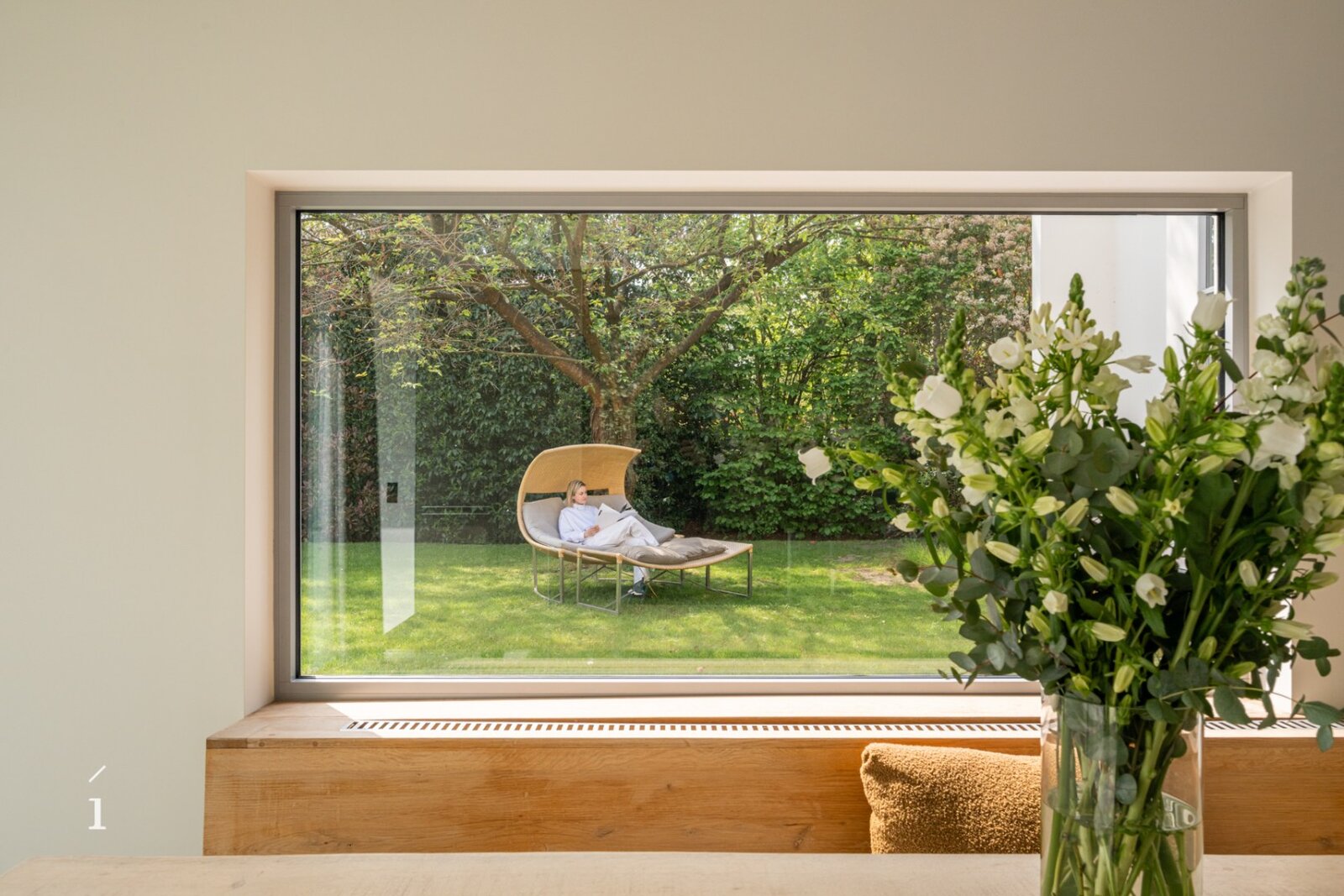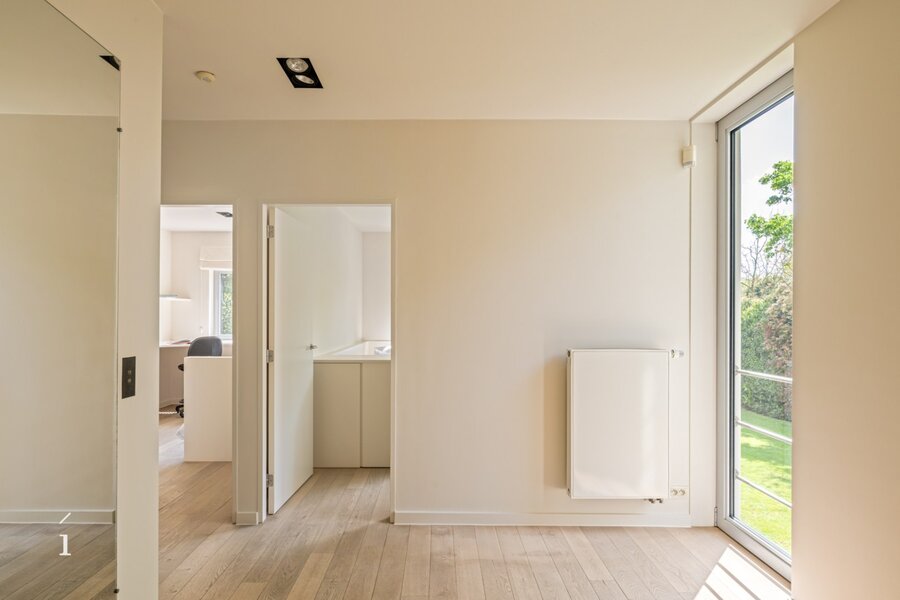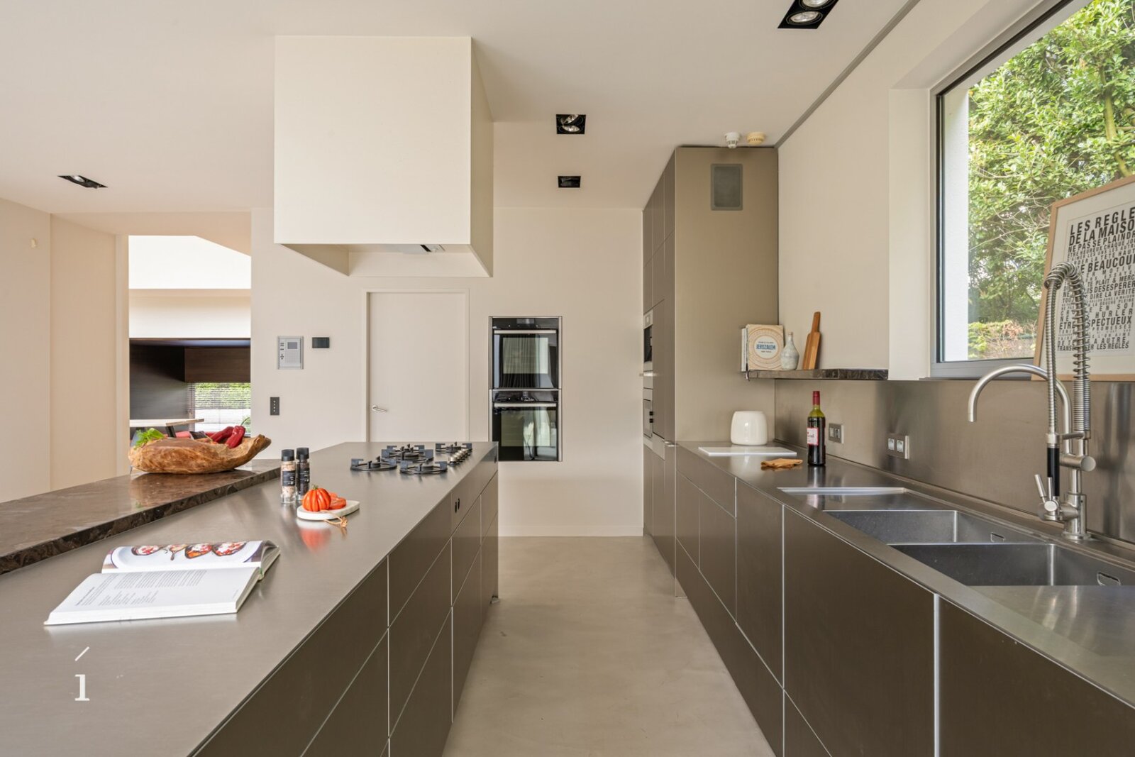 De aparte ingang met mudroom, extra vestiaire en toilet benadrukt het praktische comfort van deze woning. De keuken is een absolute blikvanger: een Bulthaup-keuken in champagnekleur, volledig uitgerust met hoogwaardige toestellen en een uitnodigende eetplaats. Via de keuken bereikt u een zonnig, intiem terras – perfect voor een ontbijt in de ochtendzon of een sfeervol aperitiefmoment.