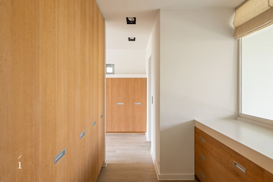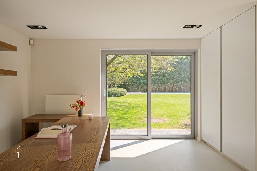 Een lichtrijke gang met maatkasten leidt naar een polyvalente ruimte met toegang tot het poolhouse. Deze veelzijdige ruimte biedt talloze mogelijkheden: van hobby- of ontspanningsruimte tot kantoor, gastenverblijf of nanny-verblijf.