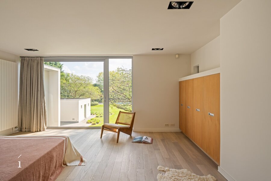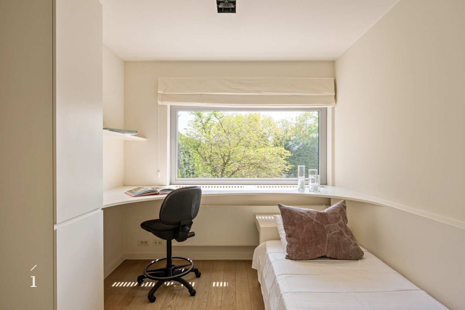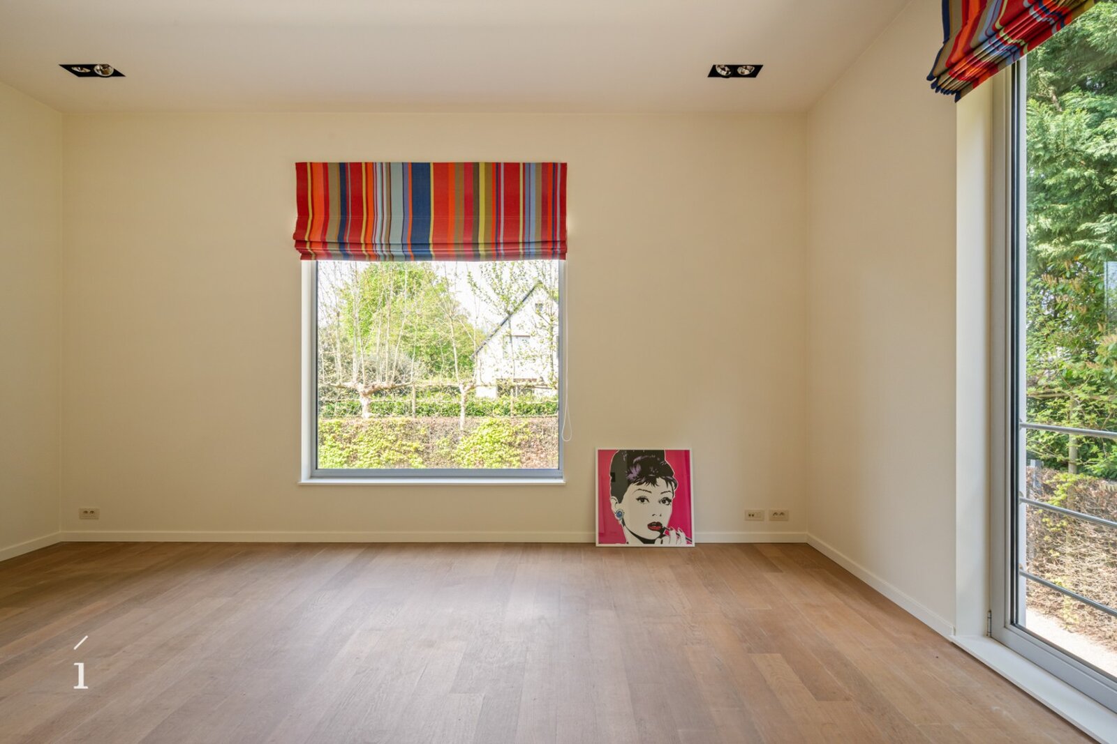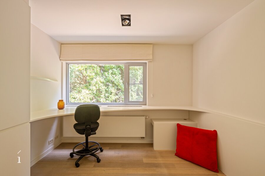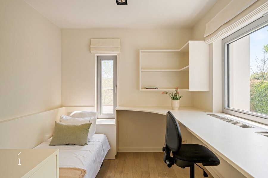 Op de eerste verdieping bevindt zich een imposante ontspannings- of vergaderruimte met hoge plafonds, momenteel ingericht als homecinema. De ouderlijke suite is royaal voorzien en bestaat uit een slaapkamer, een luxueuze badkamer met bad en douche, en een op maat gemaakte dressing. Daarnaast zijn er drie volwaardige kinderkamers, elk met ingebouwde kasten en bureaus, die samen een douchekamer delen. De nachthal met zicht op de vide versterkt het licht- en ruimtegevoel.