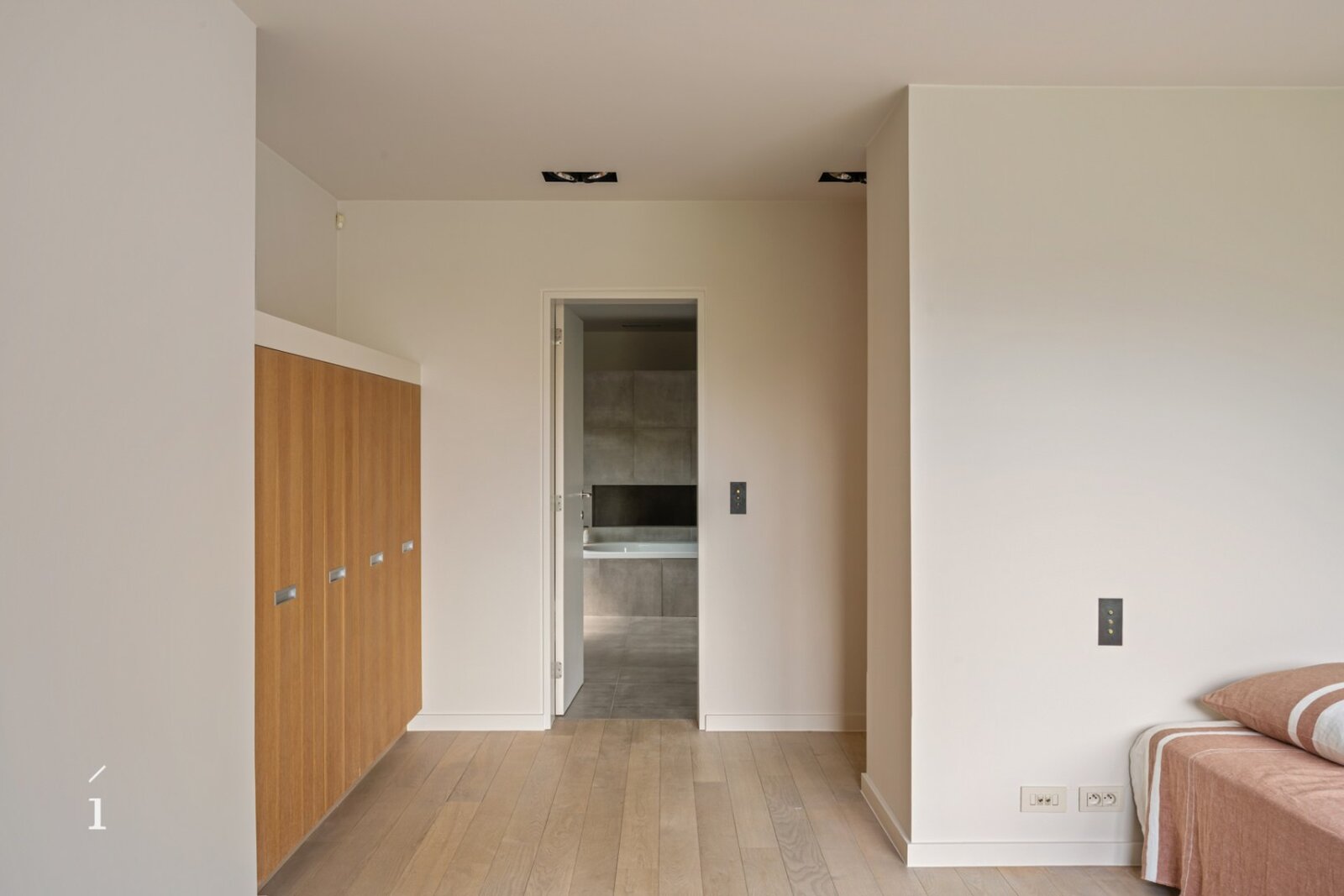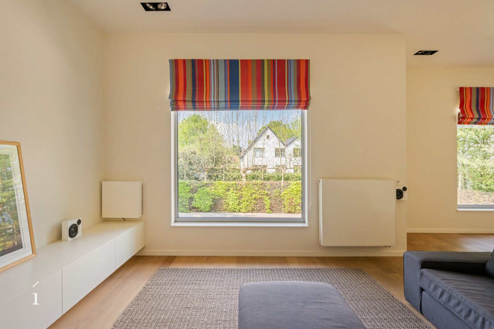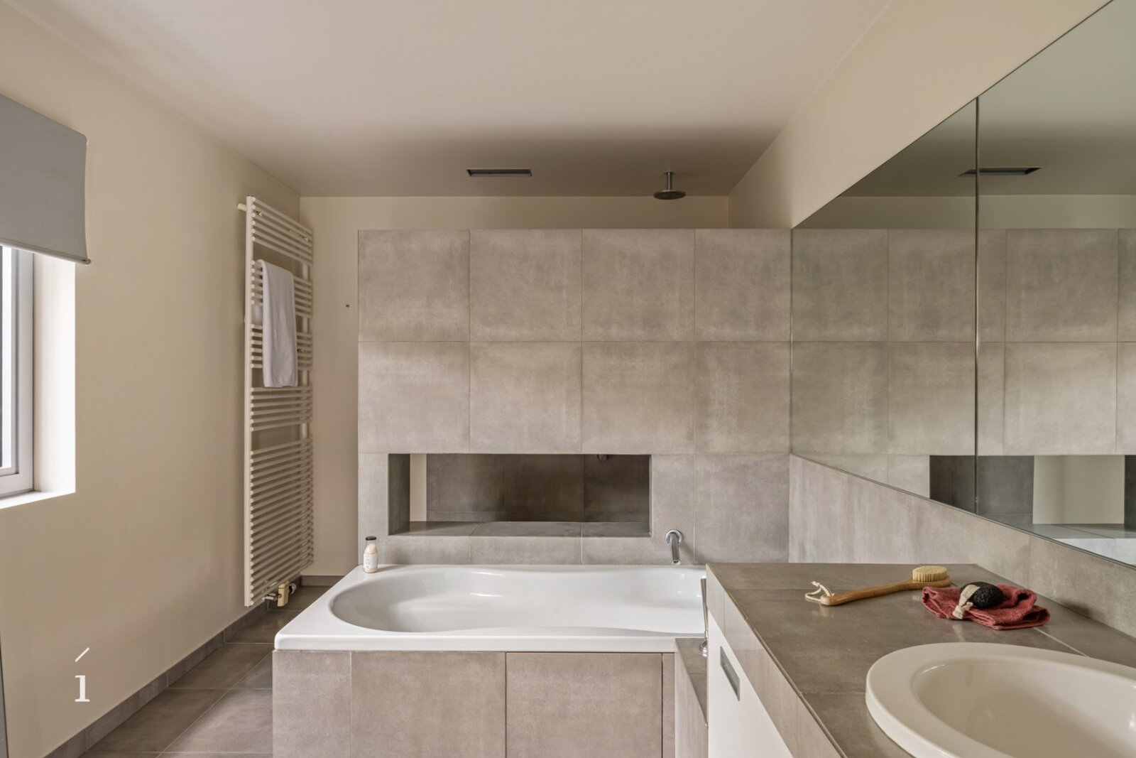 Op de eerste verdieping bevindt zich een imposante ontspannings- of vergaderruimte met hoge plafonds, momenteel ingericht als homecinema. De ouderlijke suite is royaal voorzien en bestaat uit een slaapkamer, een luxueuze badkamer met bad en douche, en een op maat gemaakte dressing. Daarnaast zijn er drie volwaardige kinderkamers, elk met ingebouwde kasten en bureaus, die samen een douchekamer delen. De nachthal met zicht op de vide versterkt het licht- en ruimtegevoel.