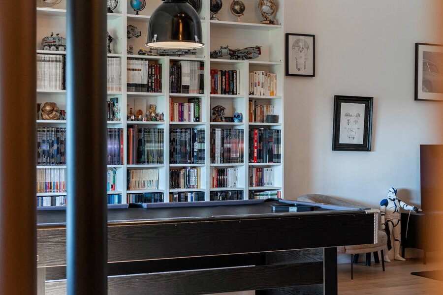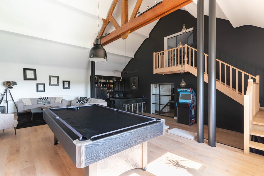 À l’étage, le hall de nuit dessert 5 chambres, une salle de douche et une salle de bain. Un remarquable espace détente de 70m² avec bar et salon TV mène à une suite parentale au 2e étage, composée d’une chambre, d’un dressing et d’une salle de bain.