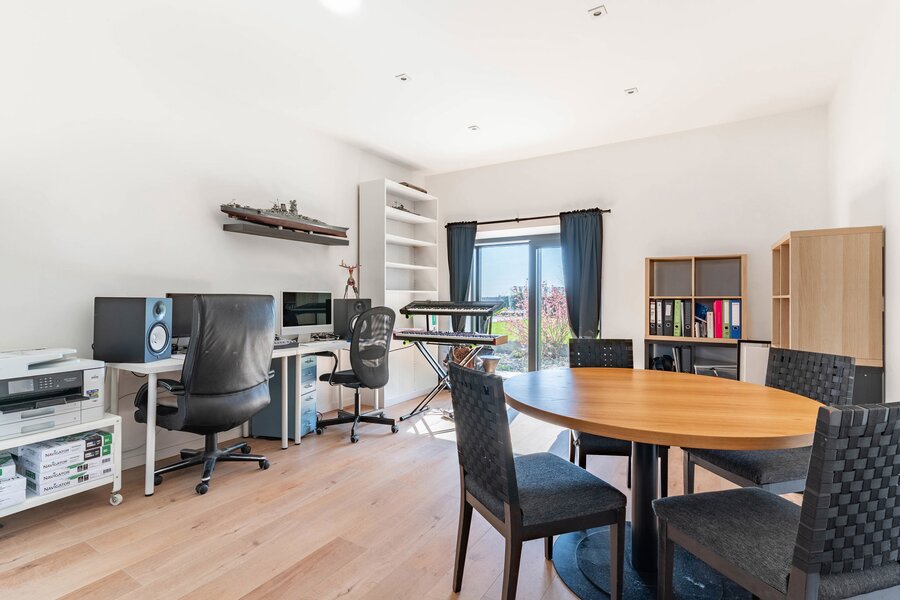 Le rez-de-chaussée s’ouvre sur un vaste et lumineux séjour de 69m² avec salon (K7) et salle à manger, prolongé par une élégante cuisine ouverte de 20m² avec accès direct au jardin. Ce niveau comprend également un bureau, une buanderie, un spacieux garage ainsi qu’un espace polyvalent avec entrée indépendante, idéal pour une activité professionnelle ou un logement séparé.
