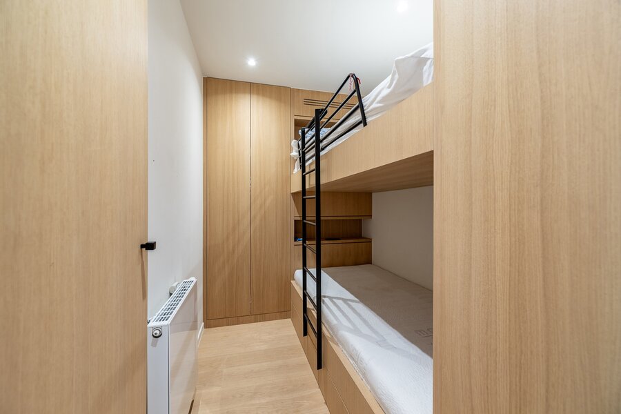 De master bedroom beschikt over ingemaakte kasten, terwijl de tweede slaapkamer is ingericht met stapelbedden.