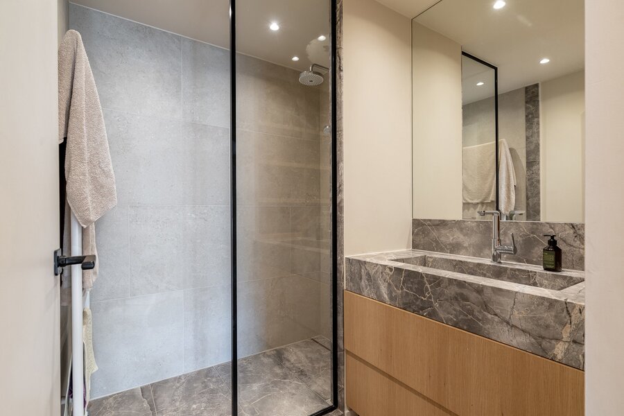 De badkamer is uitgerust met een douche en dubbele lavabo. Wasmachine en droogkast zijn aanwezig.