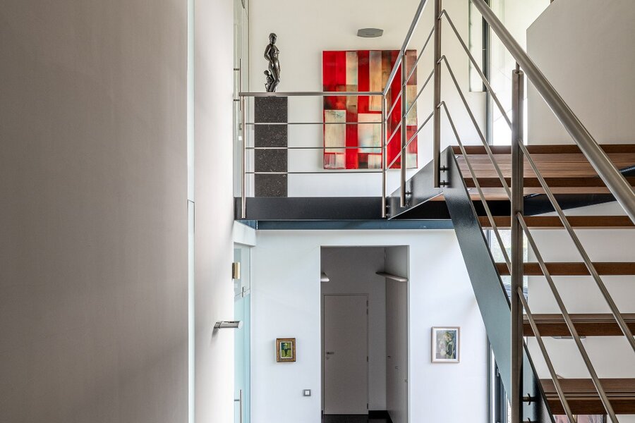 Op het gelijkvloers bevindt zich aan de zijde van de ingang een praktische garage met automatische poort. Aan de tuinzijde opent de woning zich naar een ruim terras met een geïntegreerd zwembad – een ideale plek om te ontspannen en te genieten in alle privacy. Hier vindt u tevens de ruime leefruimte en eetplaats, een bureel, de keuken, een wasplaats en een extra doucheruimte, perfect na een verfrissende duik. De verschillende leefruimtes liggen mooi naast elkaar en communiceren op een subtiele, doordachte manier, wat zorgt voor een open maar toch geborgen gevoel. Bovendien is er een lift aanwezig die u comfortabel van het gelijkvloers naar de eerste verdieping brengt, met directe toegang aan de zijde van de grote slaapkamer.