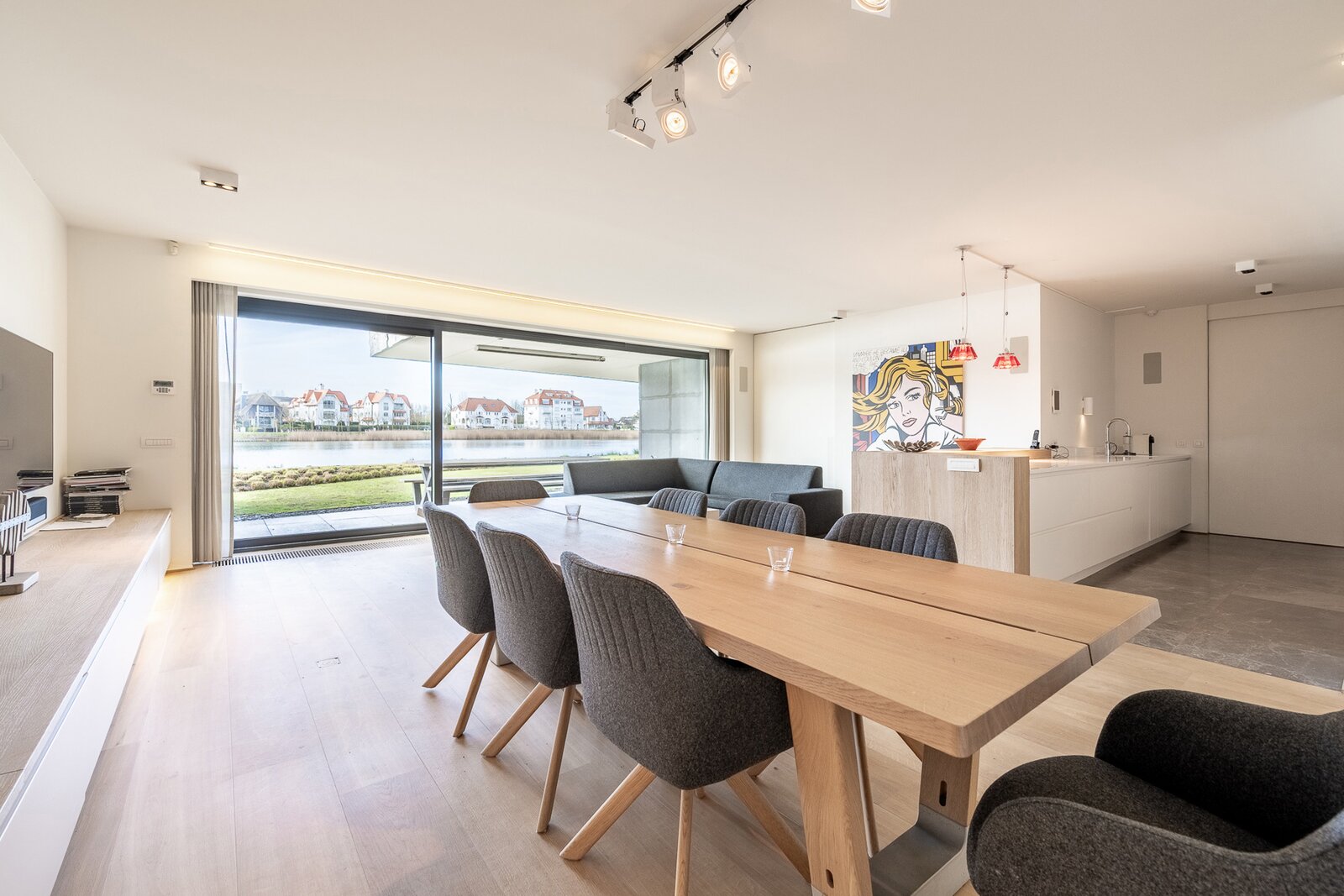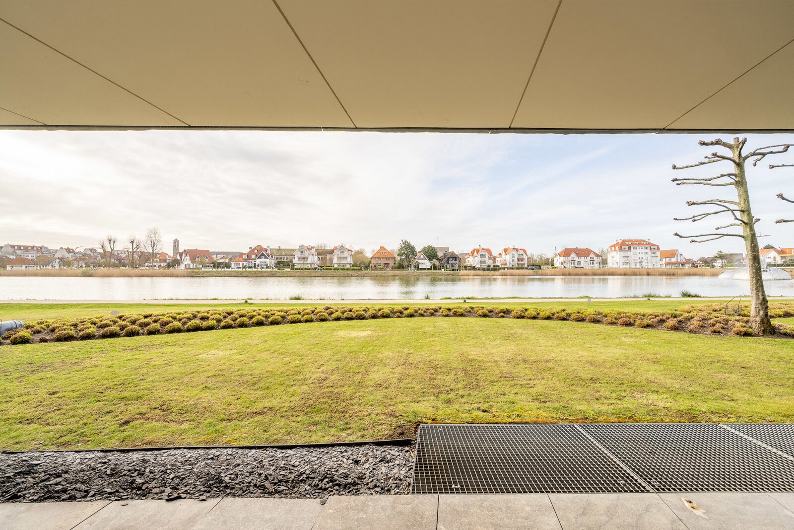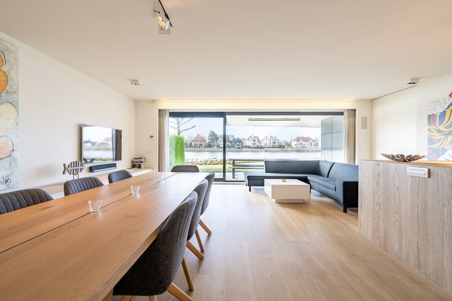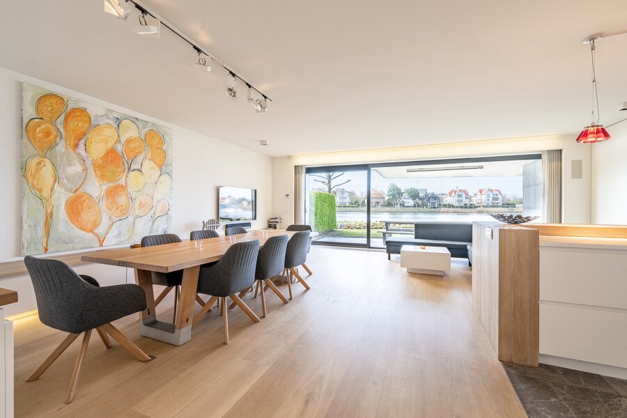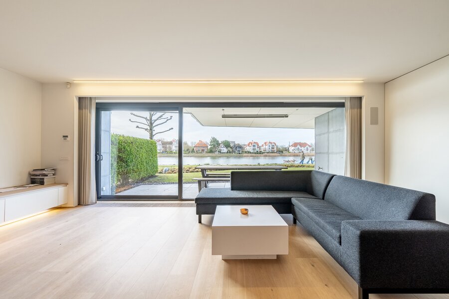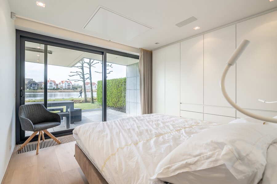 Ruime inkomhal met vestiaire en gastentoilet. Open, volledig uitgeruste leefkeuken met royale eetplaats en lichtrijke woonkamer, beide uitgevend op het meer. Aansluitend bevindt zich een groot overdekt terras met privatieve tuin, voorzien van verwarmingselementen voor optimaal comfort.