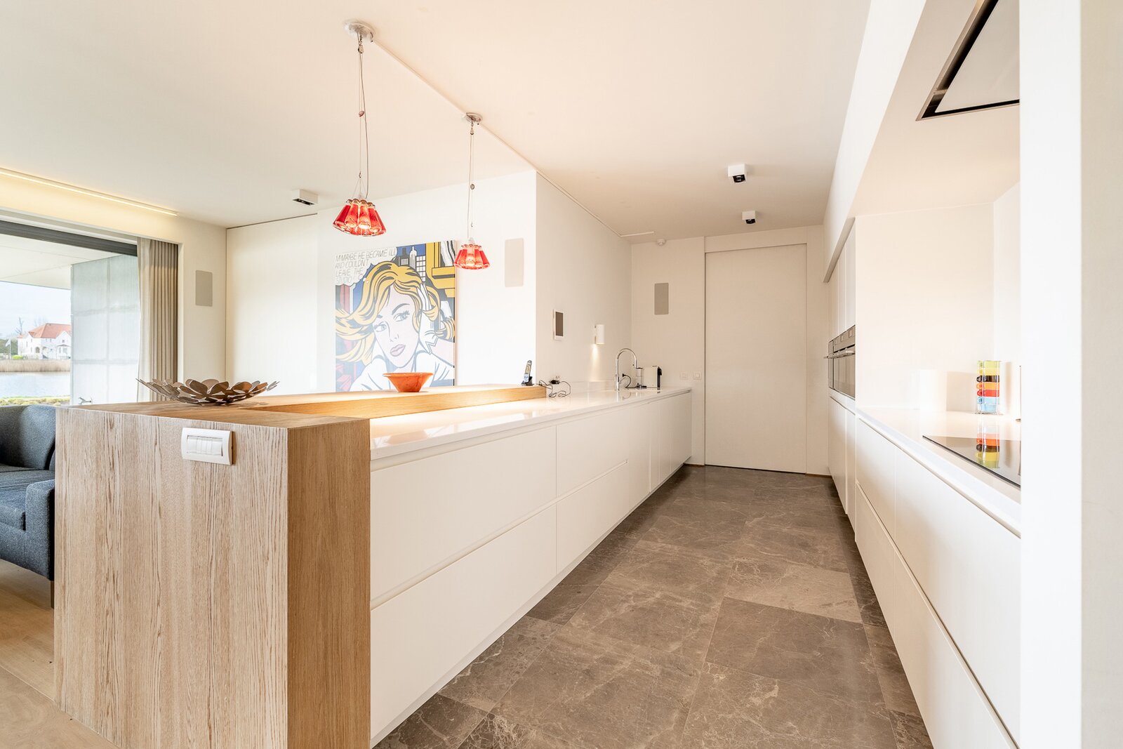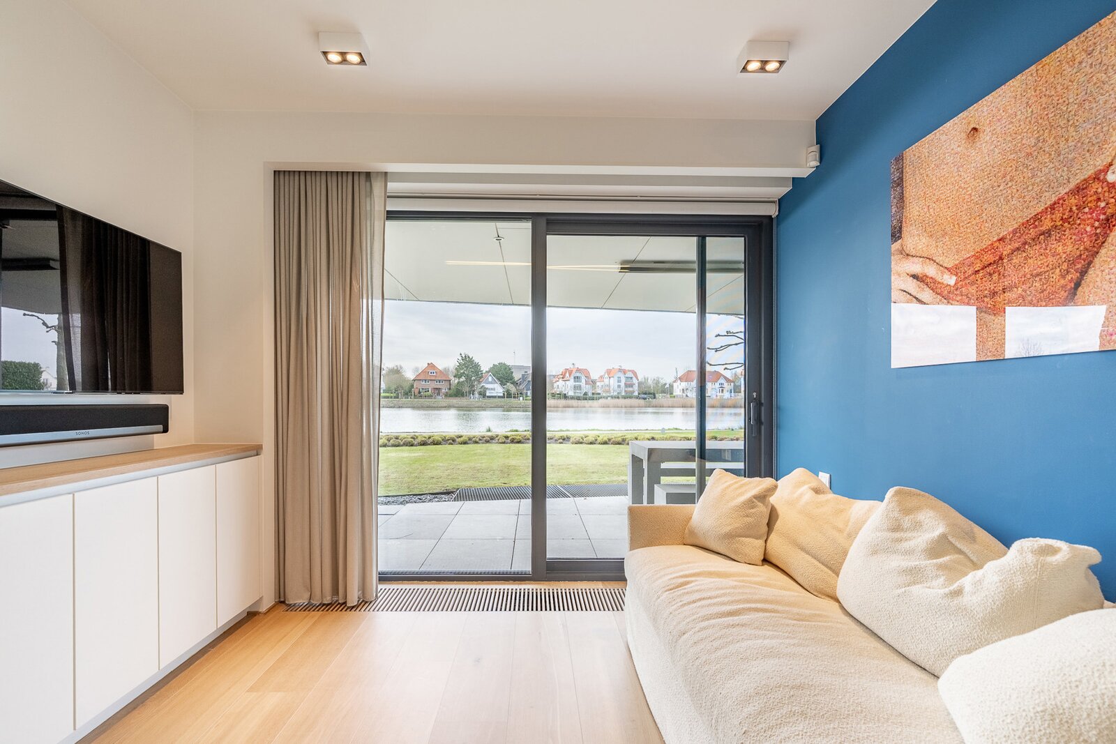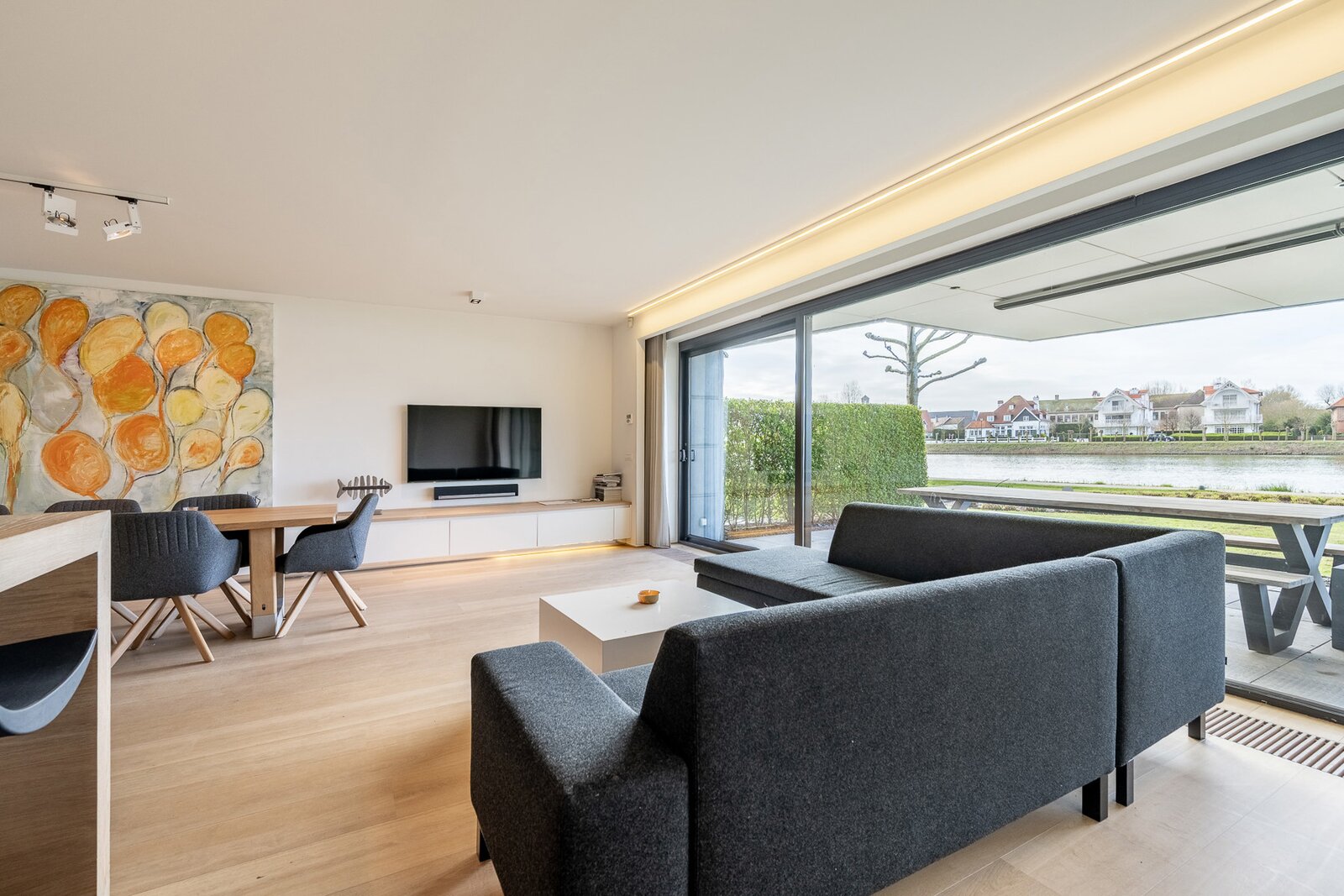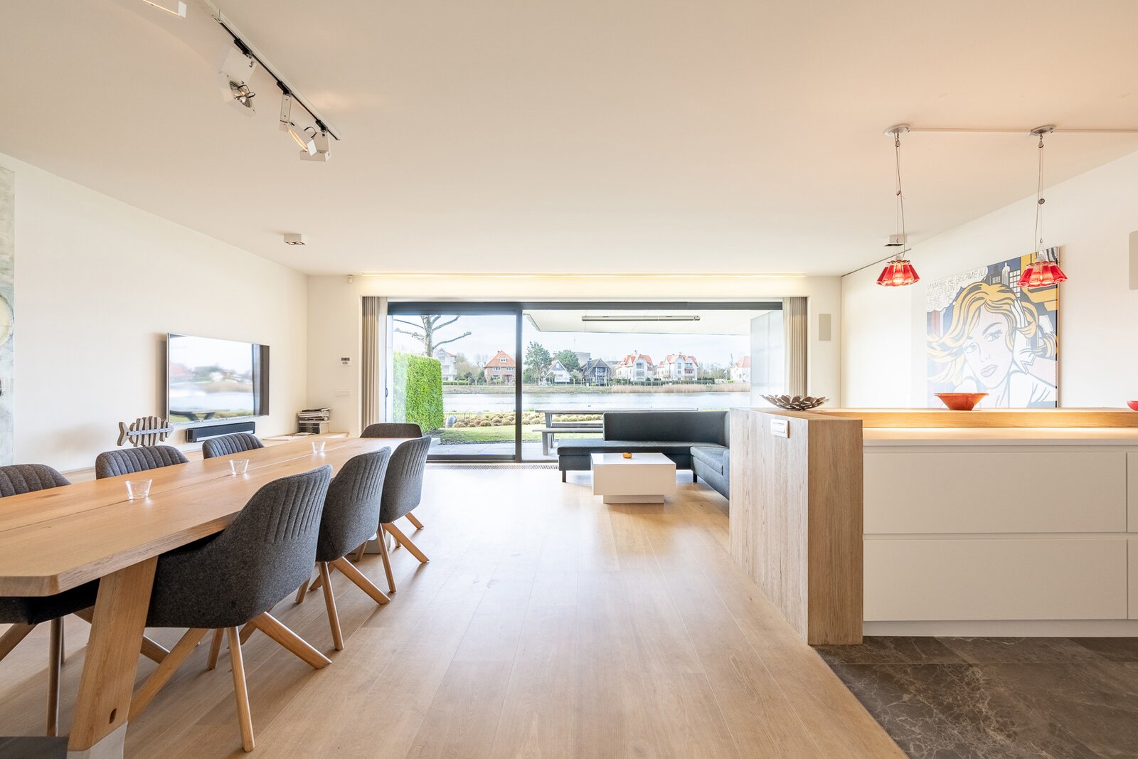 Ruime inkomhal met vestiaire en gastentoilet. Open, volledig uitgeruste leefkeuken met royale eetplaats en lichtrijke woonkamer, beide uitgevend op het meer. Aansluitend bevindt zich een groot overdekt terras met privatieve tuin, voorzien van verwarmingselementen voor optimaal comfort.