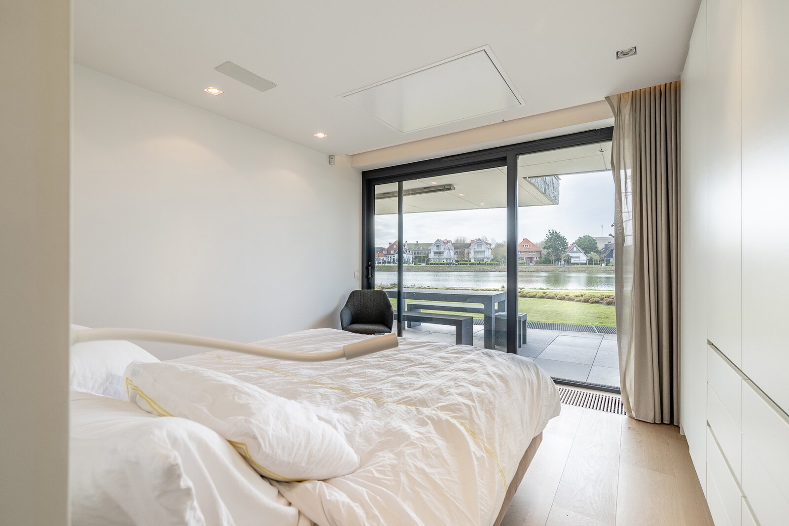 De master bedroom beschikt over een ensuite badkamer, en geeft uit op een privé zuidgericht terras met zicht op het meer.