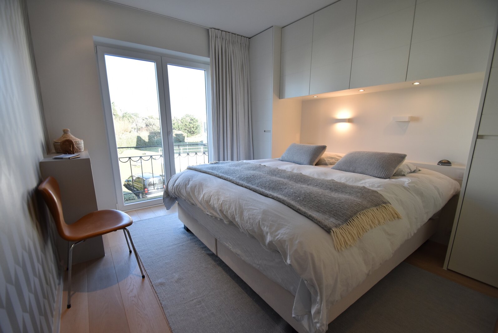 Het doorzon appartement heeft drie volwaardige slaapkamers. De hoofdslaapkamer beschikt over ingemaakte kasten en een ensuite badkamer met dubbele lavabo, bad en toilet. De twee overige slaapkamers beschikken eveneens over ingemaakte kasten en hebben elk een eigen douchekamer. Berging met aansluiting voor wasmachine en droogkast.